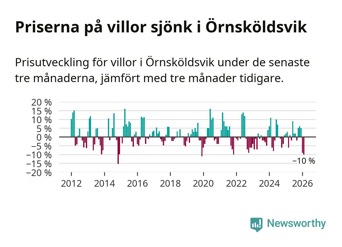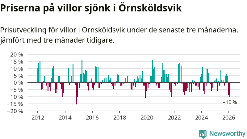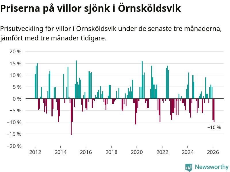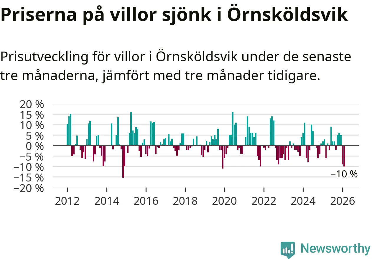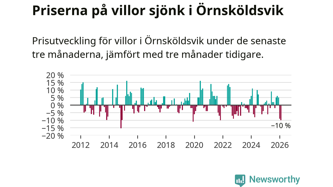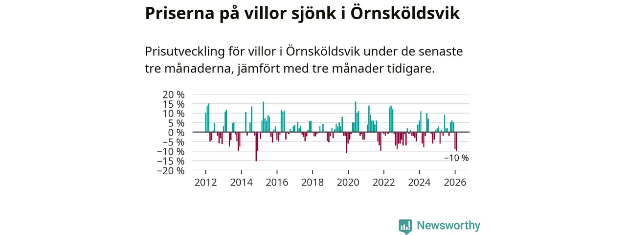 Villapriserna sjönk med tio procent i Örnsköldsviks kommun under de senaste tre månaderna. Det är den svagaste prisutvecklingen sedan 2021.