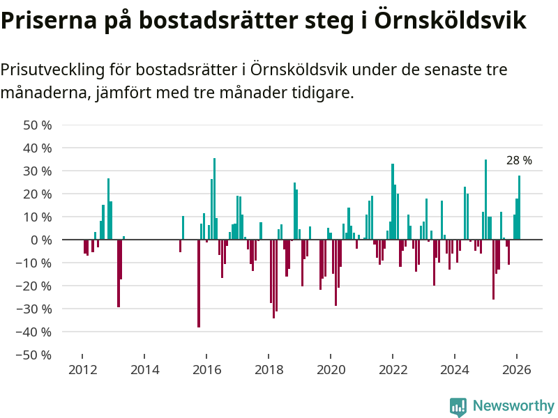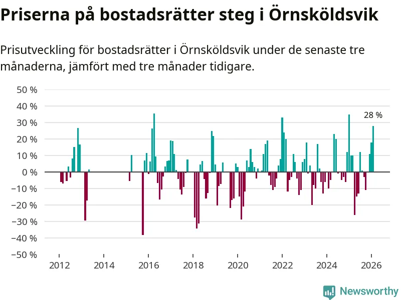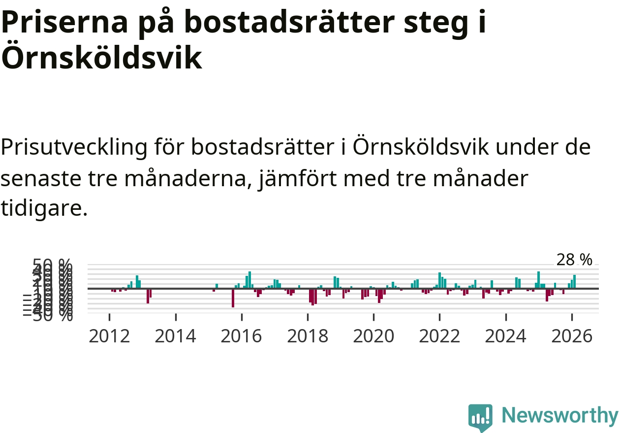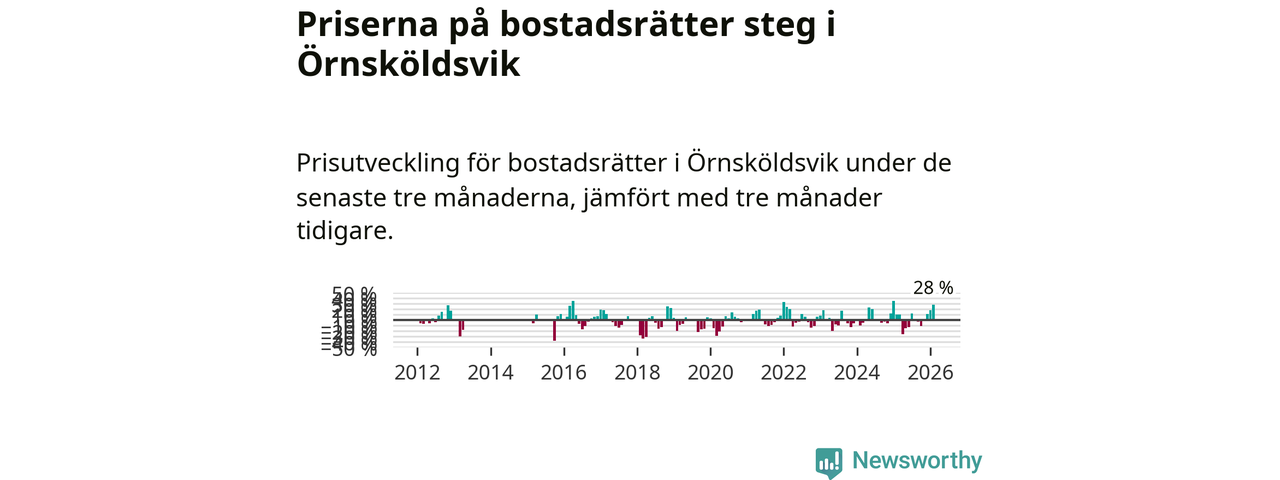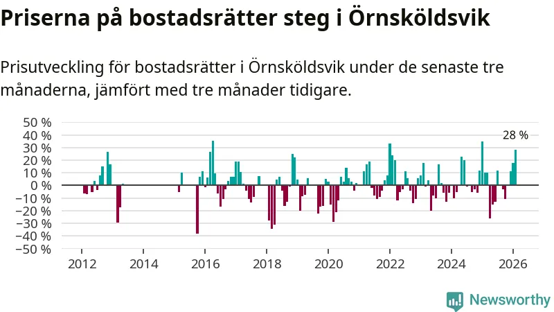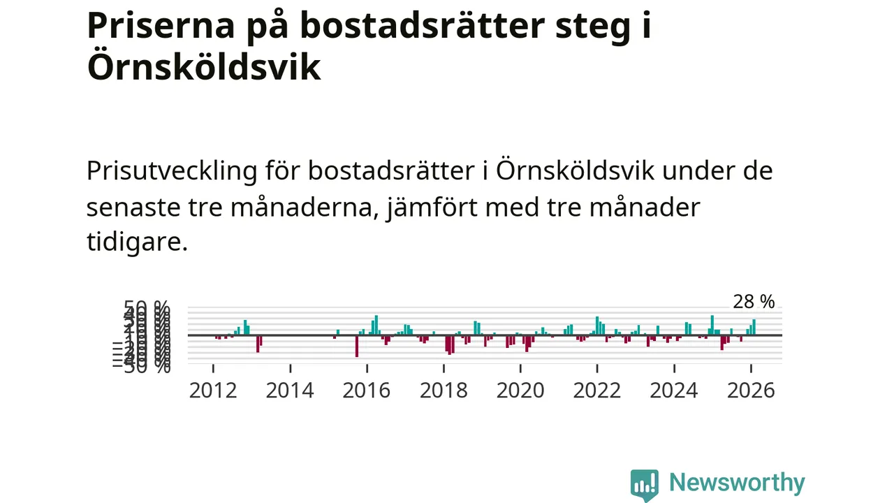 Priserna på bostadsrätter steg mellan december och februari med 28 procent i Örnsköldsviks kommun. Det är en betydande uppgång jämfört med det gångna året då priserna i snitt ökat med 1 procent.