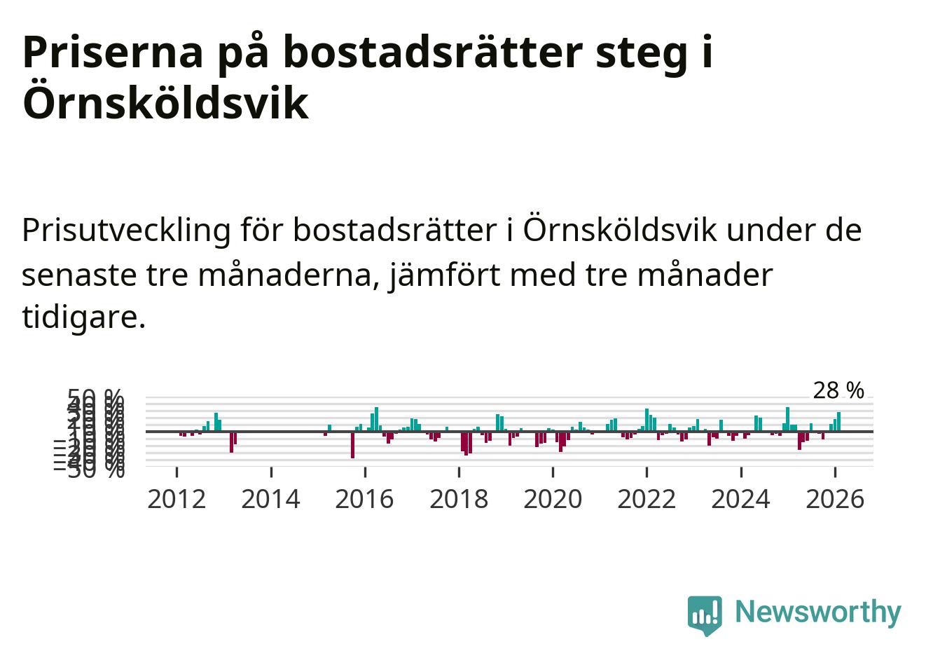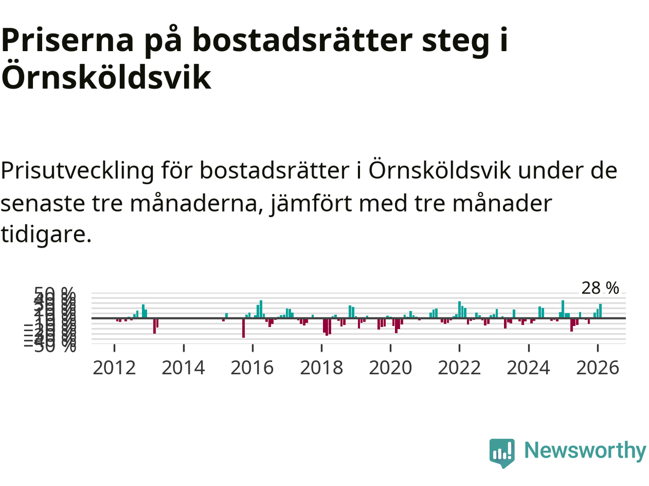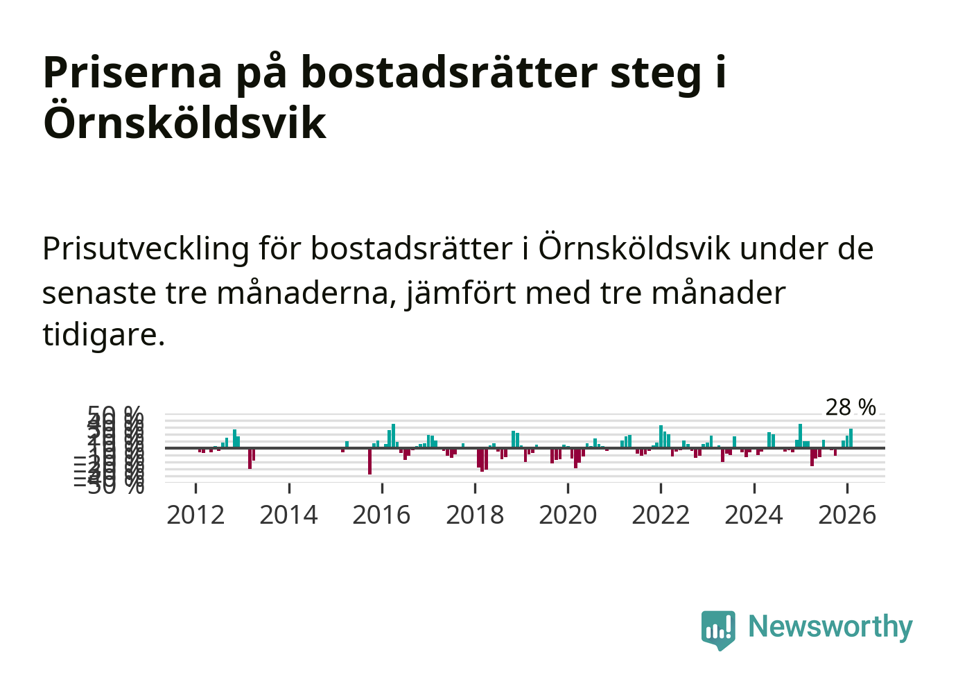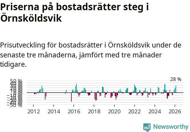 Priserna på bostadsrätter steg mellan december och februari med 28 procent i Örnsköldsviks kommun. Det är en betydande uppgång jämfört med det gångna året då priserna i snitt ökat med 1 procent.