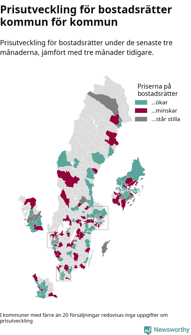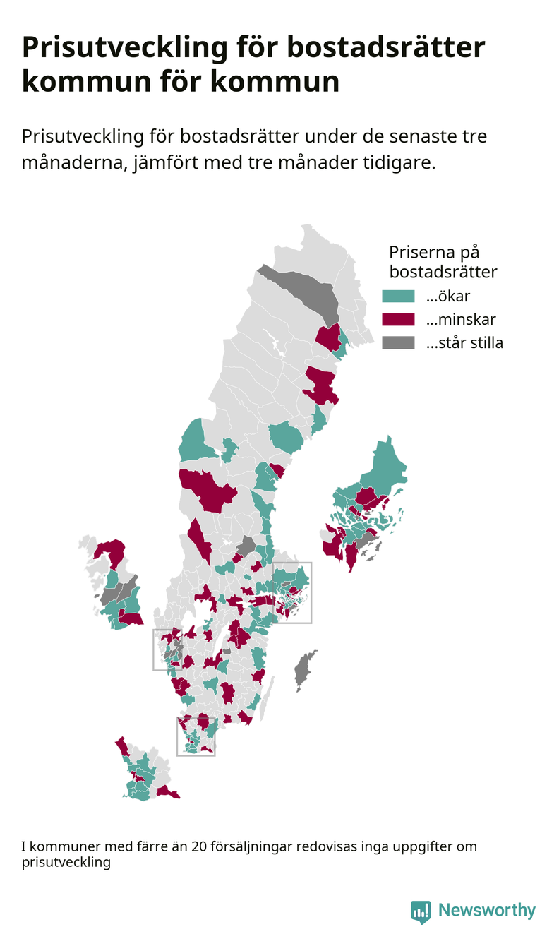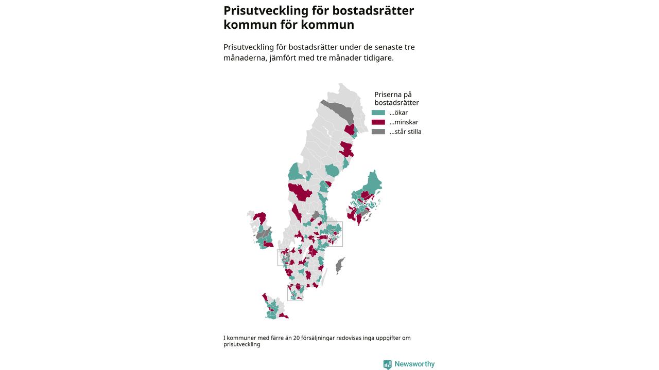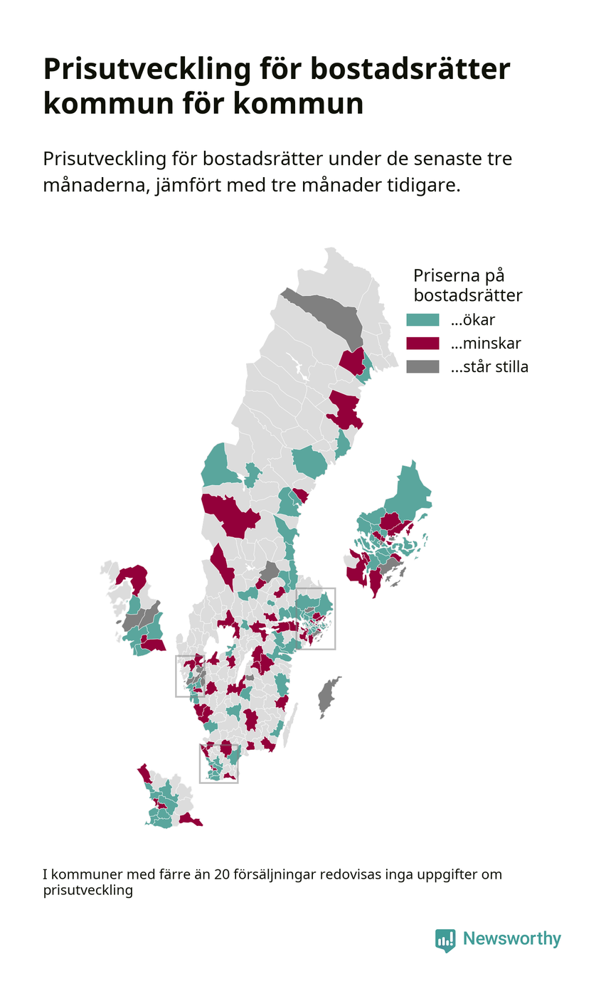 Priserna på bostadsrätter stiger i 55 av landets kommuner, medan de sjunker i 47 (i merparten av de resterande kommunerna redovisas inga prisförändringsuppgifter på grund av få försäljningar). Kartan nedan visar den geografiska spridningen.