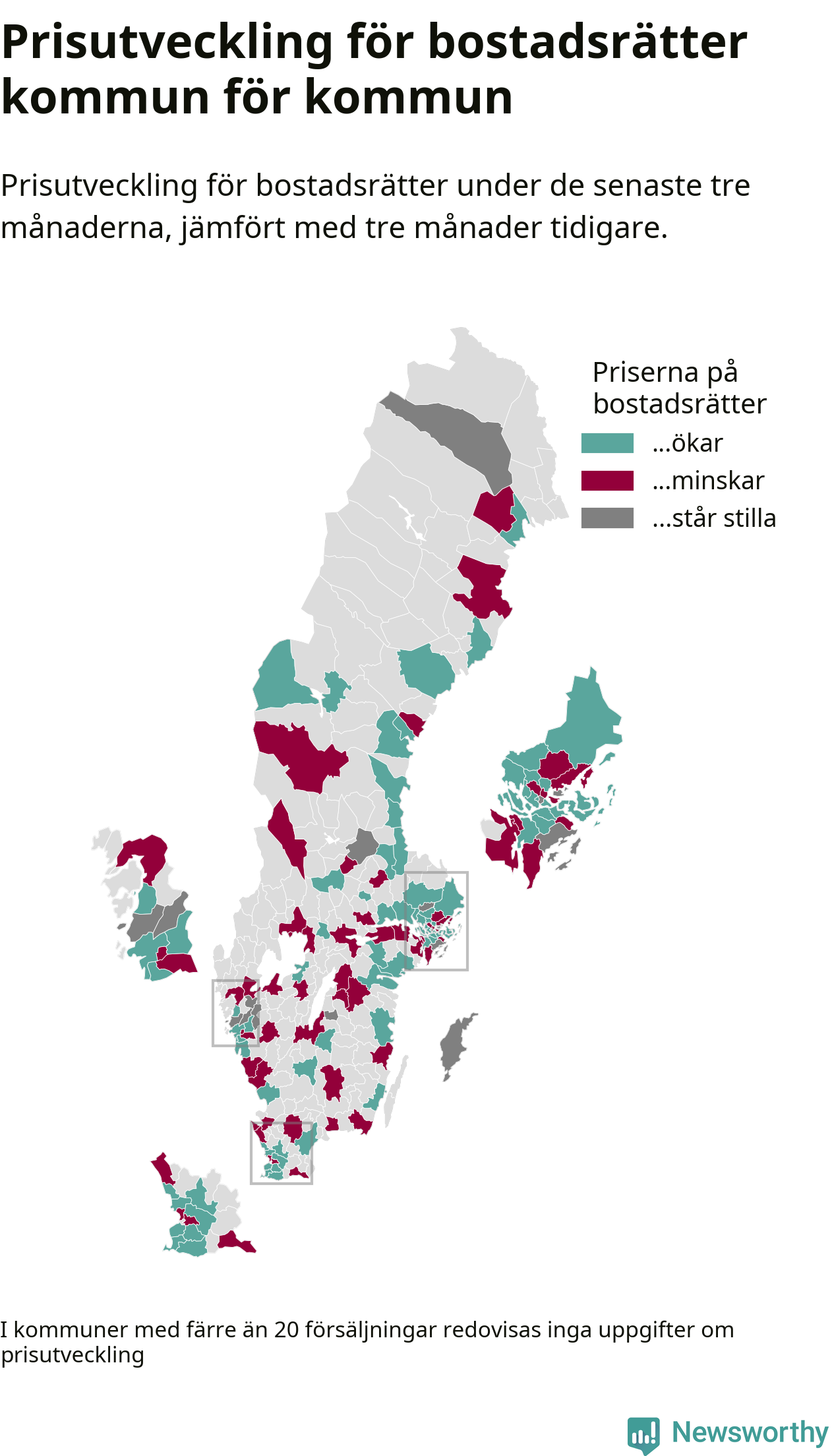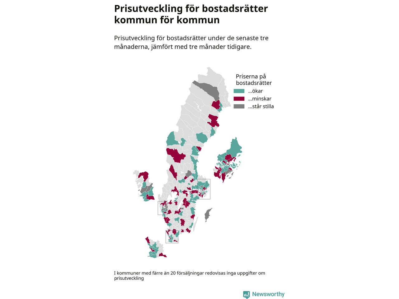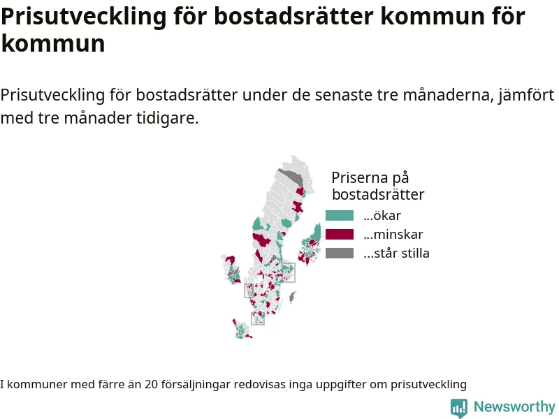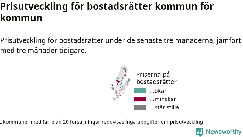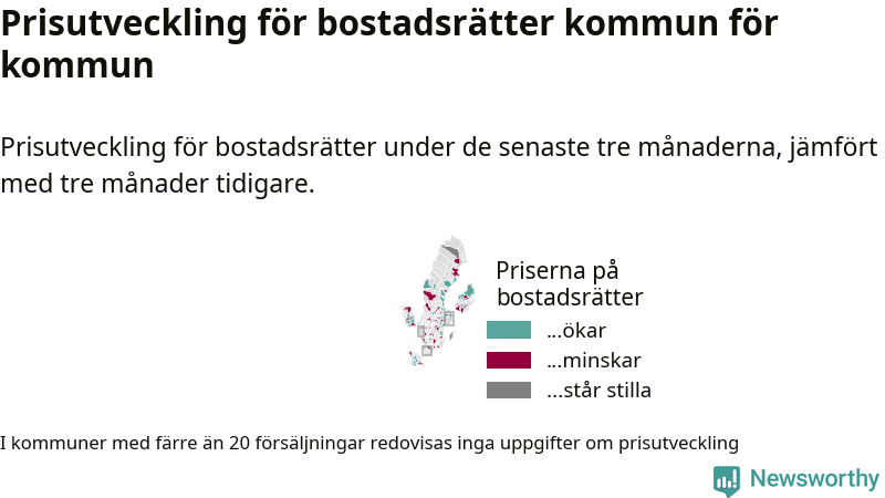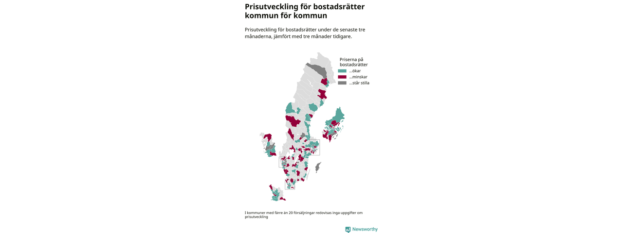 Priserna på bostadsrätter stiger i 55 av landets kommuner, medan de sjunker i 47 (i merparten av de resterande kommunerna redovisas inga prisförändringsuppgifter på grund av få försäljningar). Kartan nedan visar den geografiska spridningen.