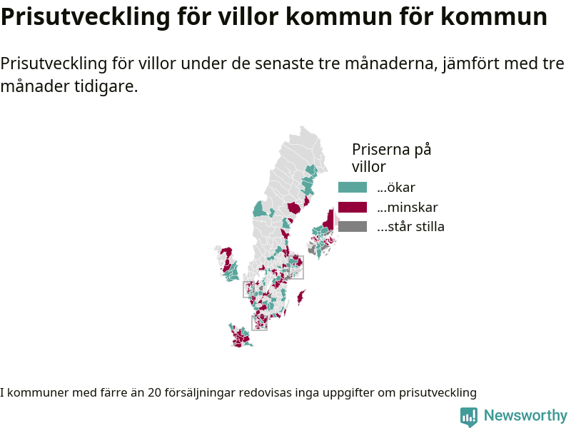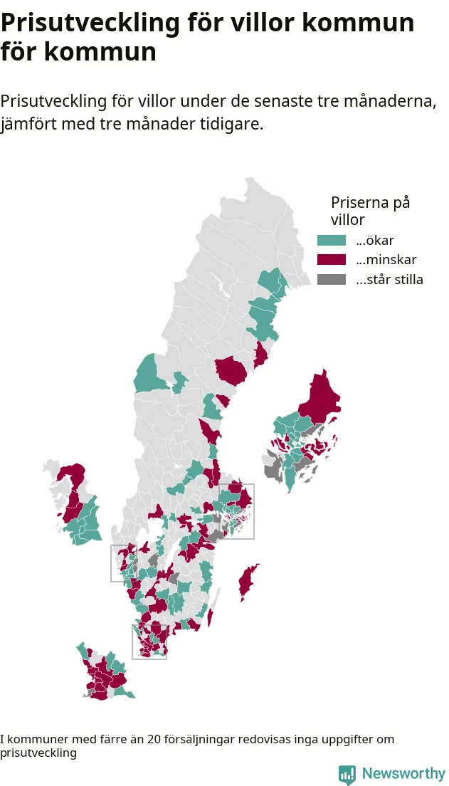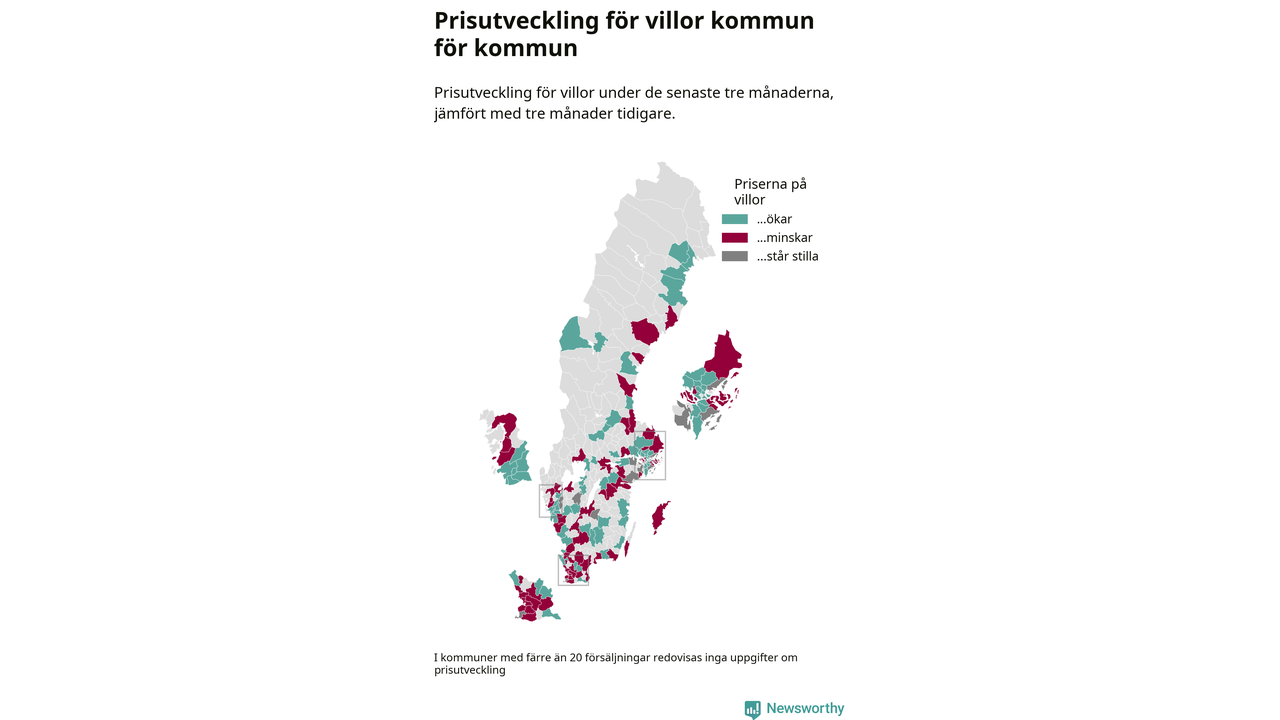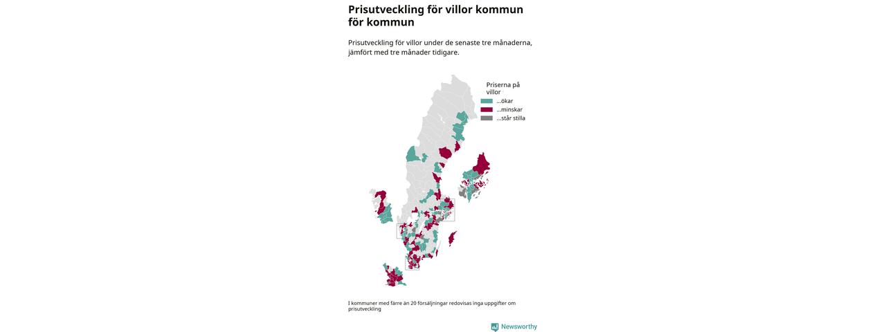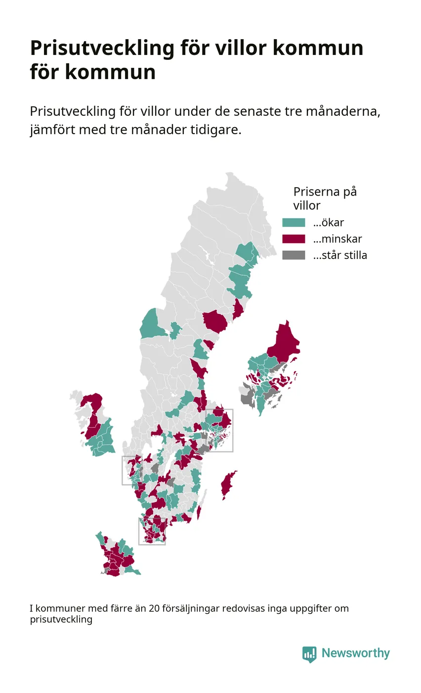 Priserna på villor stiger i 61 av landets kommuner, medan de sjunker i 55 (i merparten av de resterande kommunerna redovisas inga prisförändringsuppgifter på grund av få försäljningar). Nedanstående karta visar den geografiska spridningen.