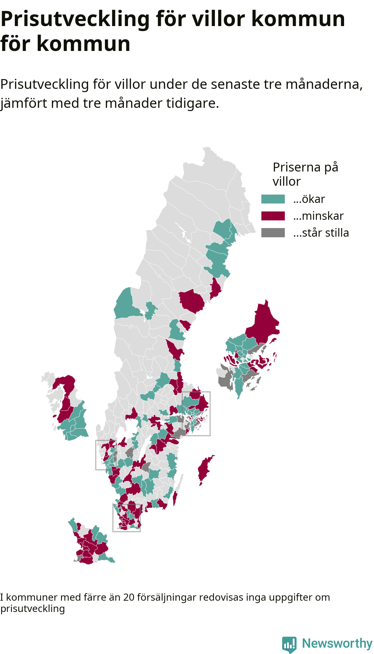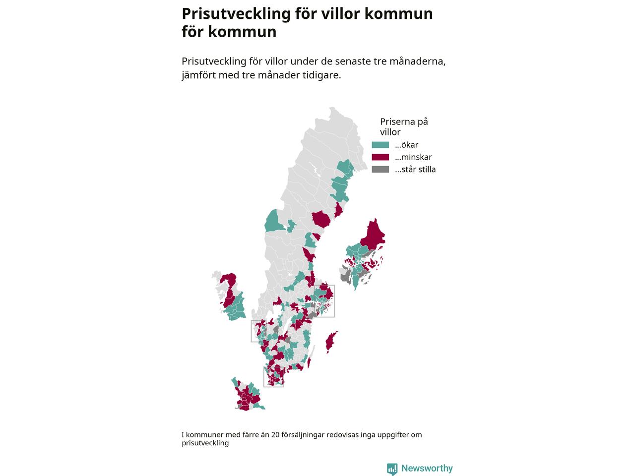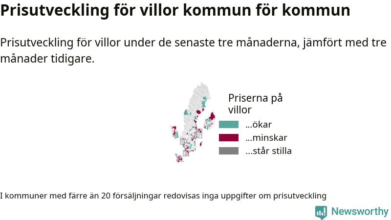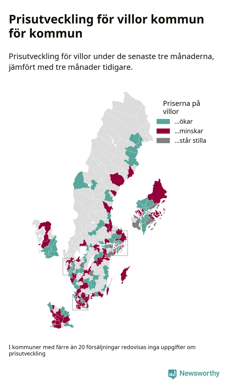 Priserna på villor stiger i 61 av landets kommuner, medan de sjunker i 55 (i merparten av de resterande kommunerna redovisas inga prisförändringsuppgifter på grund av få försäljningar). Nedanstående karta visar den geografiska spridningen.