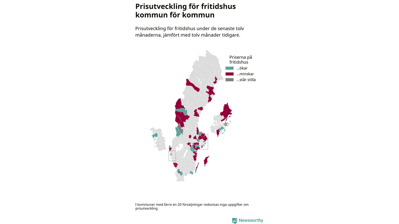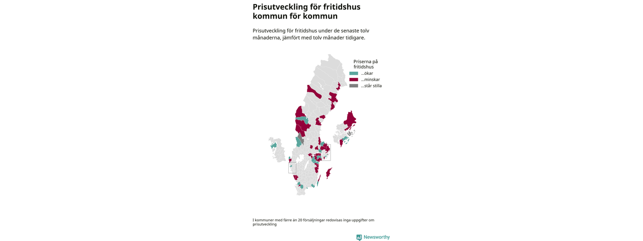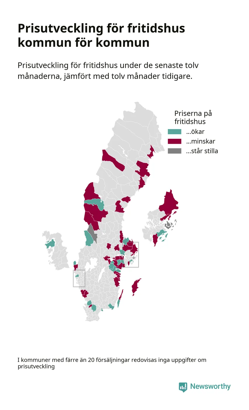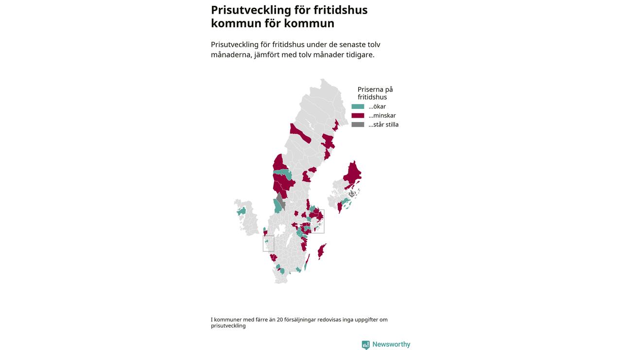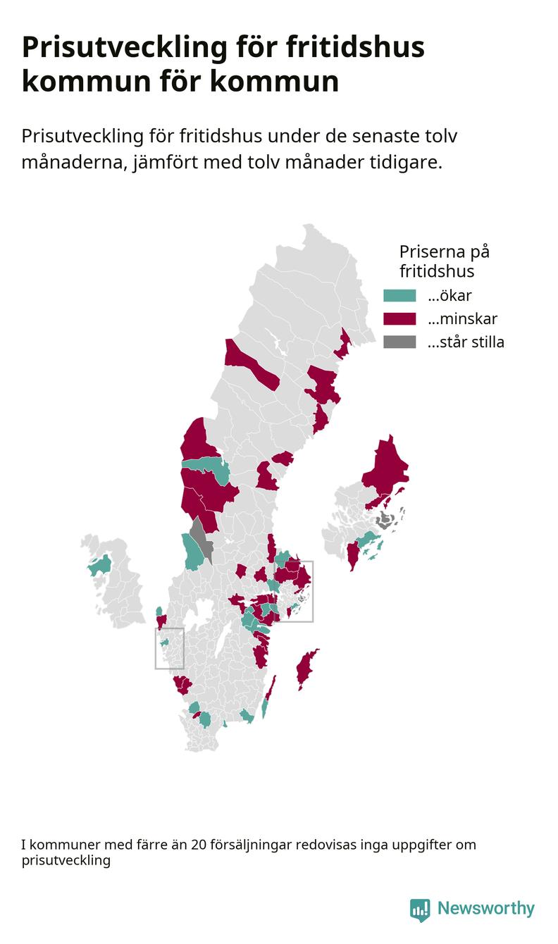 Priserna på fritidshus sjunker i 31 av landets kommuner, medan de stiger i 17 (i merparten av de resterande kommunerna redovisas inga prisförändringsuppgifter på grund av få försäljningar). Nedanstående karta visar den geografiska spridningen.