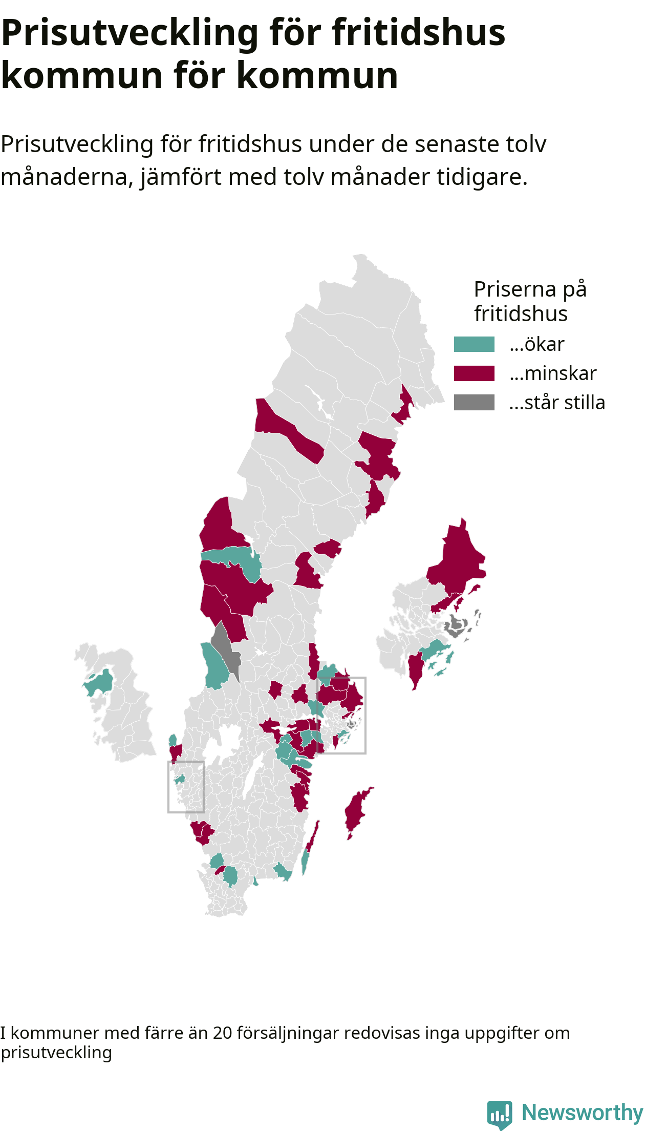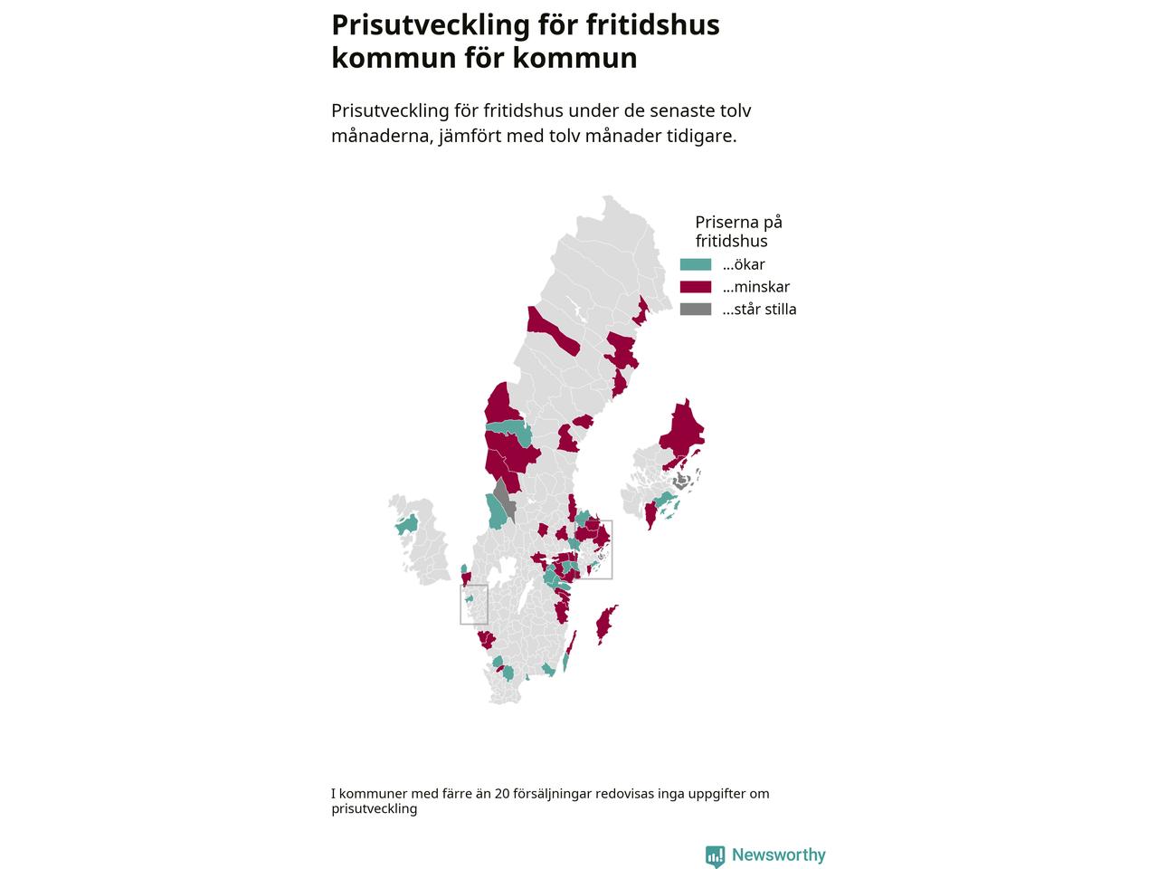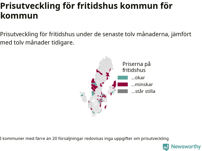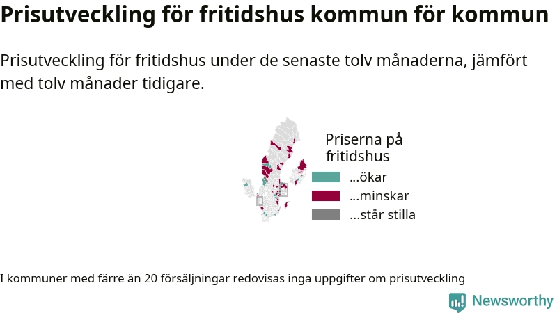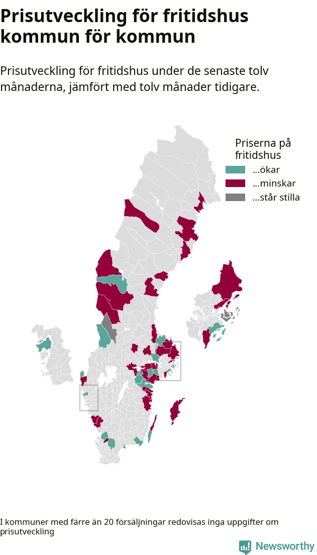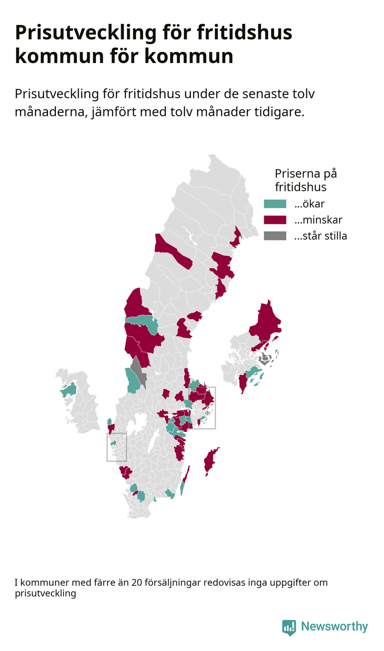 Priserna på fritidshus sjunker i 31 av landets kommuner, medan de stiger i 17 (i merparten av de resterande kommunerna redovisas inga prisförändringsuppgifter på grund av få försäljningar). Nedanstående karta visar den geografiska spridningen.