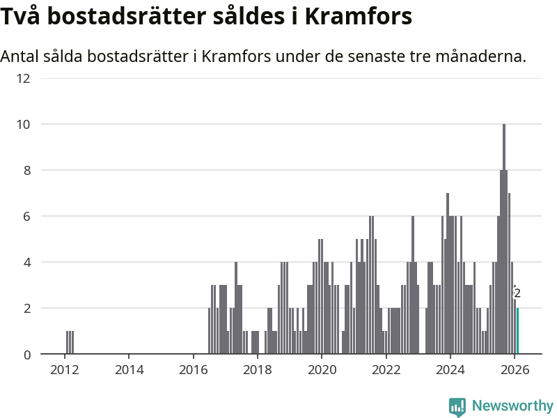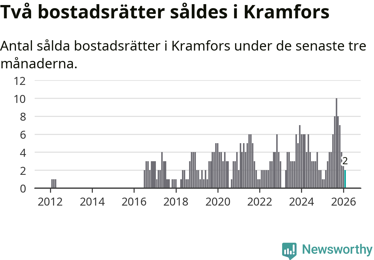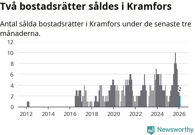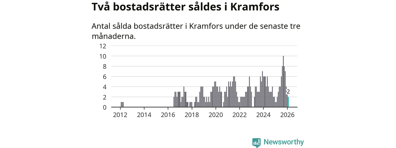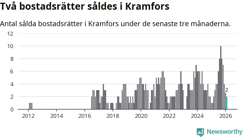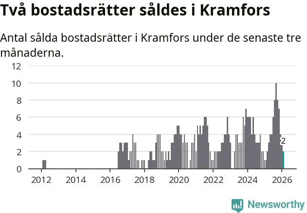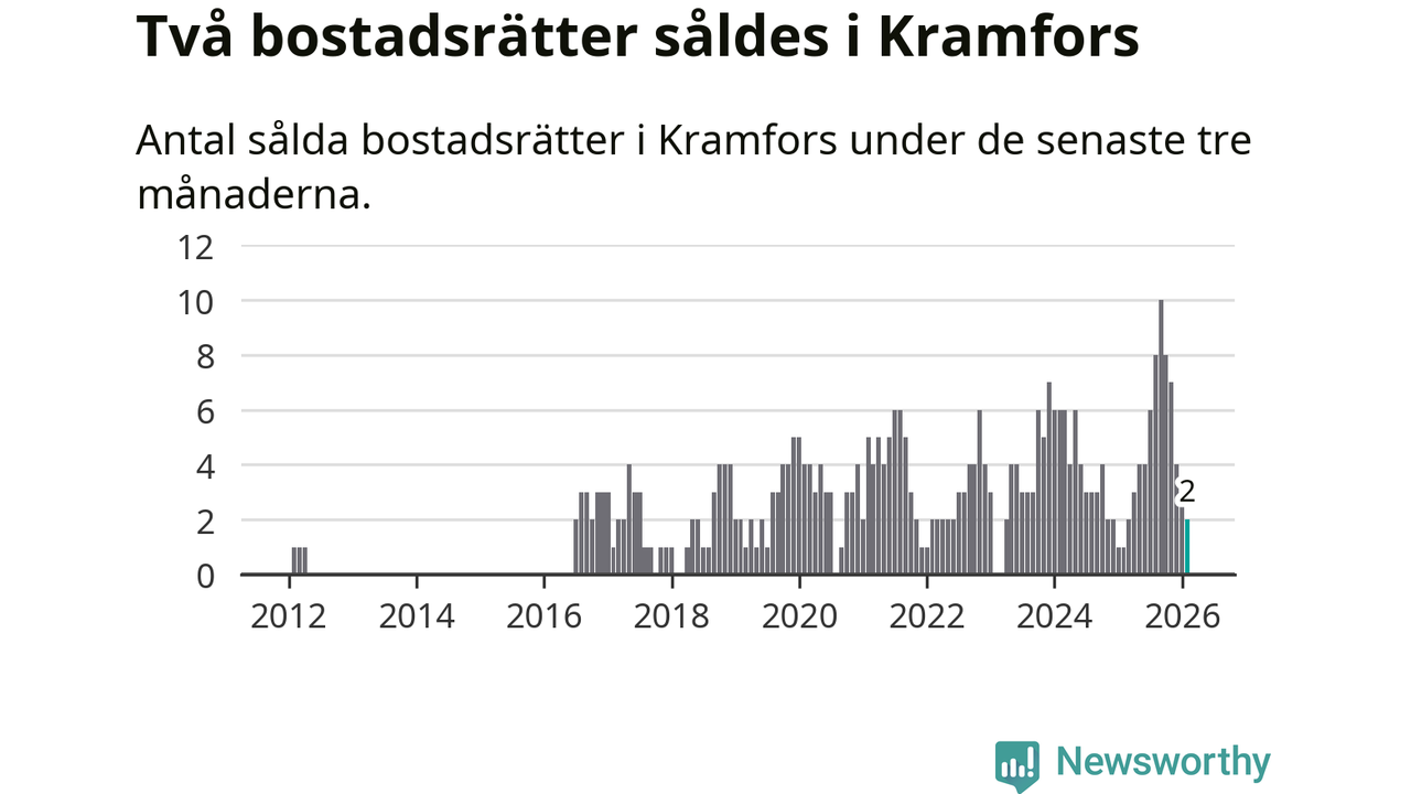 Mellan december och februari gjordes sammanlagt två affärer med bostadsrätter i Kramfors kommun. Det kan jämföras med ett vid motsvarande tid i fjol.