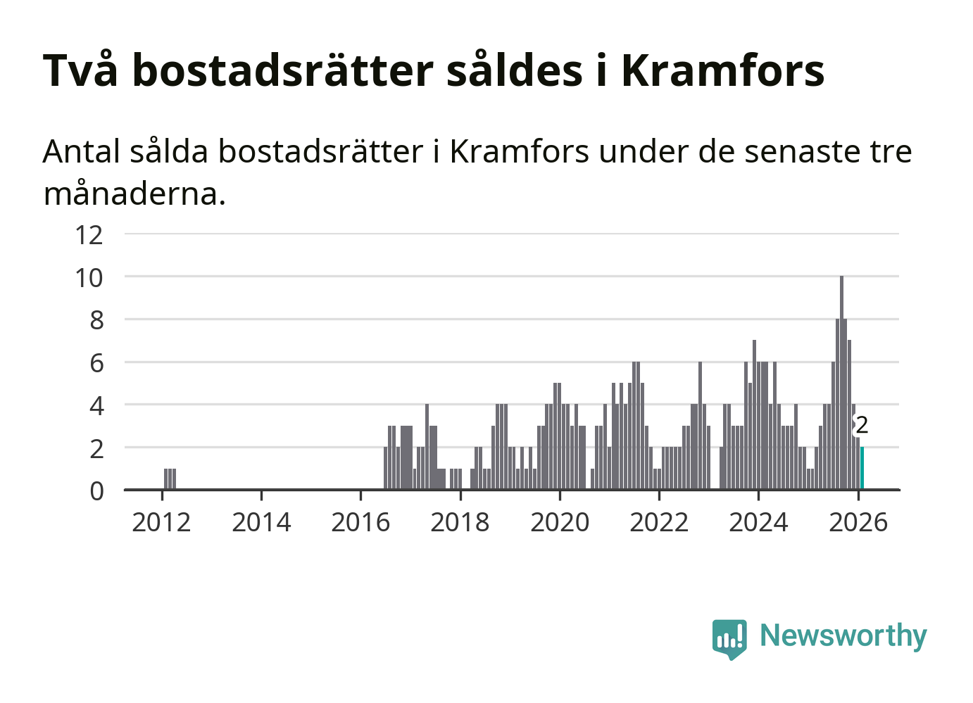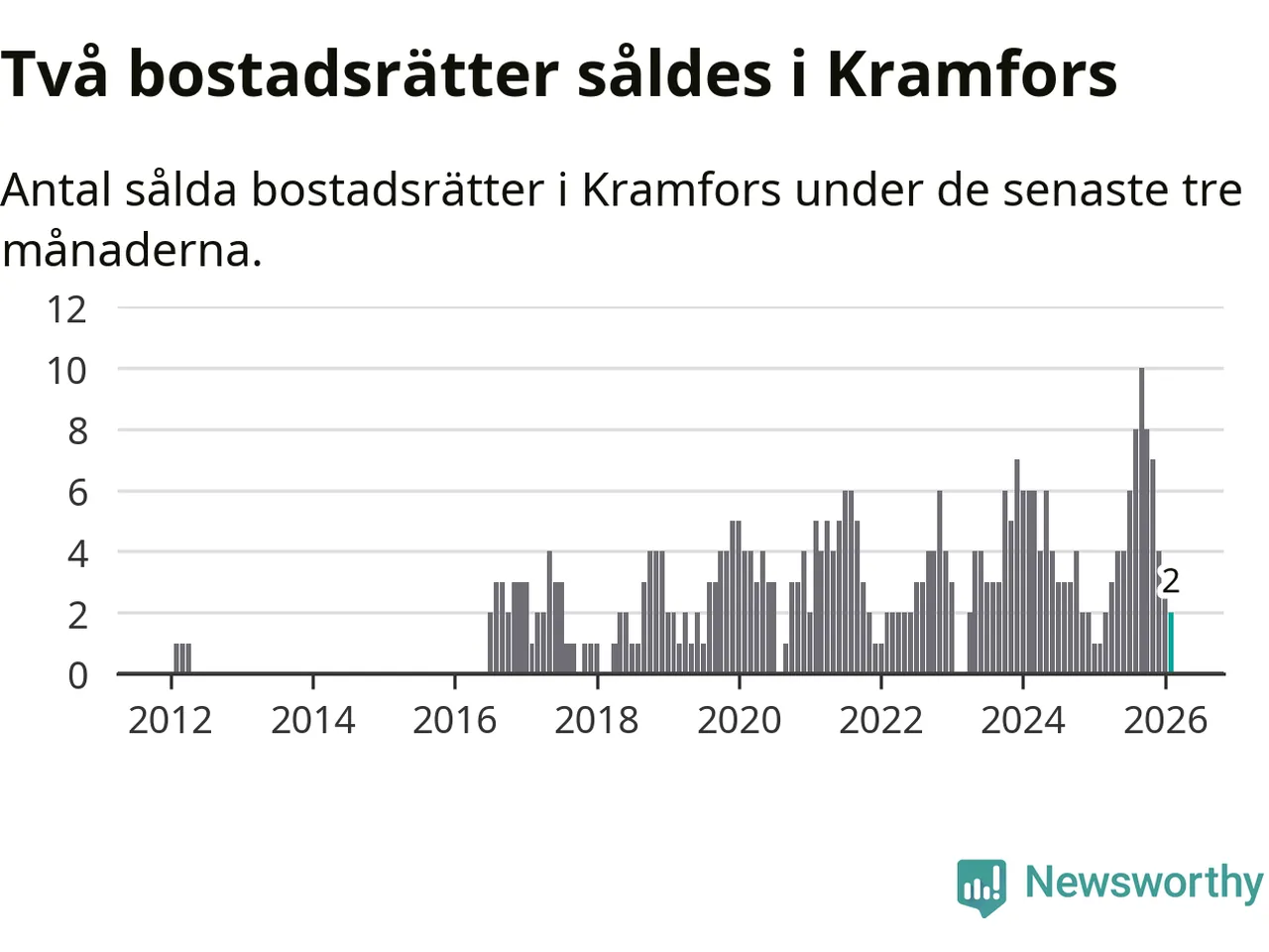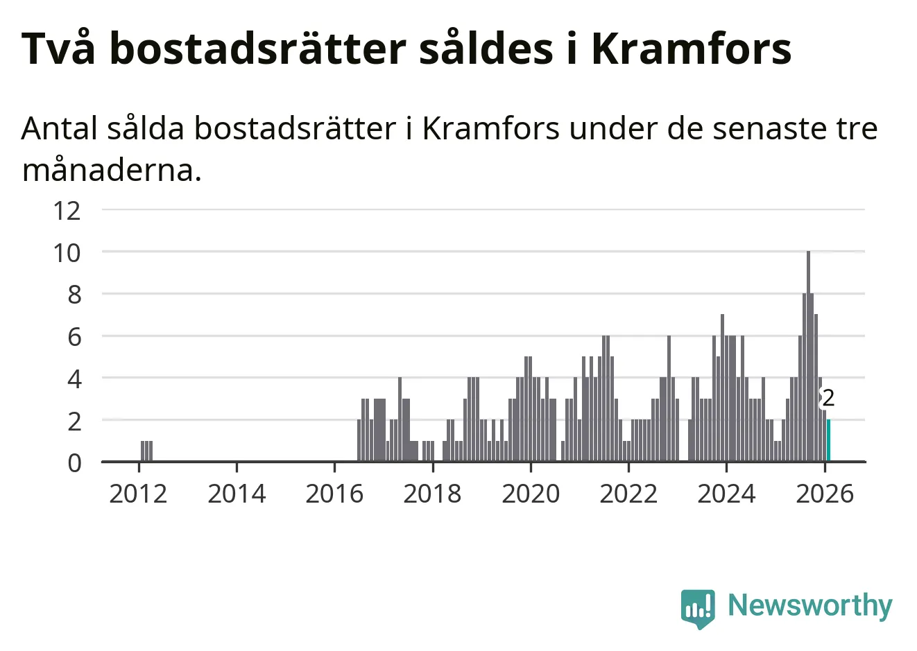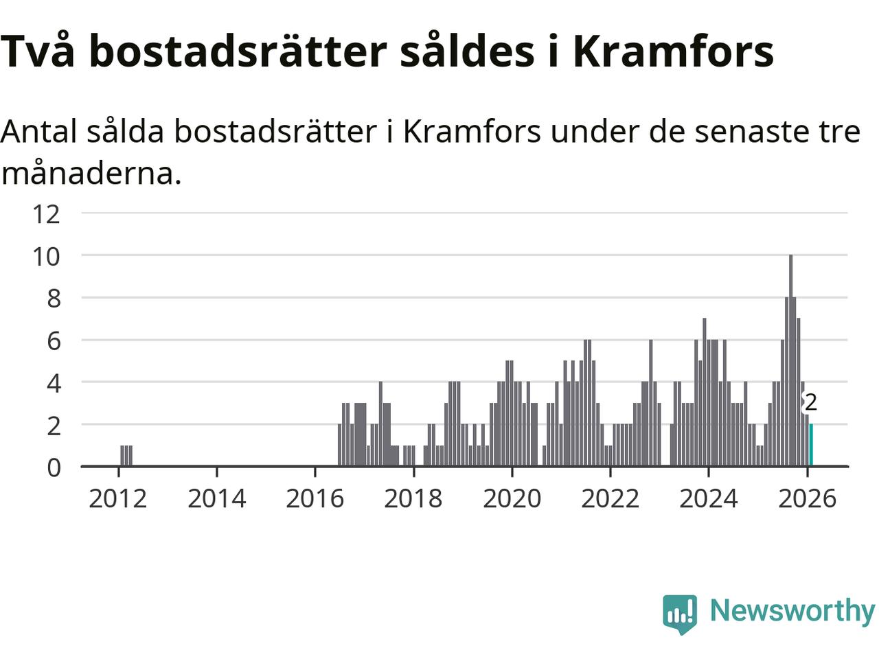 Mellan december och februari gjordes sammanlagt två affärer med bostadsrätter i Kramfors kommun. Det kan jämföras med ett vid motsvarande tid i fjol.