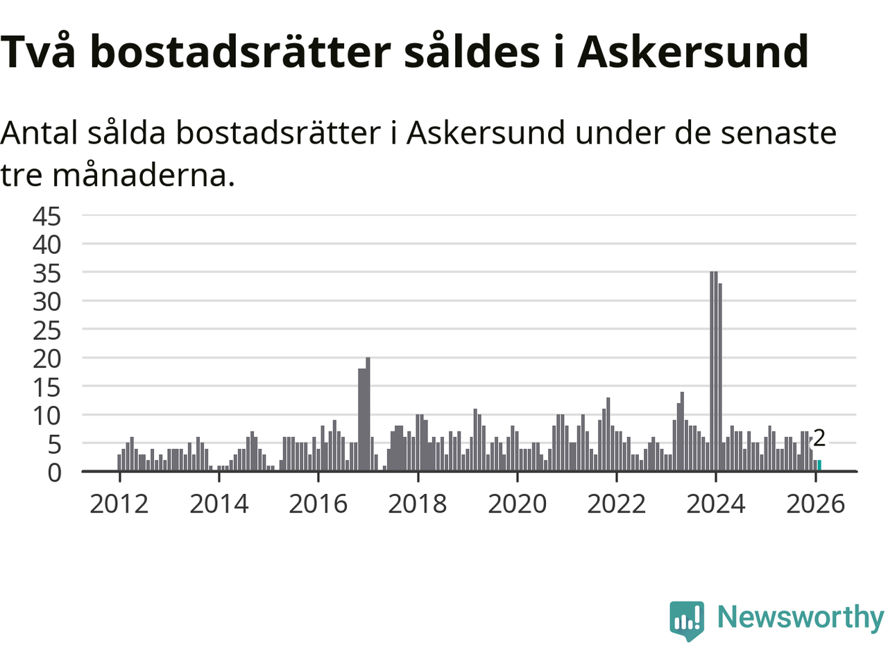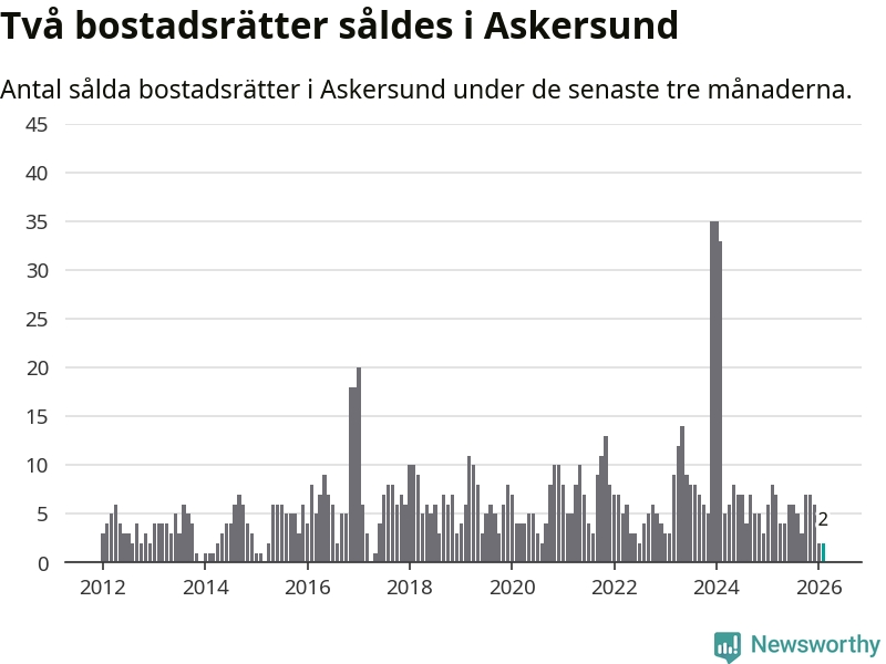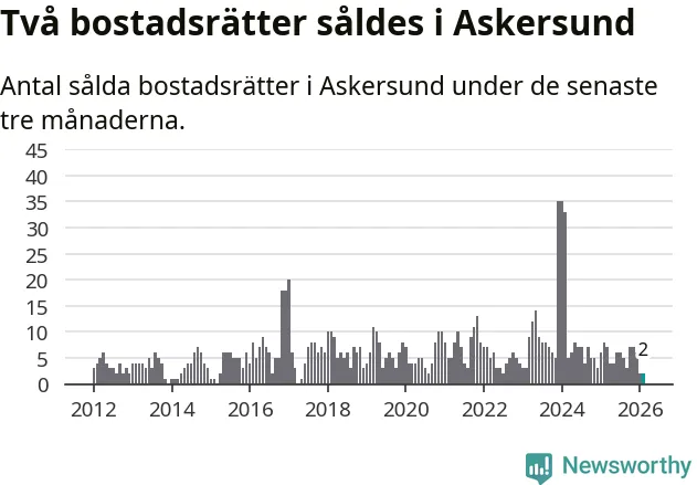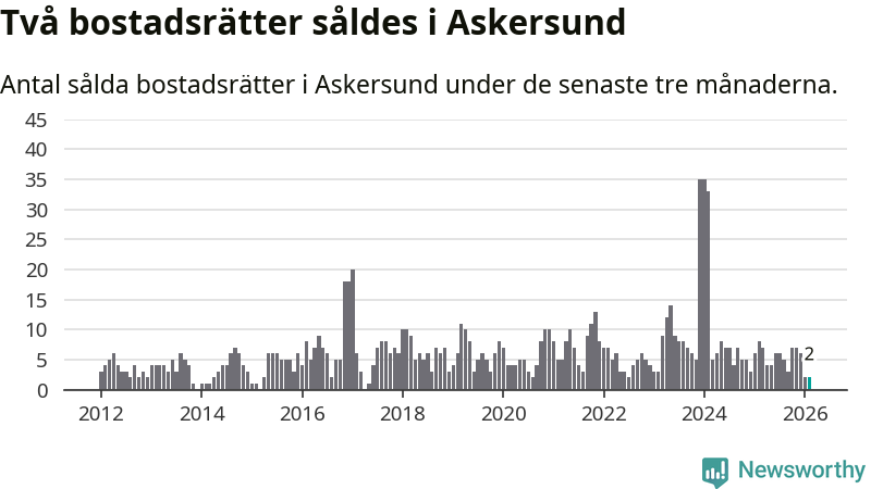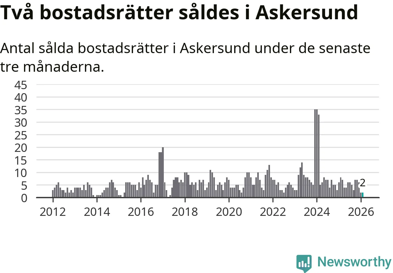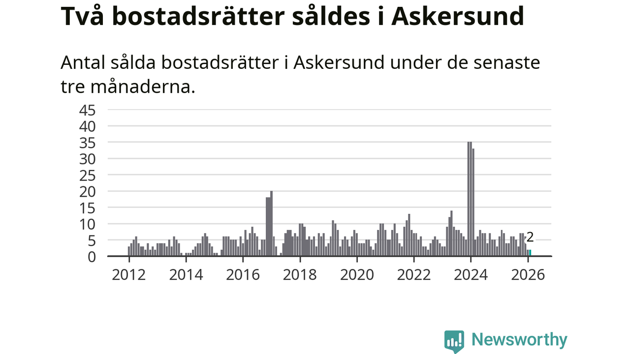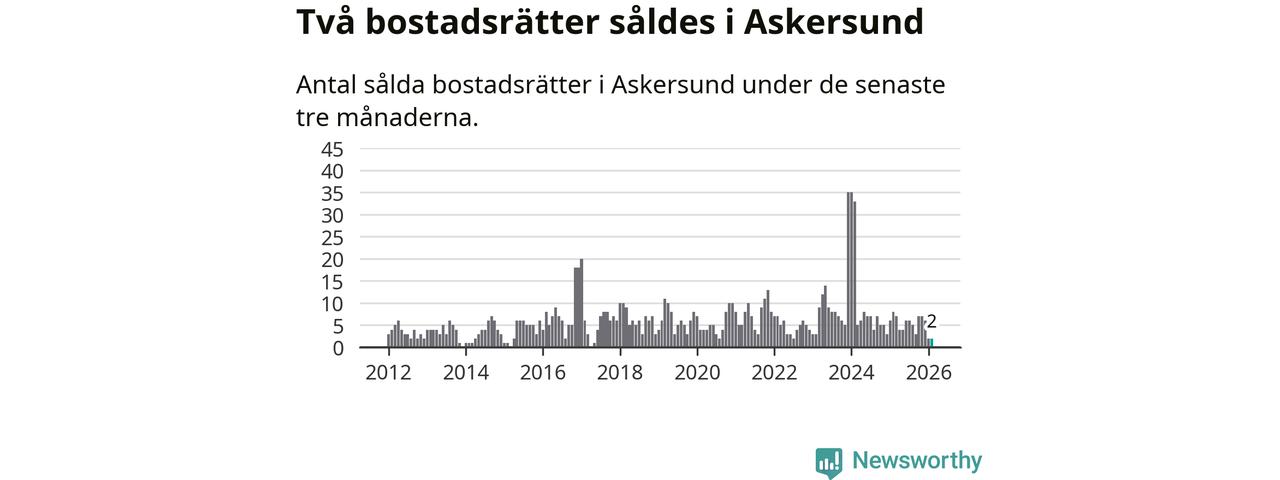 Mellan december och februari gjordes sammanlagt två affärer med bostadsrätter i Askersunds kommun. Det kan jämföras med åtta vid motsvarande tid i fjol.