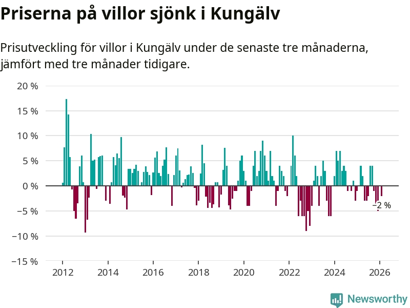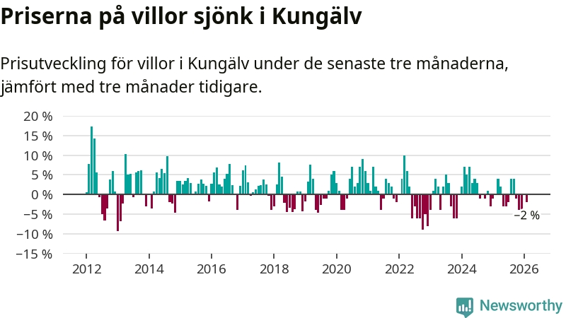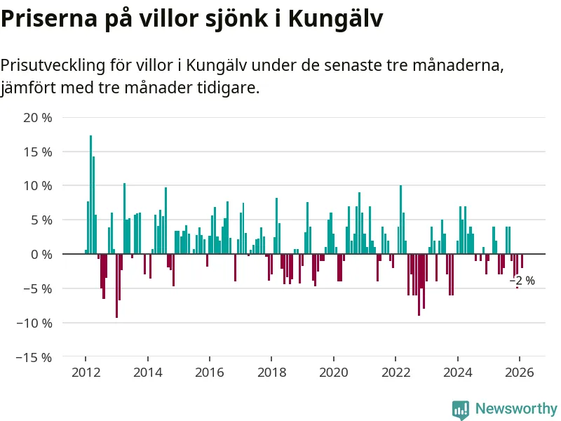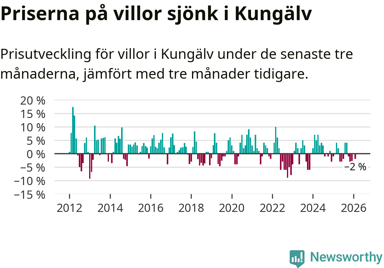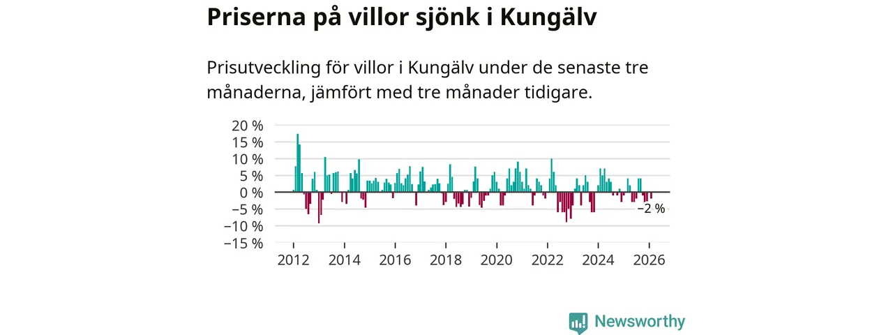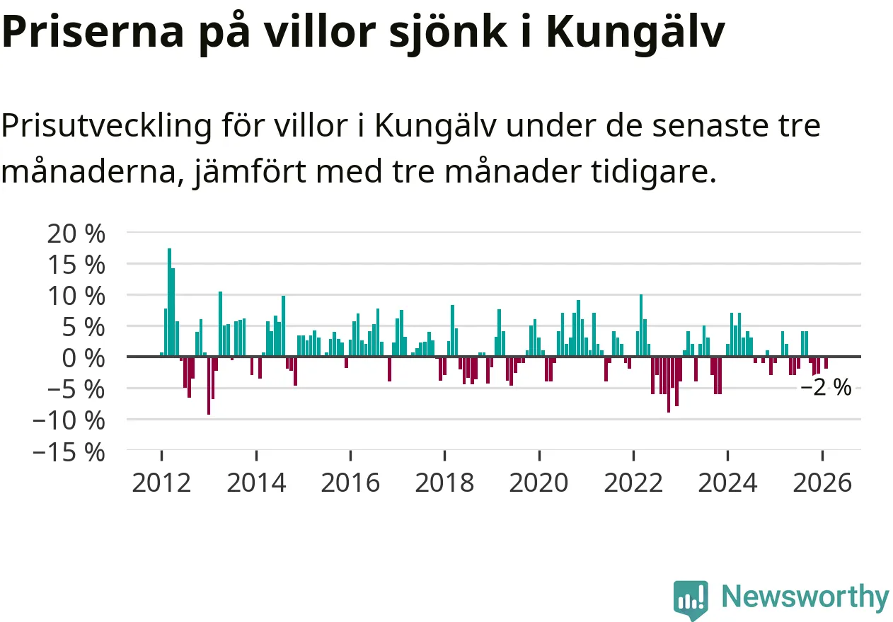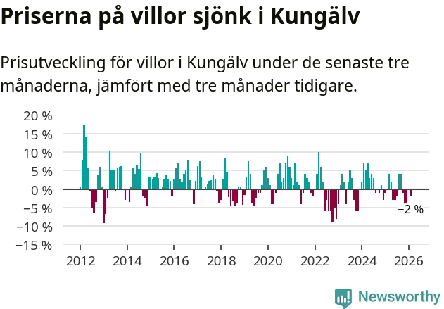Villapriserna har gått ner i Kungälvs kommun. Medelpriset på försäljningarna under de senaste tre månaderna visar på en nedgång med 2 procent.