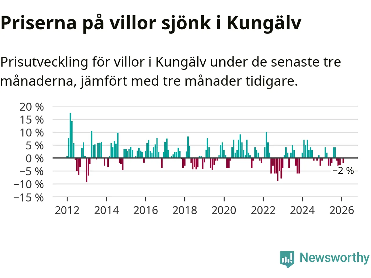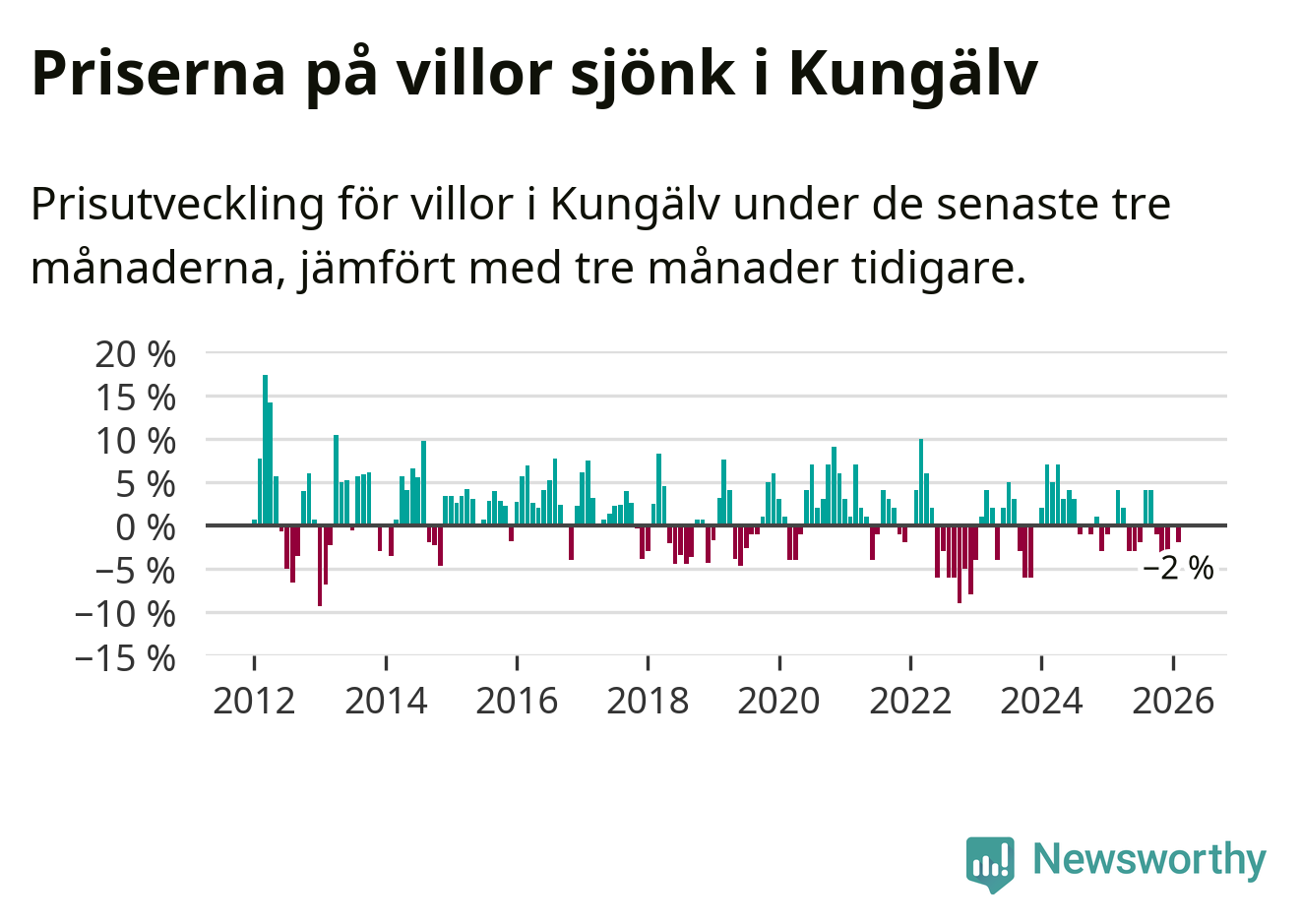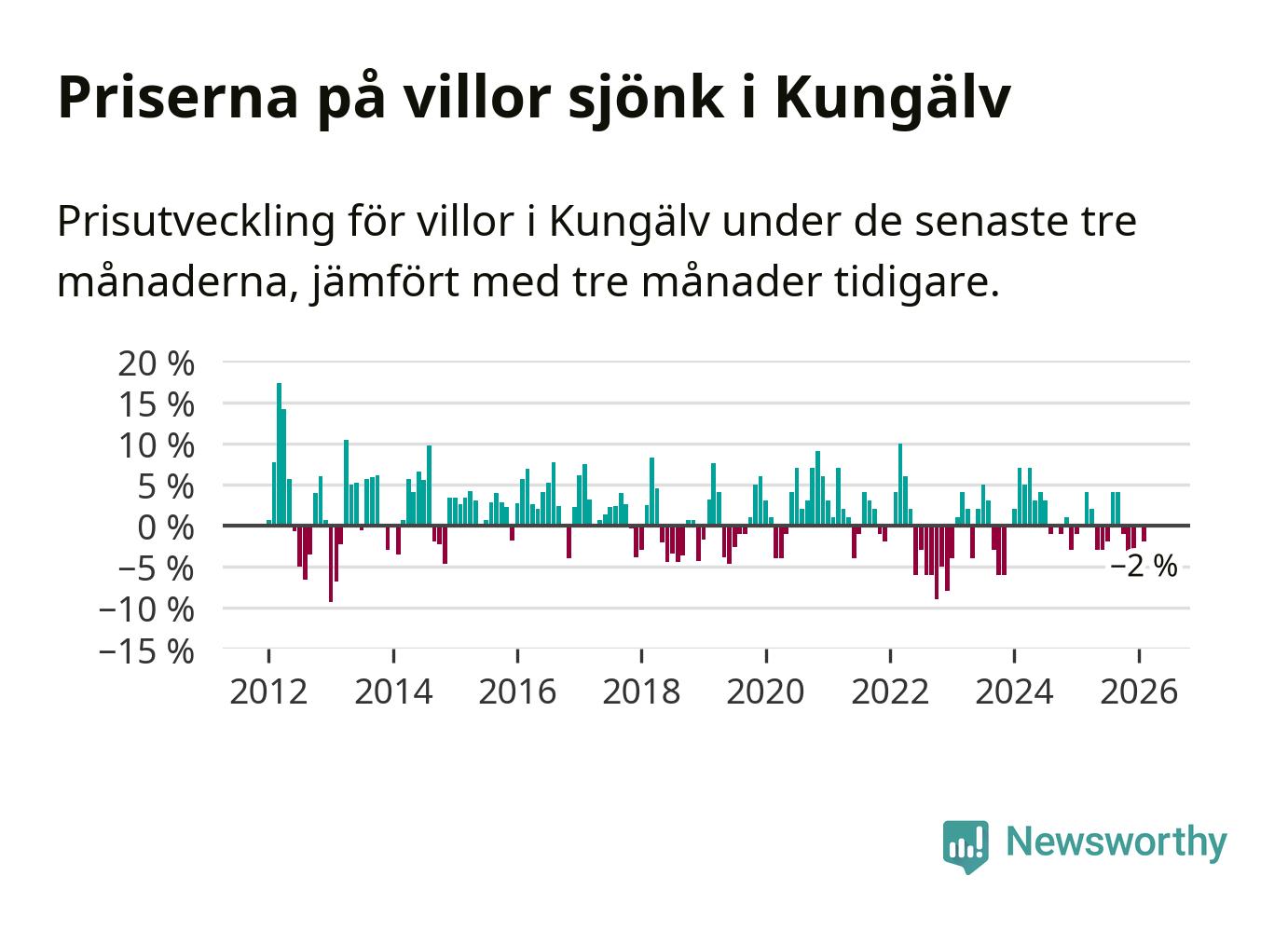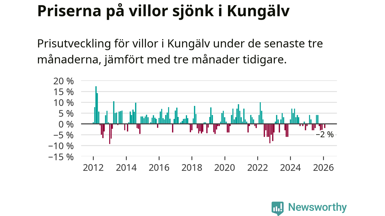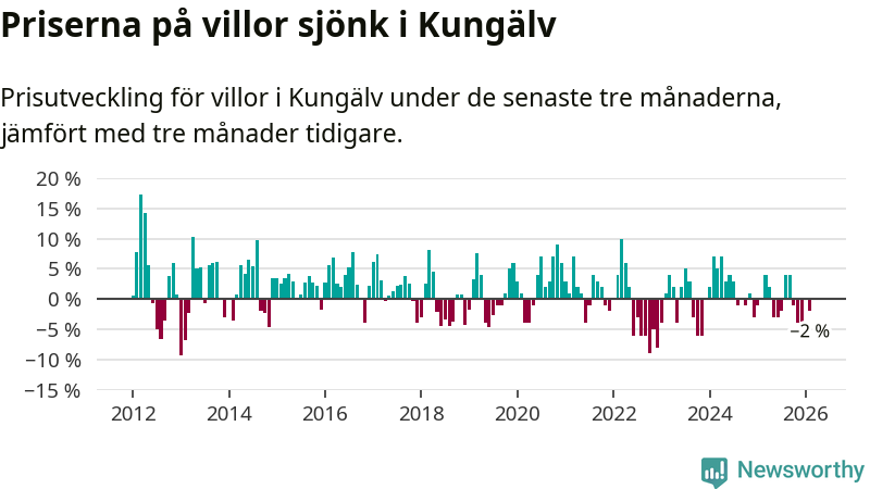 Villapriserna har gått ner i Kungälvs kommun. Medelpriset på försäljningarna under de senaste tre månaderna visar på en nedgång med 2 procent.