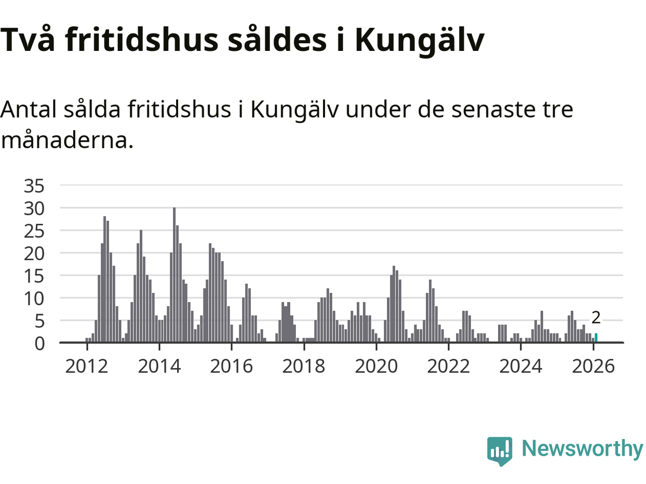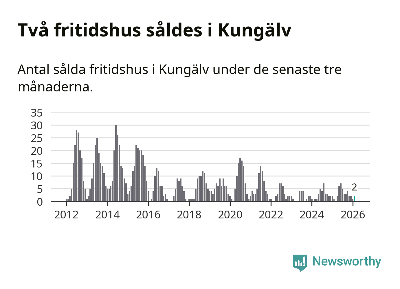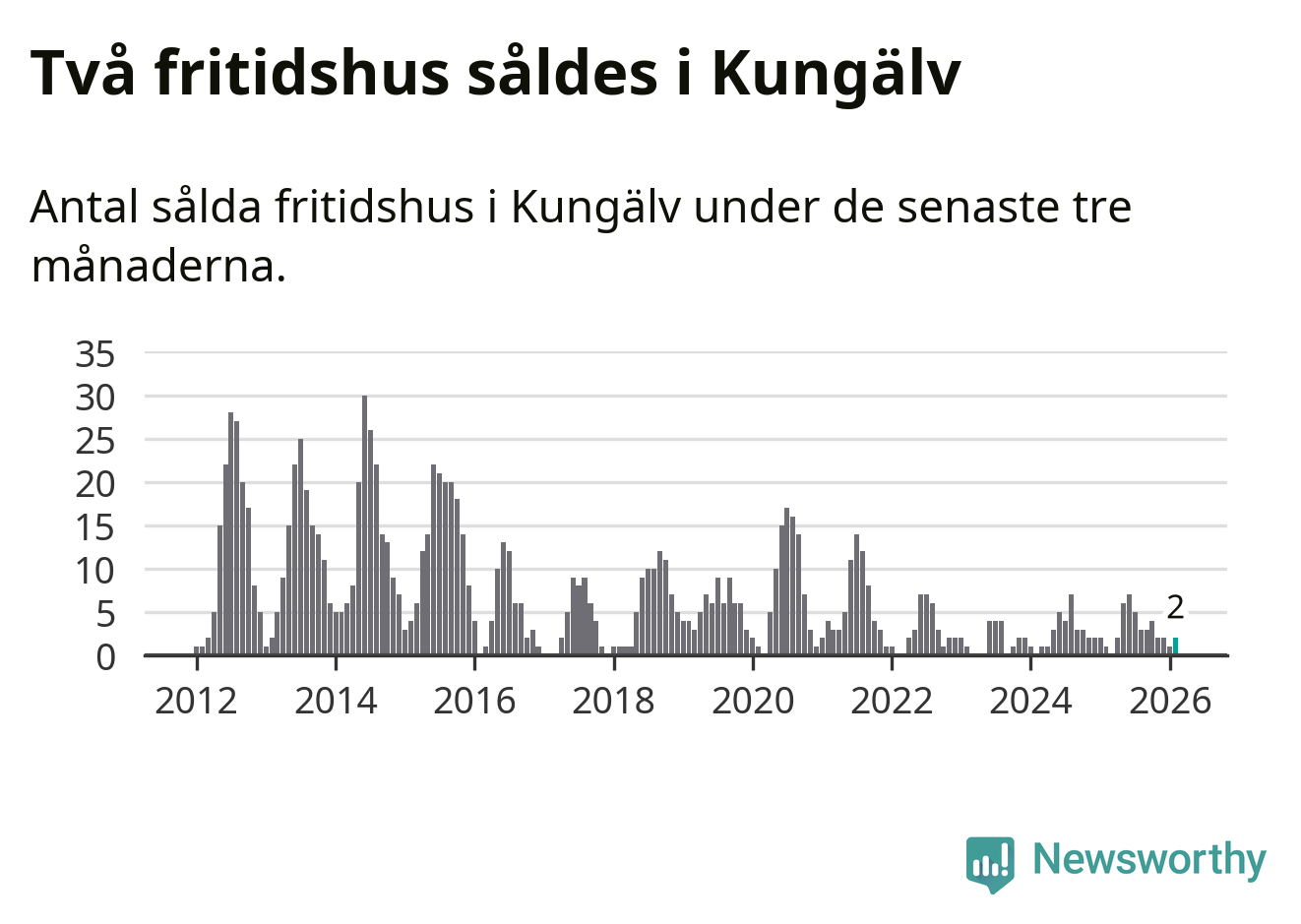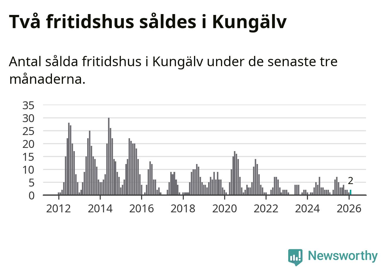 Mellan december och februari gjordes sammanlagt två affärer med fritidshus i Kungälvs kommun. Det kan jämföras med ett vid motsvarande tid i fjol.