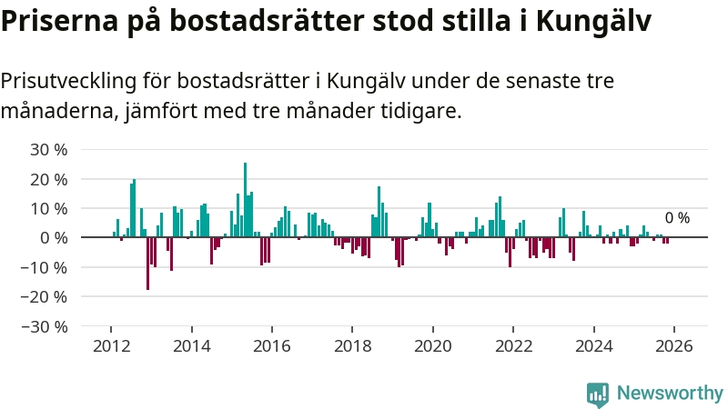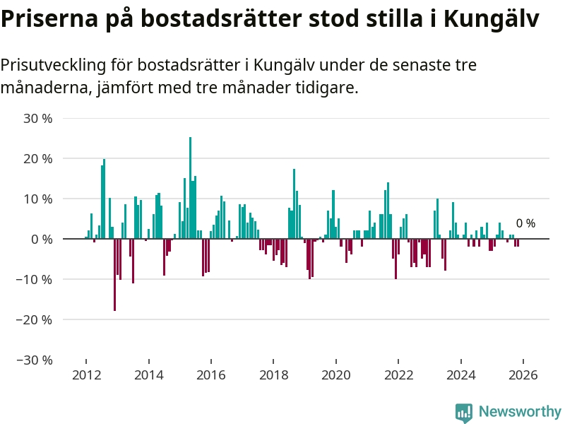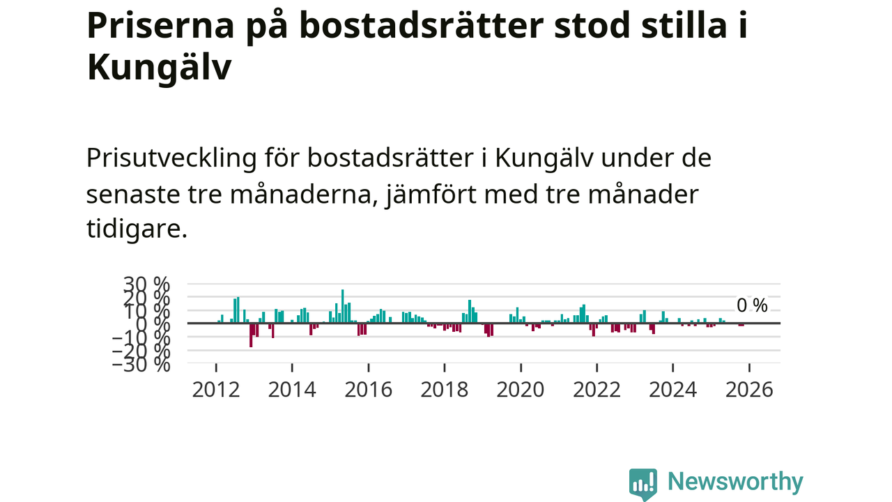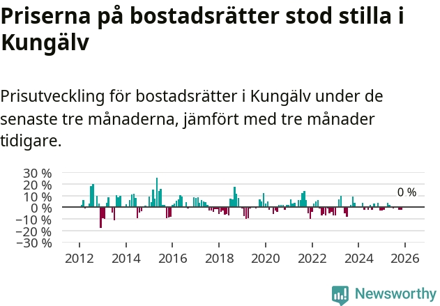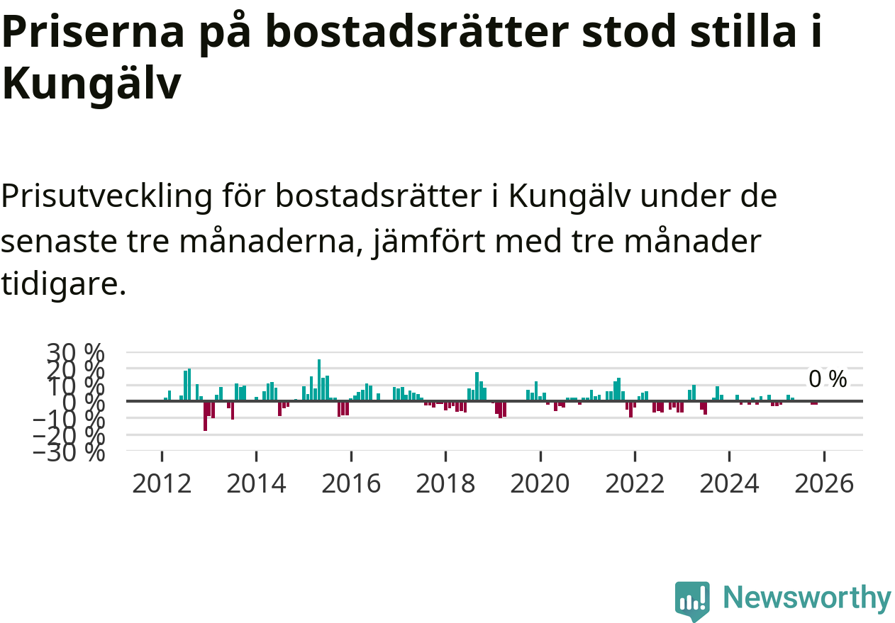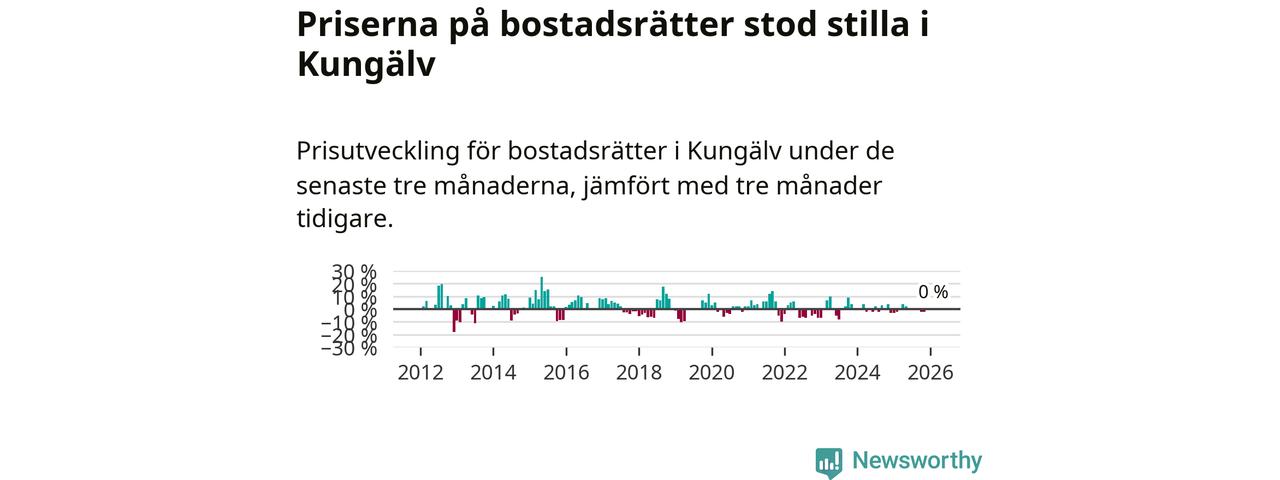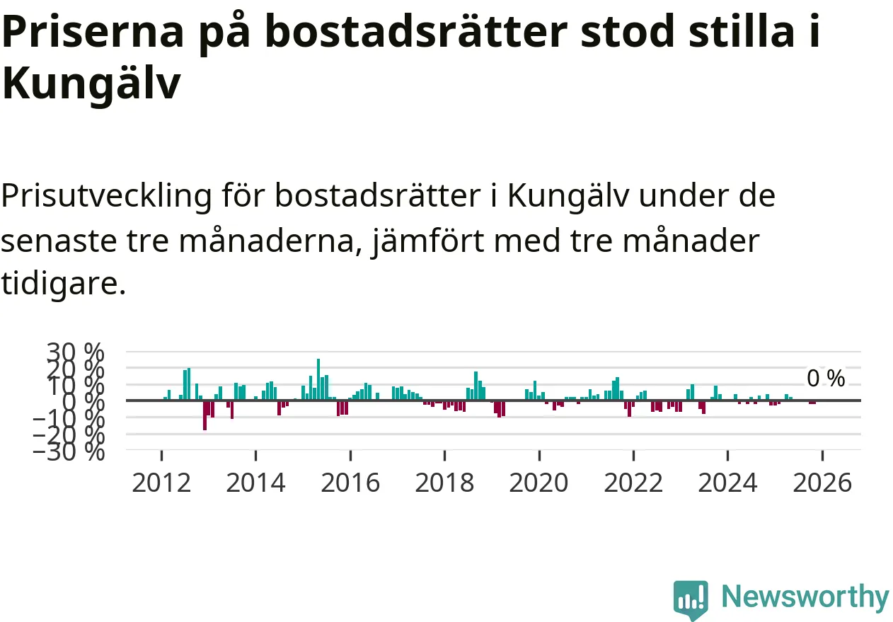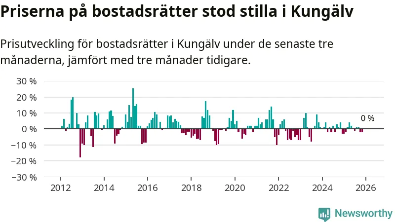 Priserna på bostadsrätter står i stort sett stilla i Kungälvs kommun. Medelpriset på de på försäljningarna under de senaste tre månaderna låg på samma nivå som för tre månader sedan.