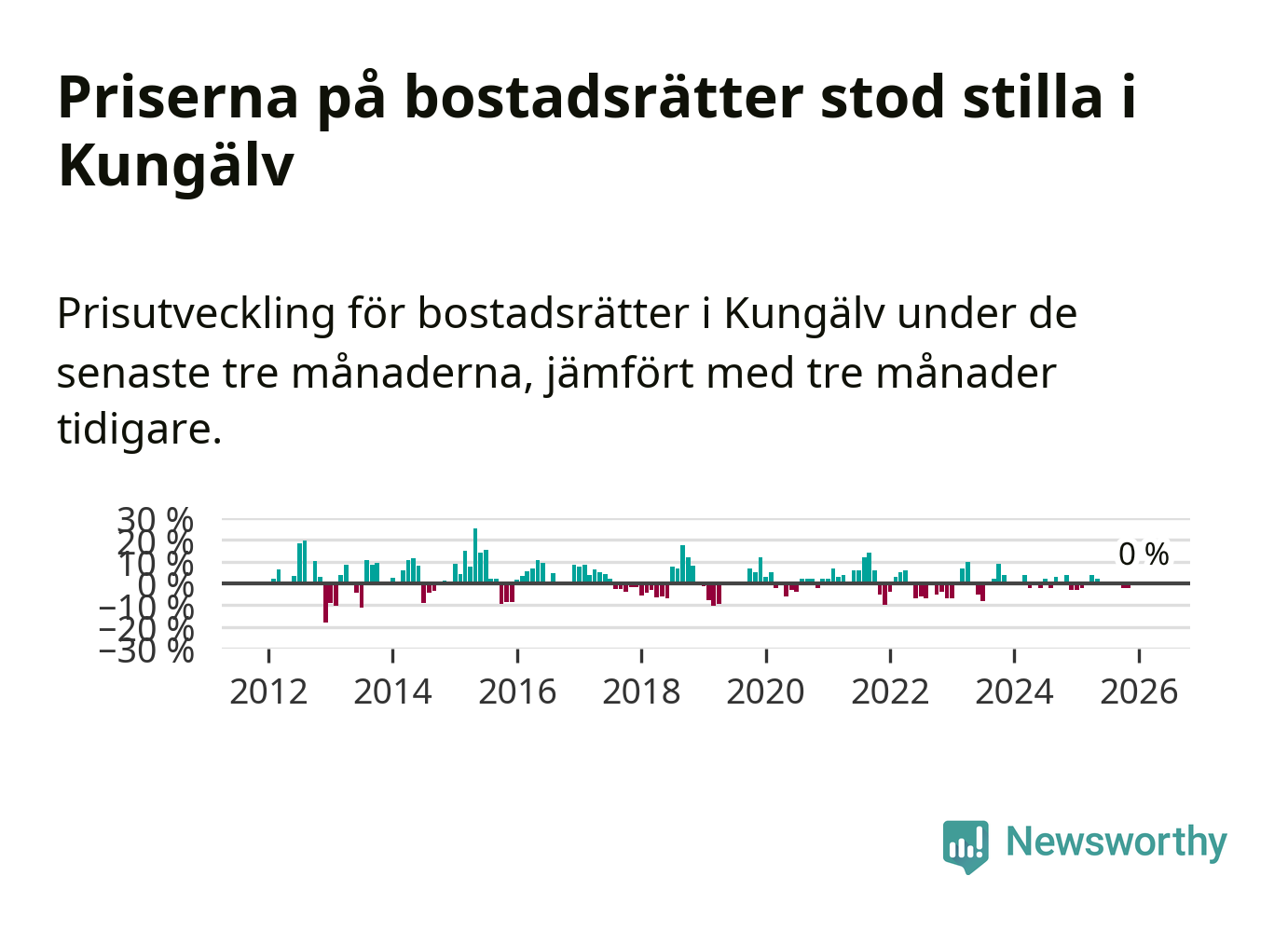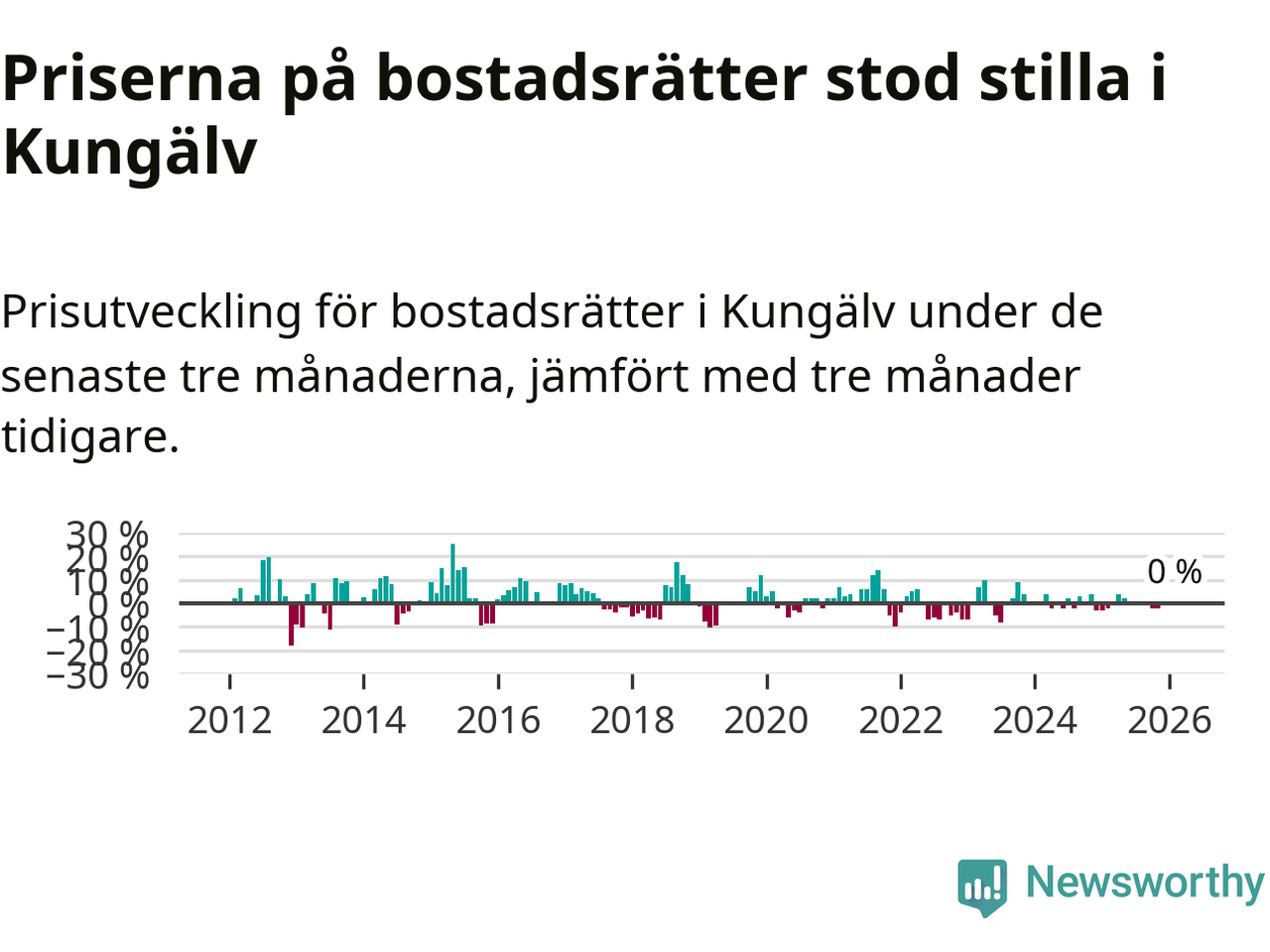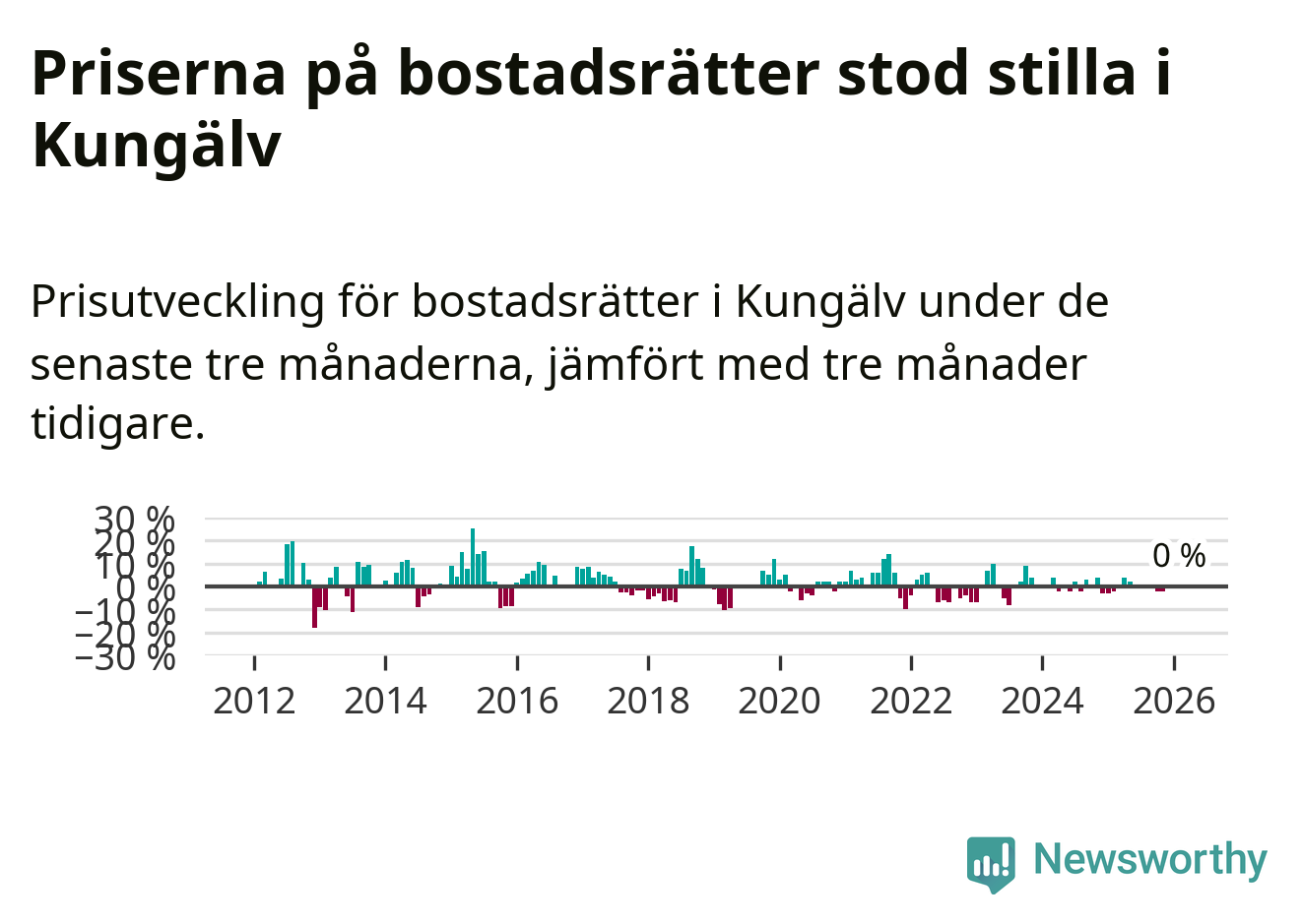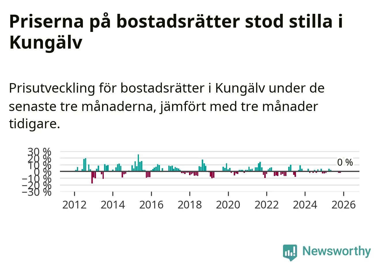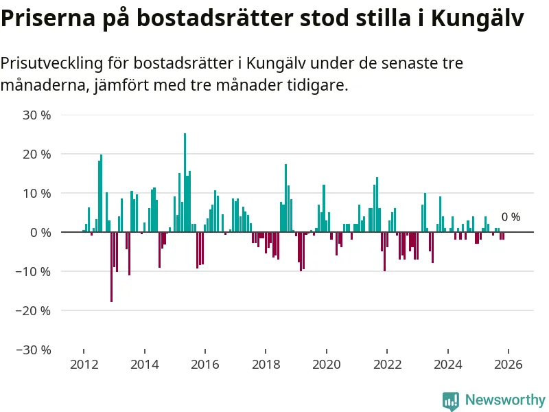 Priserna på bostadsrätter står i stort sett stilla i Kungälvs kommun. Medelpriset på de på försäljningarna under de senaste tre månaderna låg på samma nivå som för tre månader sedan.