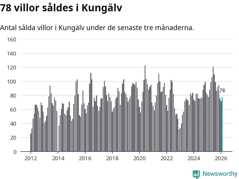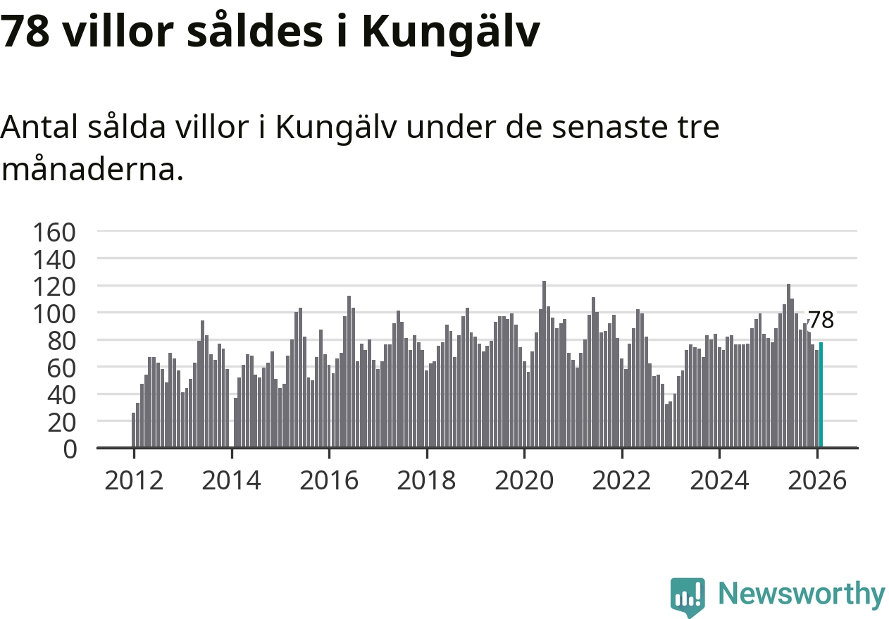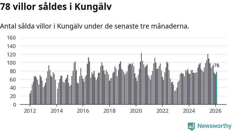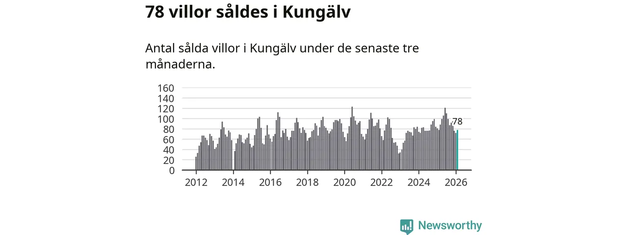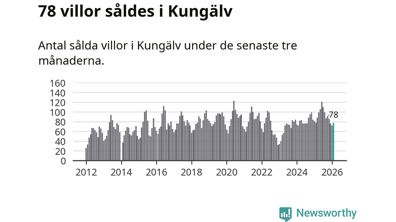 Sammanlagt såldes 78 villor i Kungälvs kommun mellan december och februari till ett genomsnittligt pris på 5,1 miljoner kronor. I fjol gjordes 78 affärer vid den här tiden på året.
