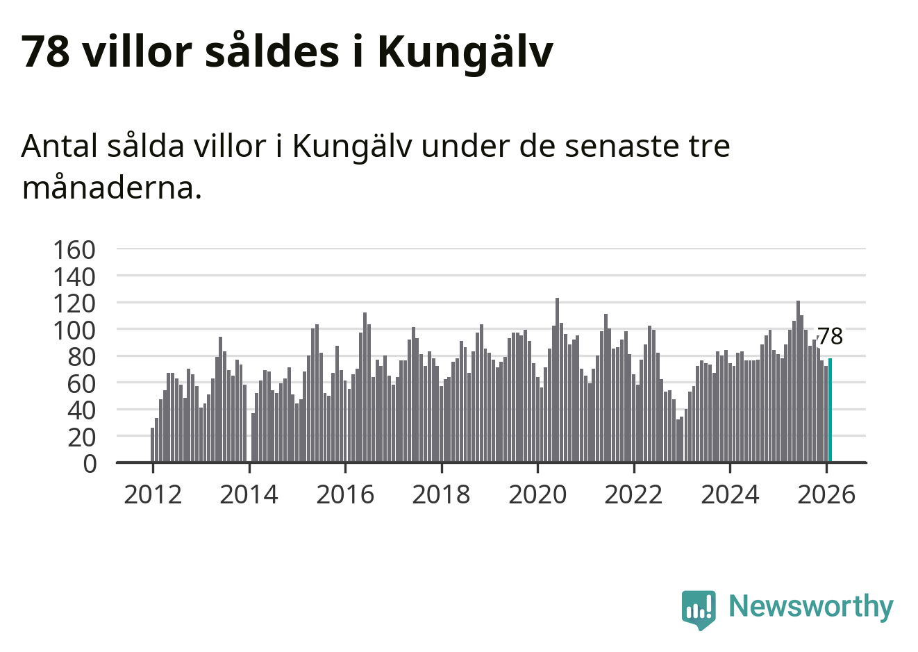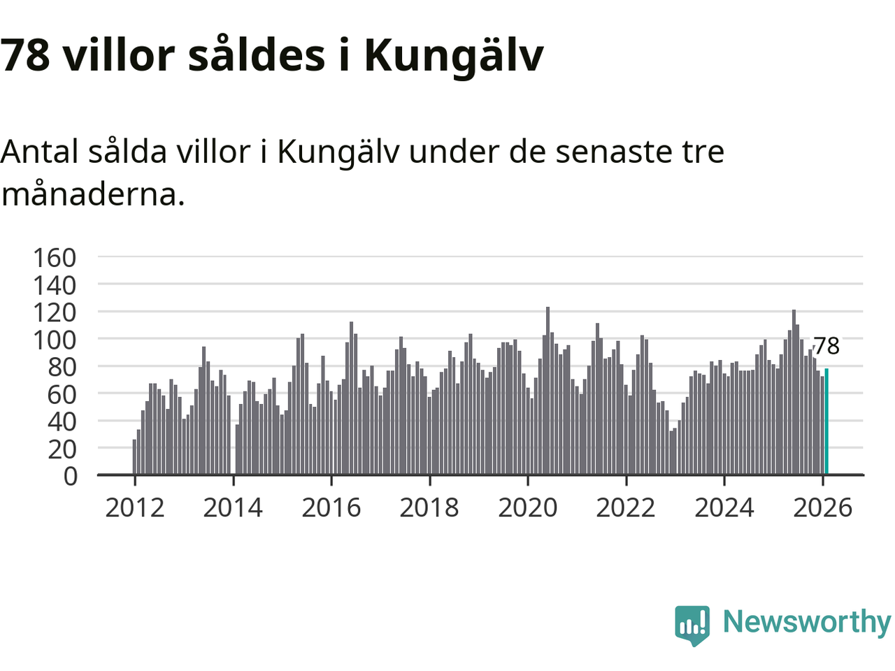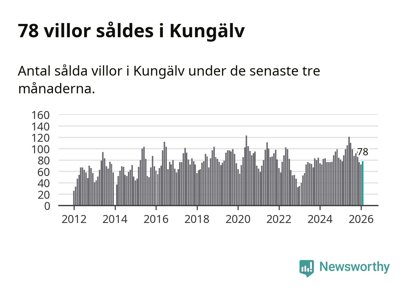 Sammanlagt såldes 78 villor i Kungälvs kommun mellan december och februari till ett genomsnittligt pris på 5,1 miljoner kronor. I fjol gjordes 78 affärer vid den här tiden på året.