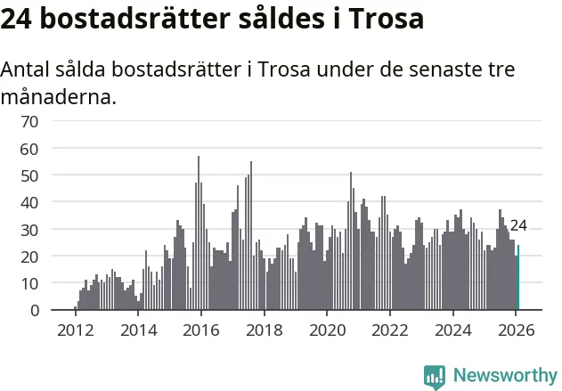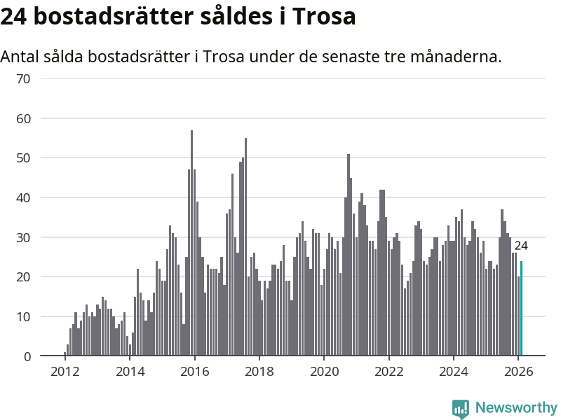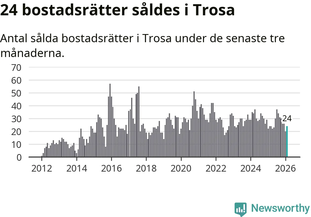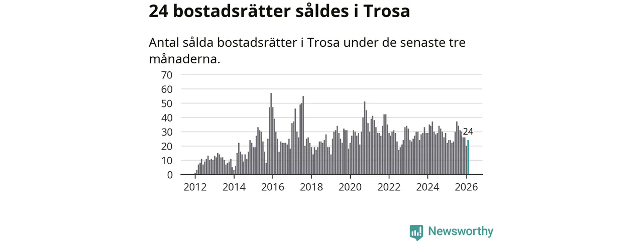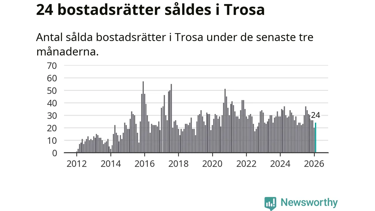 Mellan december och februari gjordes sammanlagt 24 affärer med bostadsrätter i Trosa kommun. Det är lika många affärer som vid motsvarande tid i fjol.