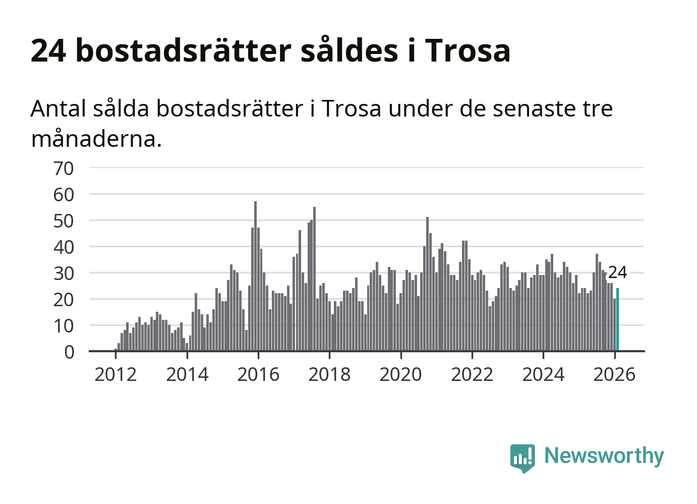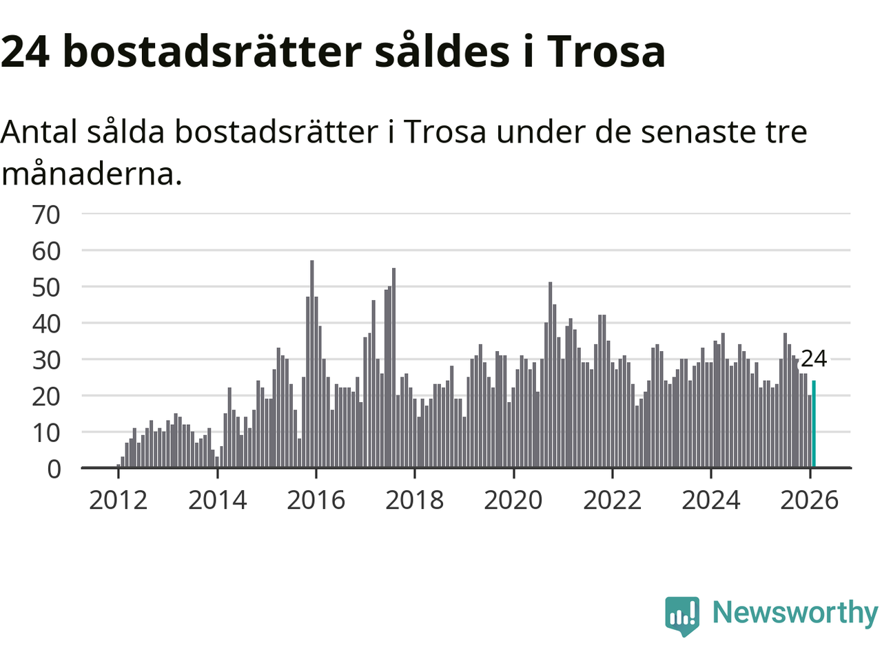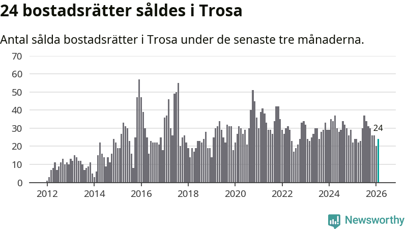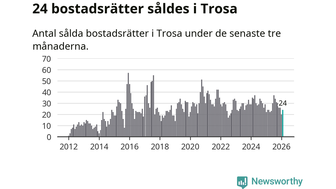 Mellan december och februari gjordes sammanlagt 24 affärer med bostadsrätter i Trosa kommun. Det är lika många affärer som vid motsvarande tid i fjol.