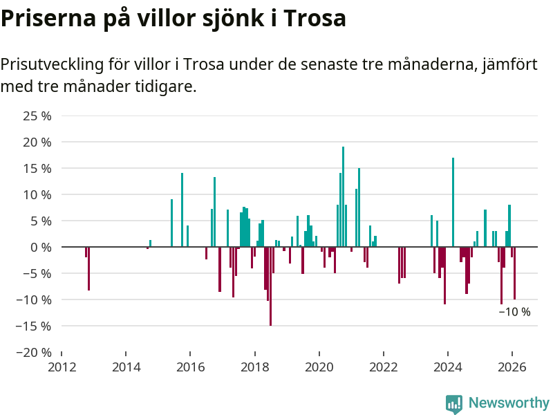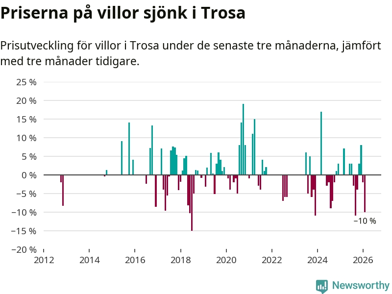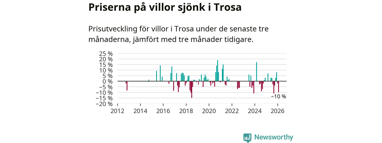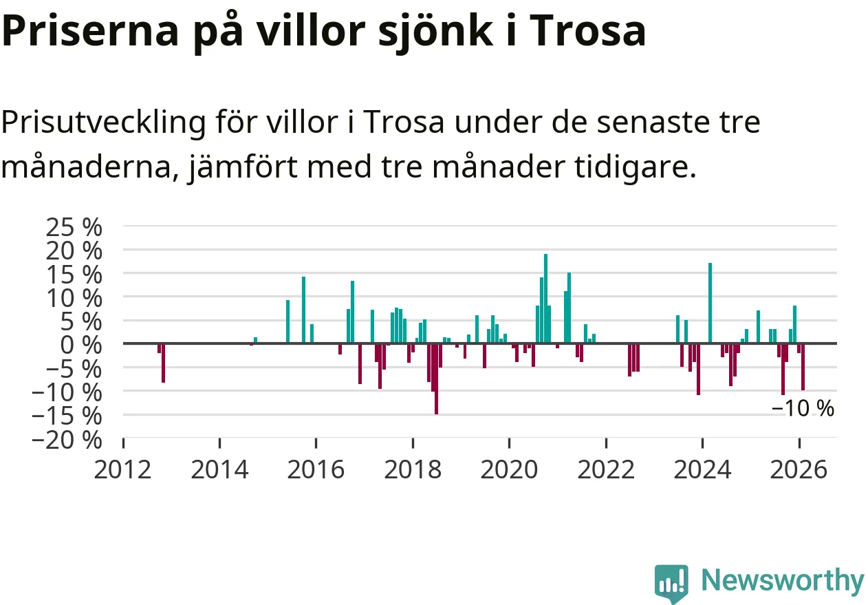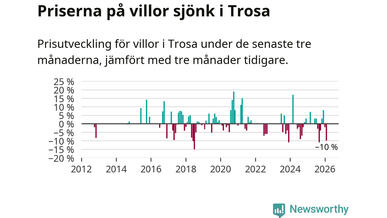 Statistiken visar även på en stor prisnedgång i Trosa kommun. Medelpriset på försäljningarna av villor i kommunen var 10 procent lägre än för tre månader sedan. I hela Södermanland däremot ligger villapriserna stilla.