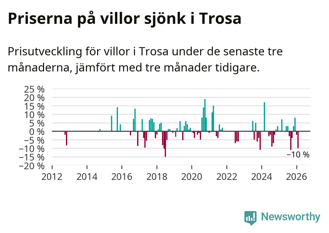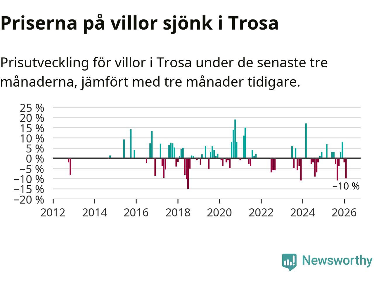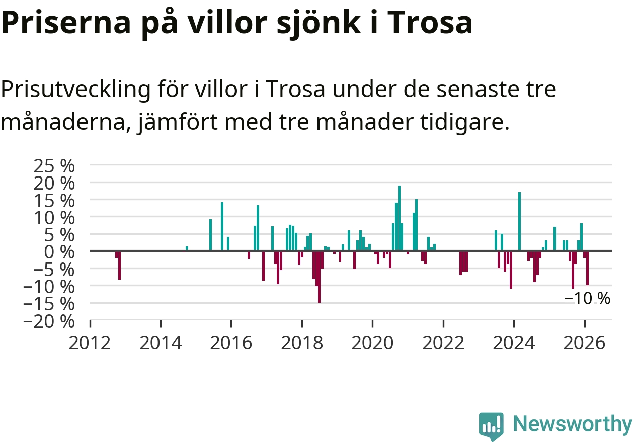 Statistiken visar även på en stor prisnedgång i Trosa kommun. Medelpriset på försäljningarna av villor i kommunen var 10 procent lägre än för tre månader sedan. I hela Södermanland däremot ligger villapriserna stilla.