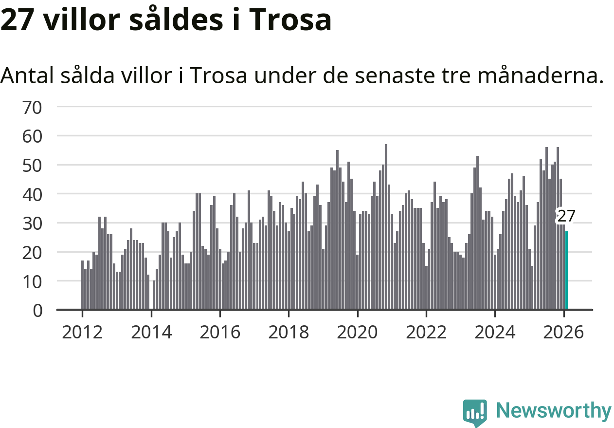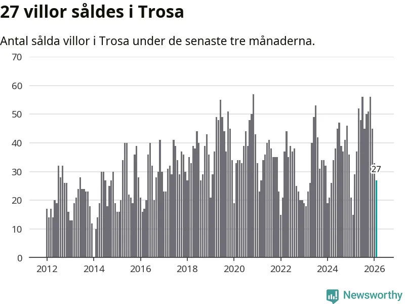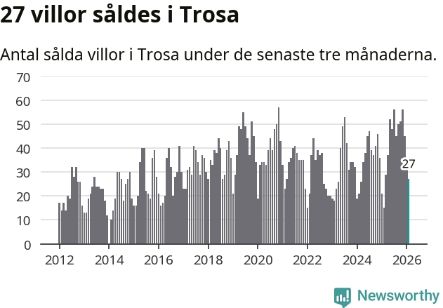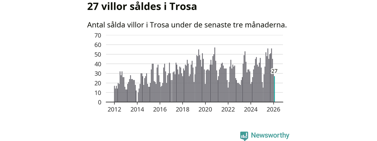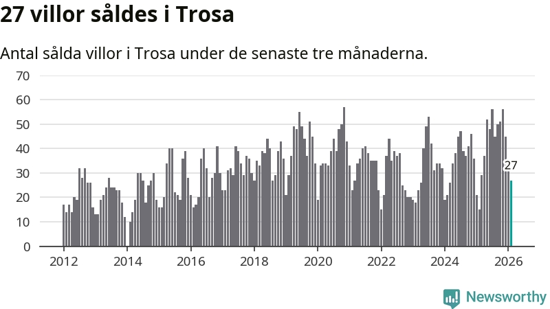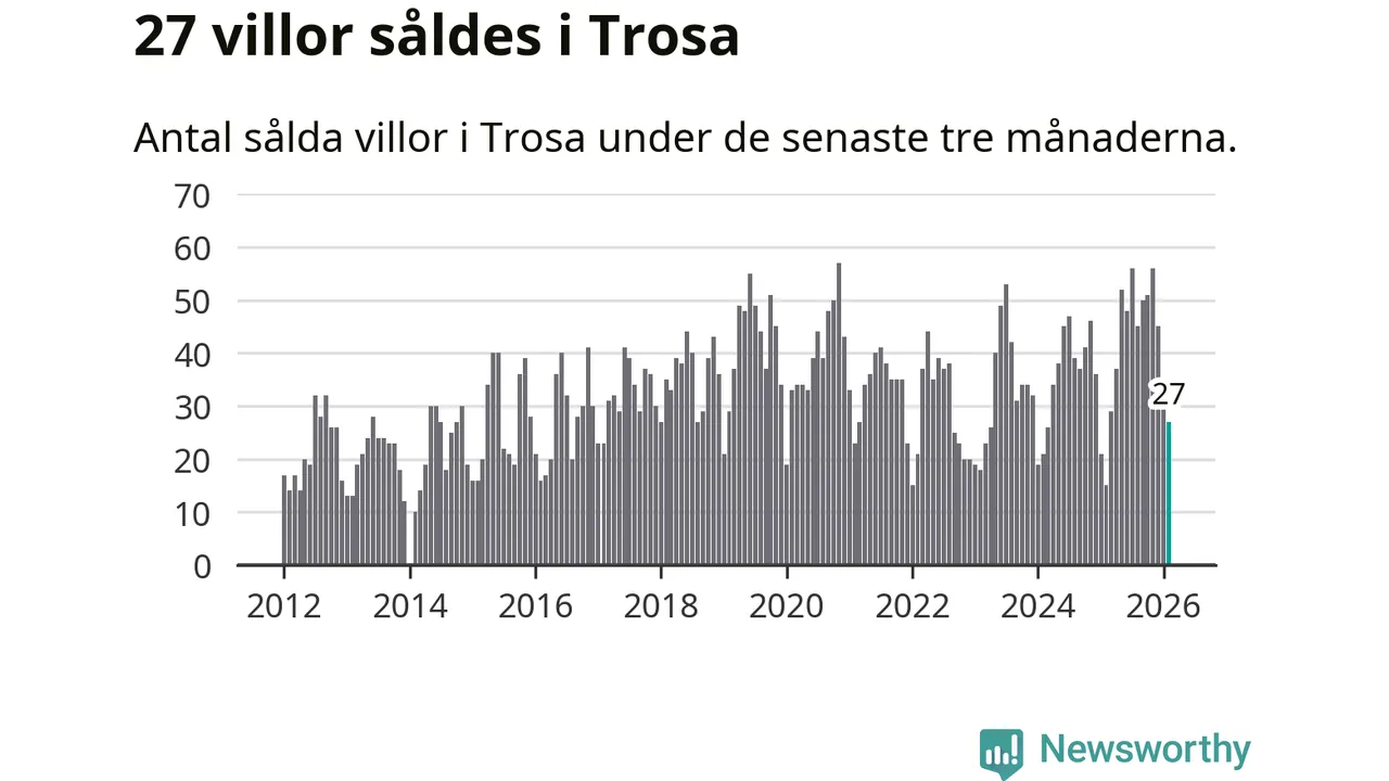 Mellan december och februari gjordes sammanlagt 27 affärer med villor i Trosa kommun. Det kan jämföras med 15 vid motsvarande tid i fjol.