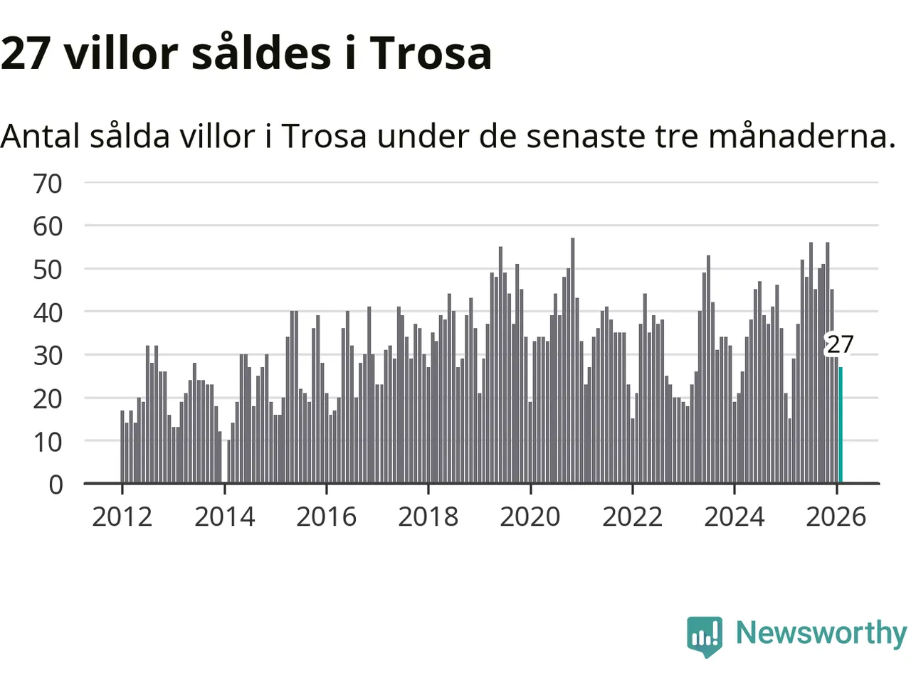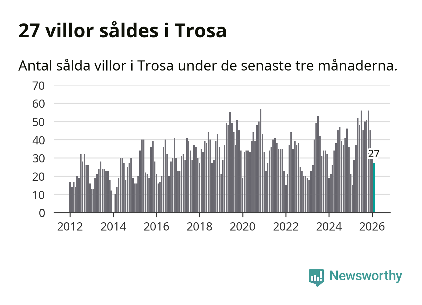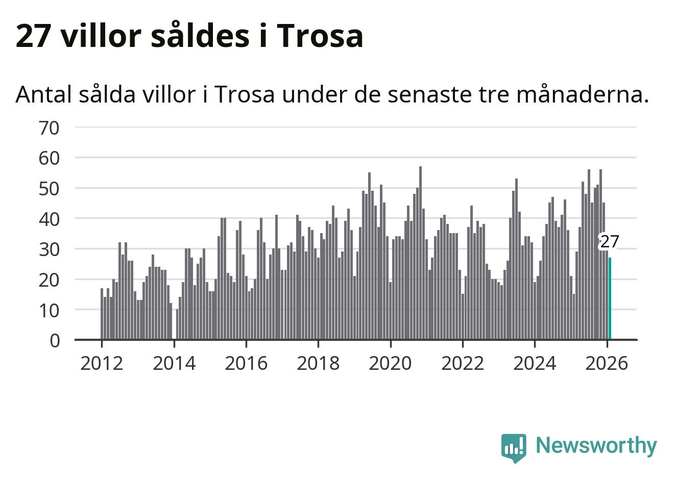 Mellan december och februari gjordes sammanlagt 27 affärer med villor i Trosa kommun. Det kan jämföras med 15 vid motsvarande tid i fjol.