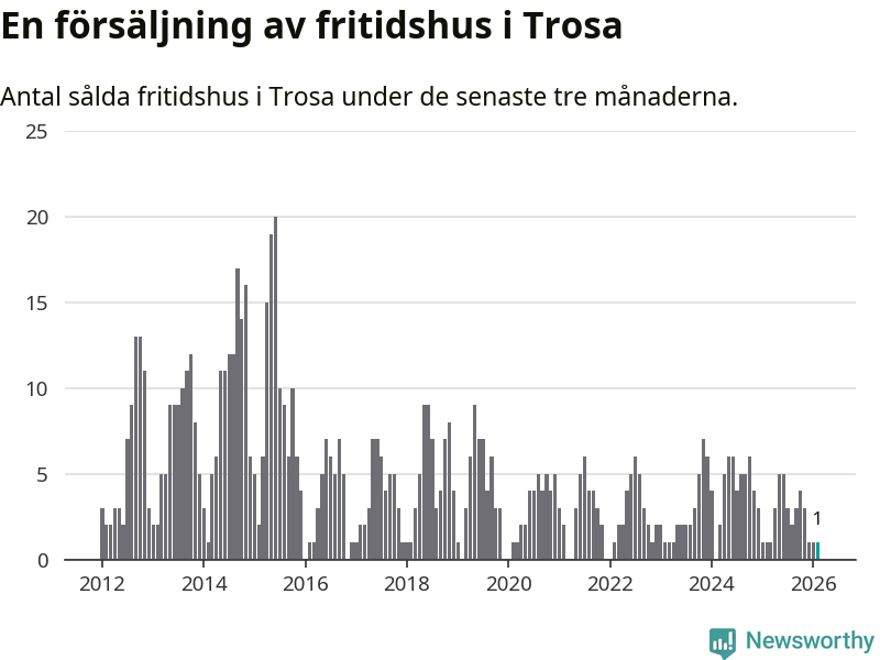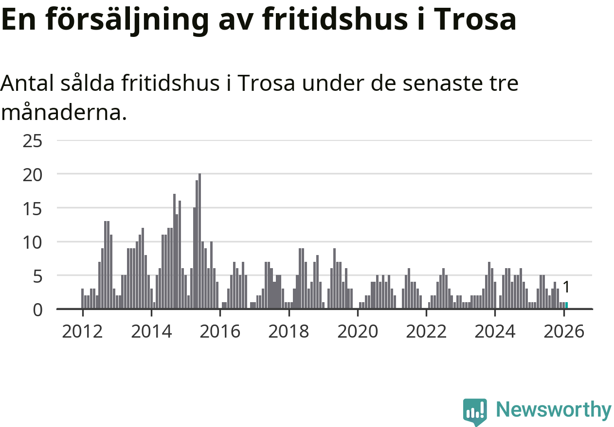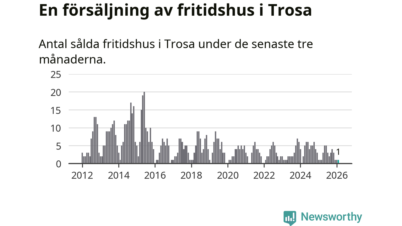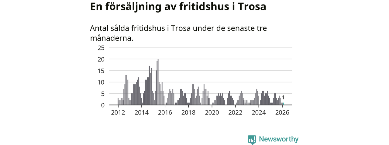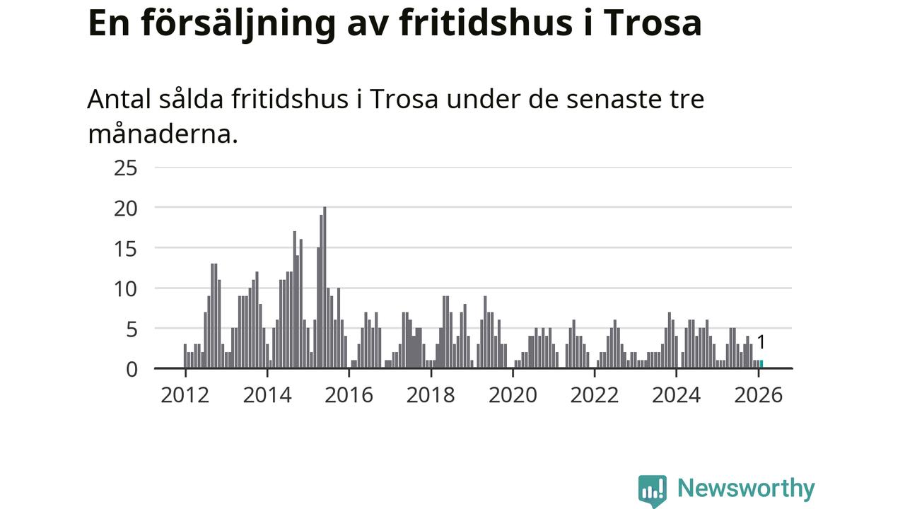 Mellan december och februari gjordes sammanlagt en affär med fritidshus i Trosa kommun. Det är lika många affärer som vid motsvarande tid i fjol.
