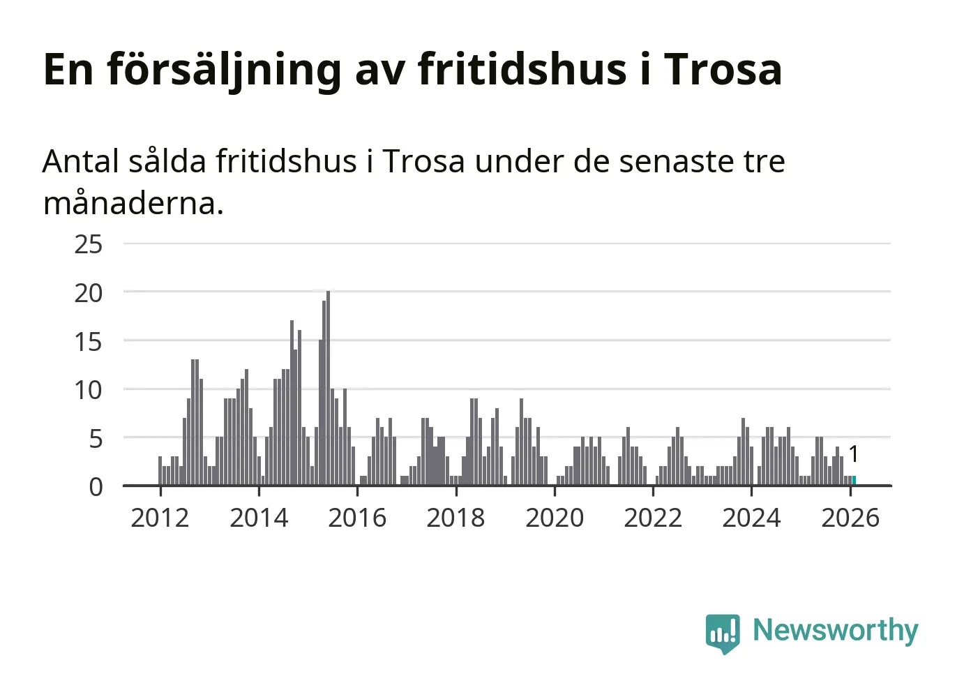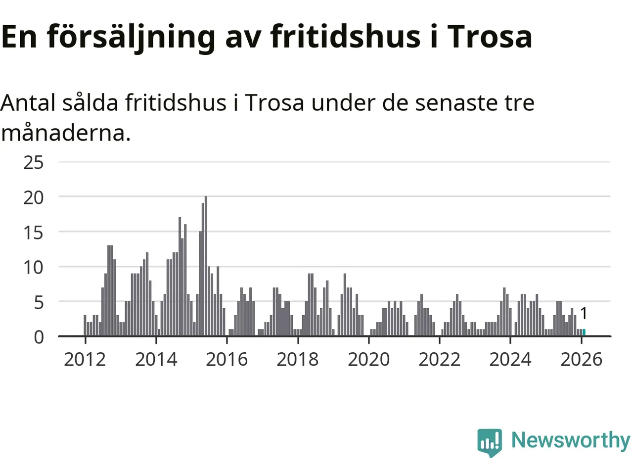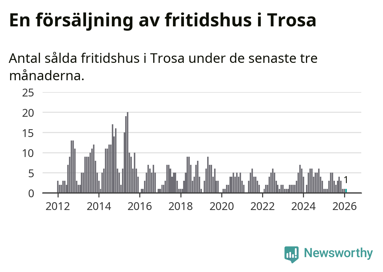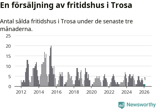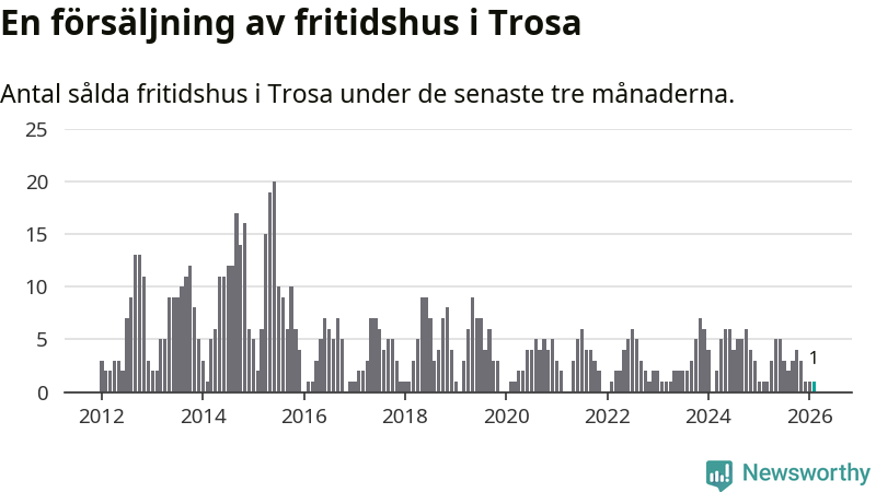 Mellan december och februari gjordes sammanlagt en affär med fritidshus i Trosa kommun. Det är lika många affärer som vid motsvarande tid i fjol.
