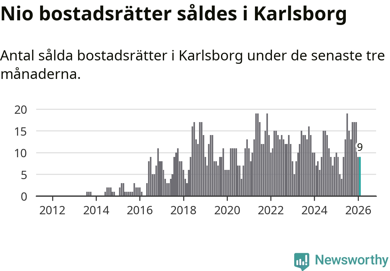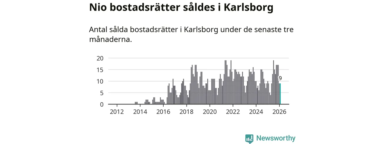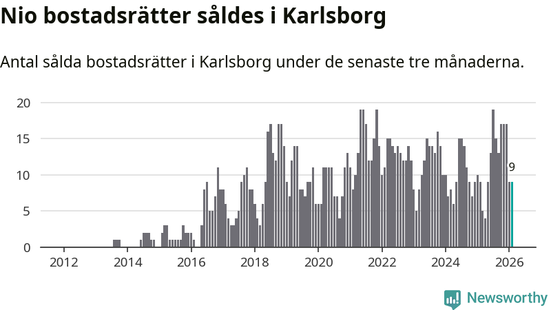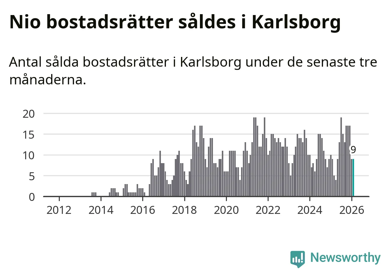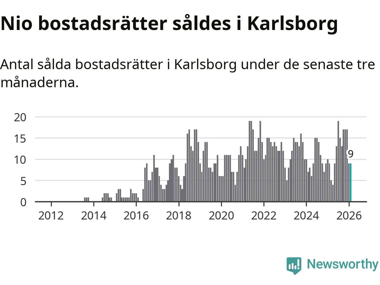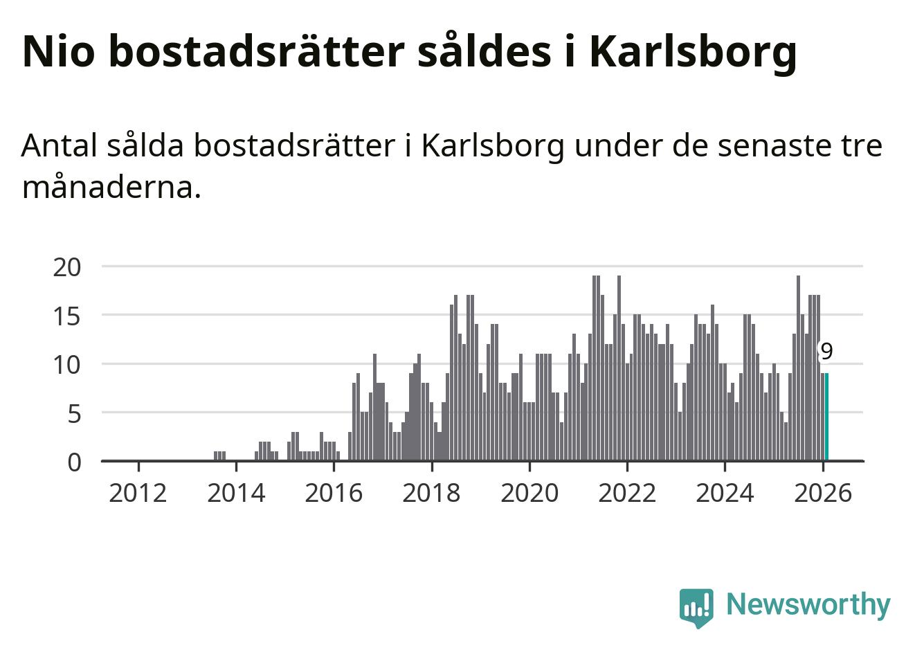Mellan december och februari gjordes sammanlagt nio affärer med bostadsrätter i Karlsborgs kommun. Det är lika många affärer som vid motsvarande tid i fjol.