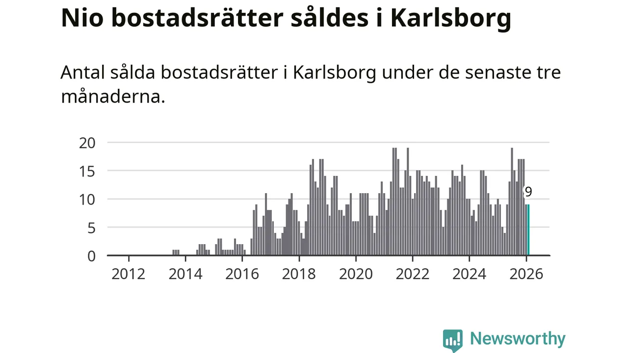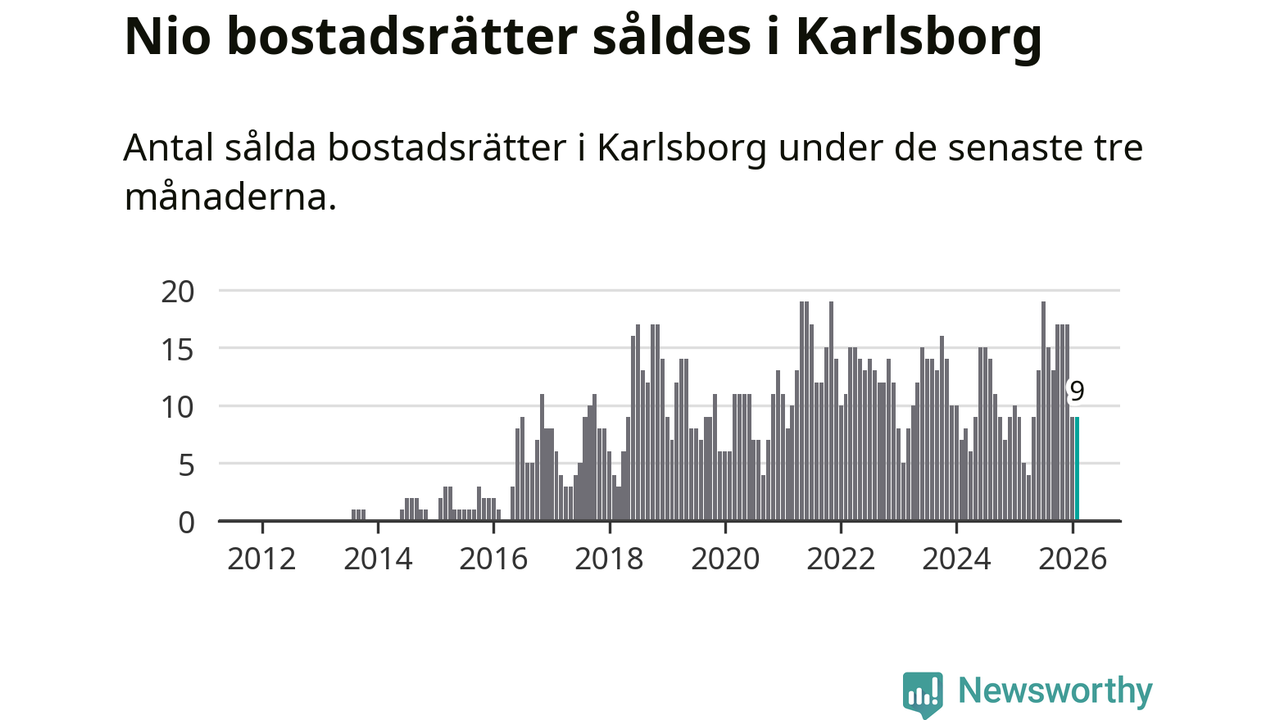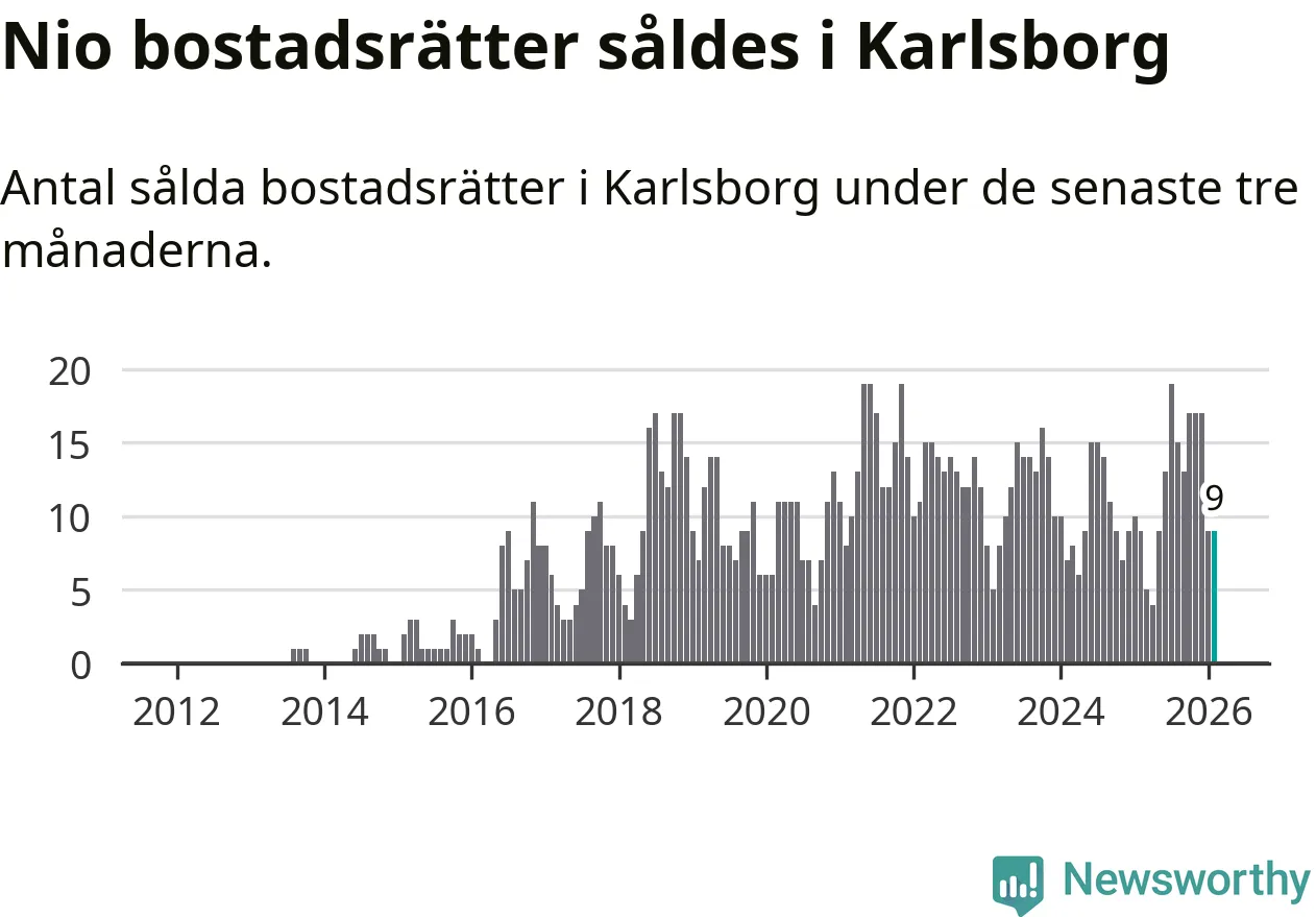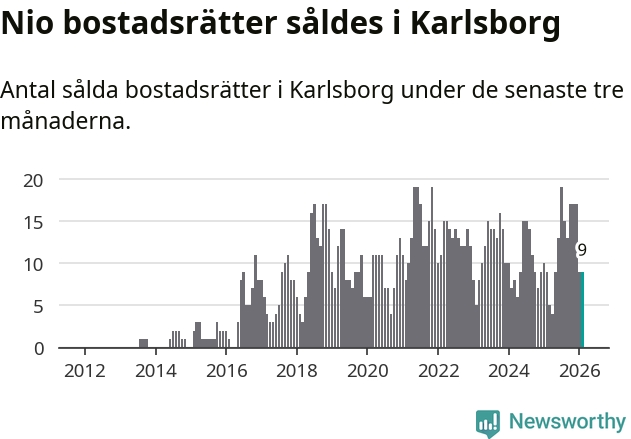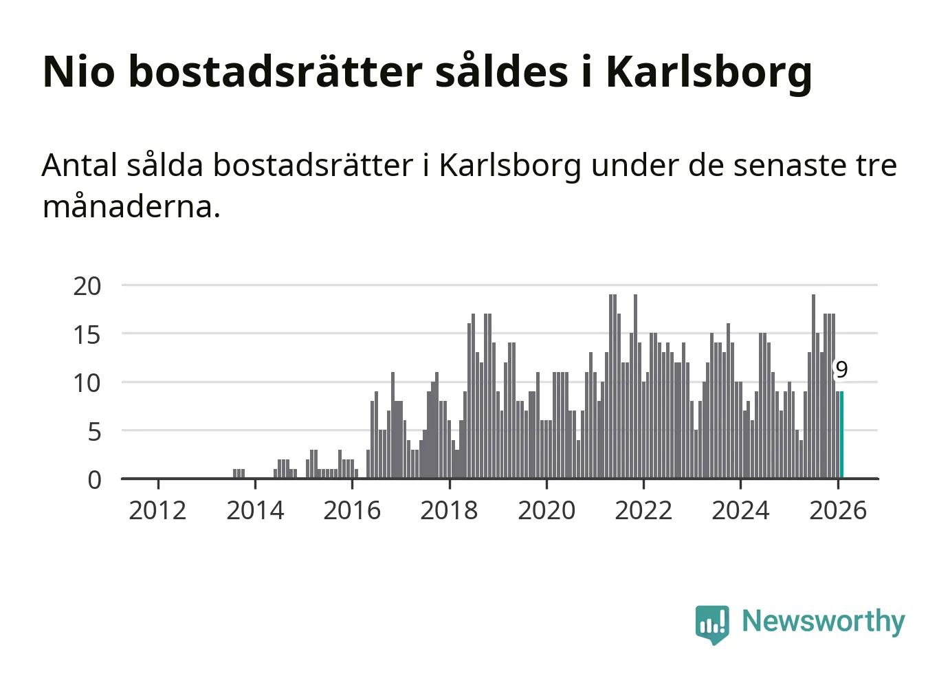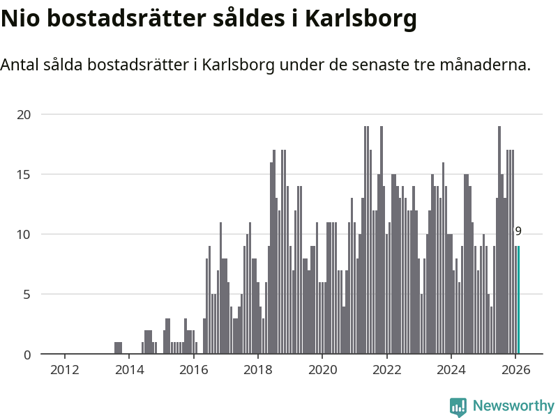Mellan december och februari gjordes sammanlagt nio affärer med bostadsrätter i Karlsborgs kommun. Det är lika många affärer som vid motsvarande tid i fjol.