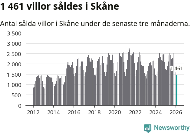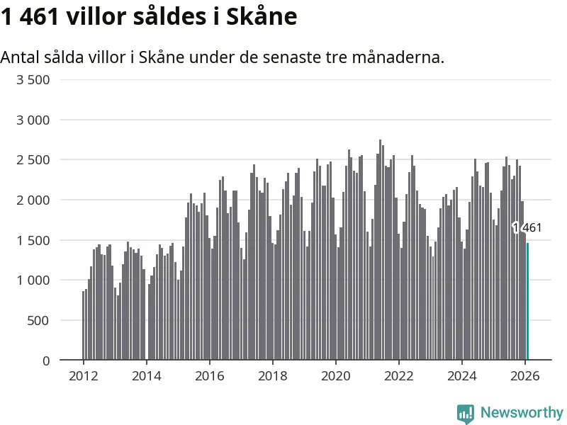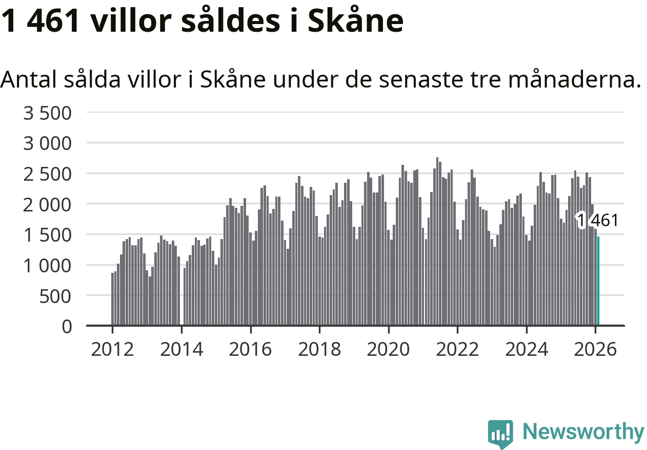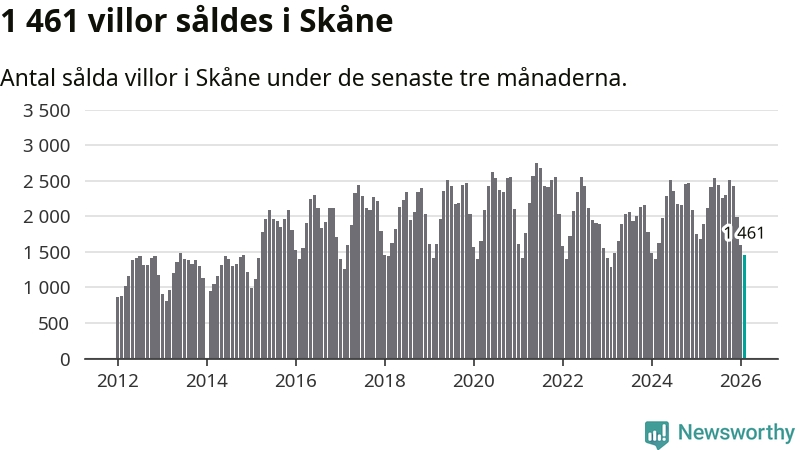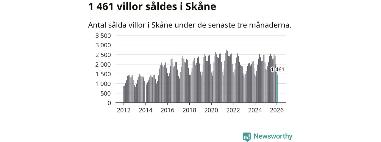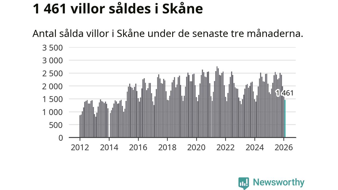 Sammanlagt såldes 1 461 villor i Skåne län mellan december och februari till ett genomsnittligt pris på 4,0 miljoner kronor. I fjol gjordes 1 686 affärer vid den här tiden på året.