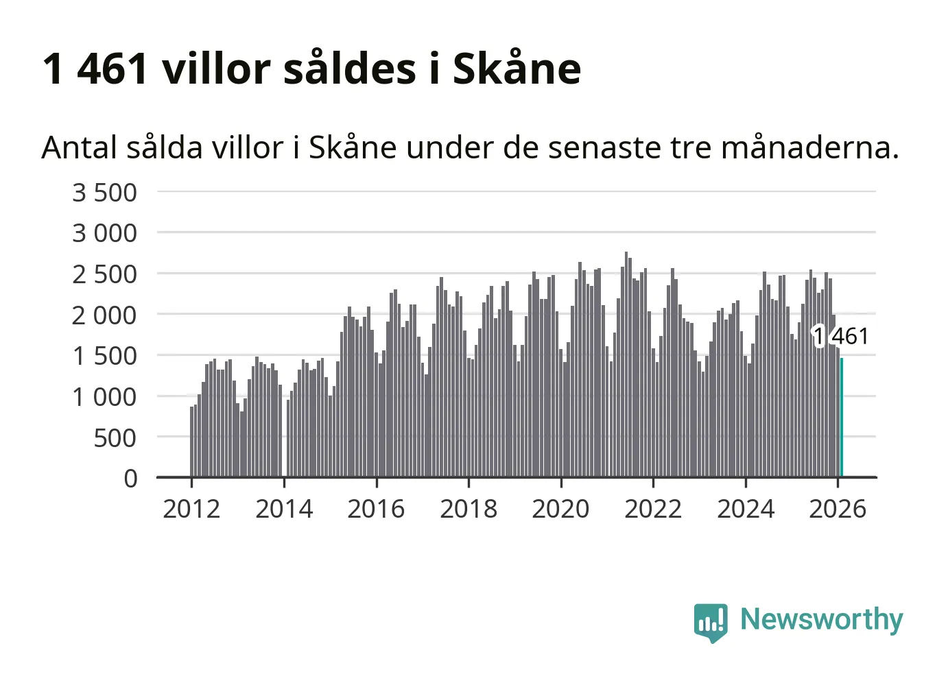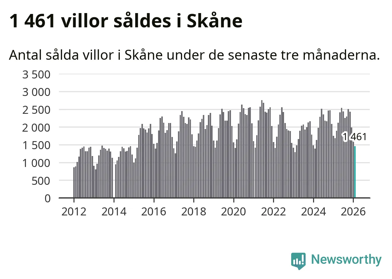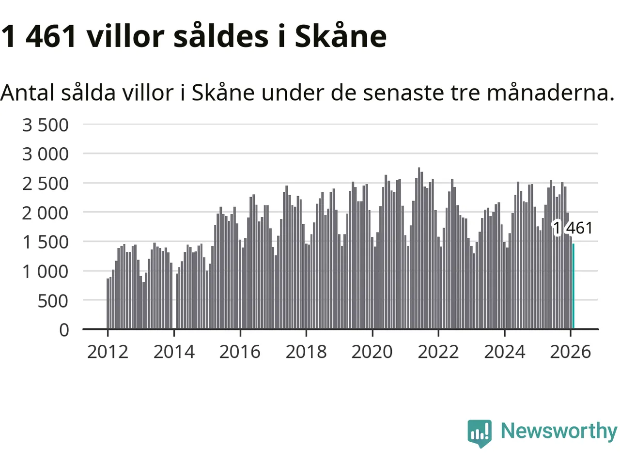 Sammanlagt såldes 1 461 villor i Skåne län mellan december och februari till ett genomsnittligt pris på 4,0 miljoner kronor. I fjol gjordes 1 686 affärer vid den här tiden på året.