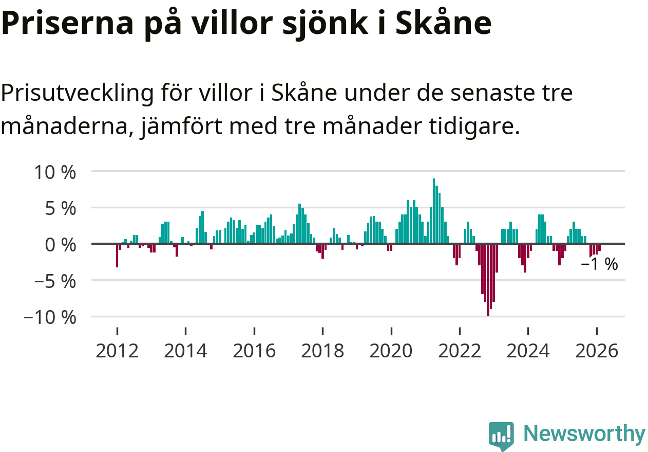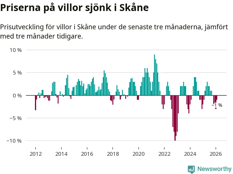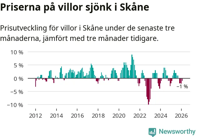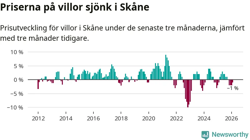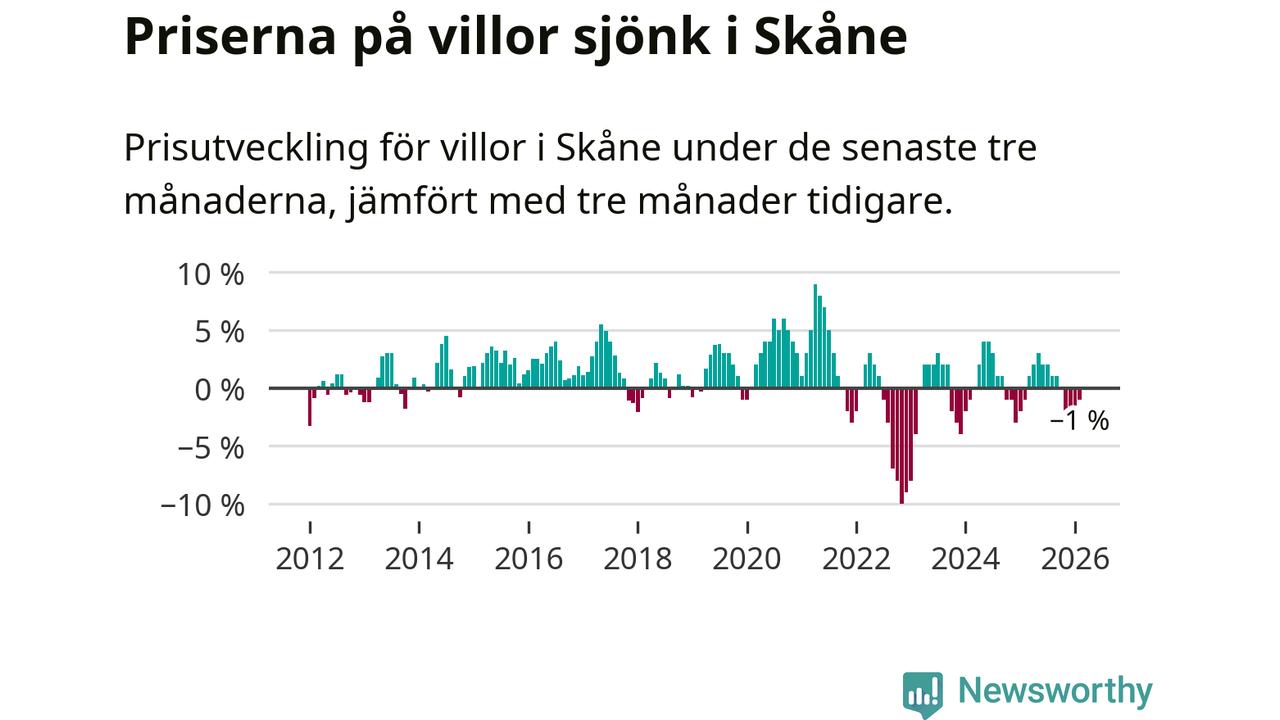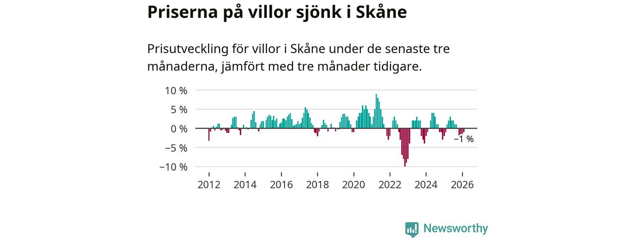 Villapriserna har gått ner i Skåne län. Medelpriset på försäljningarna under de senaste tre månaderna visar på en nedgång med 1 procent.