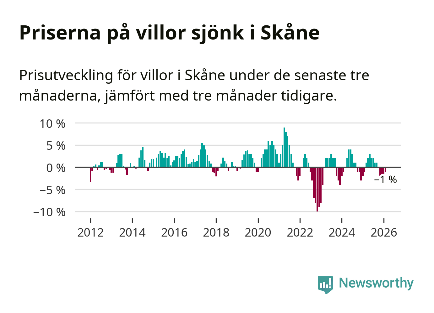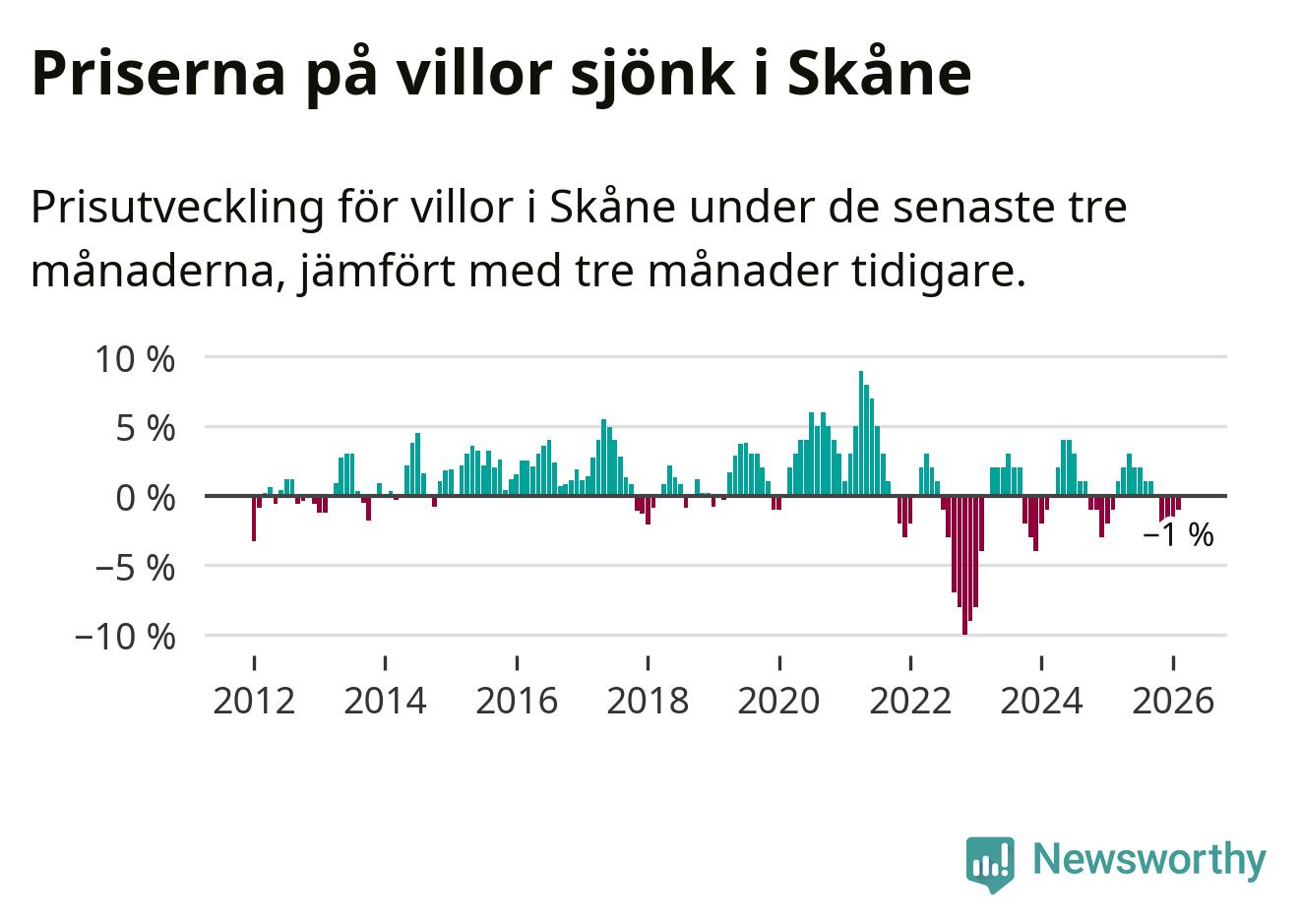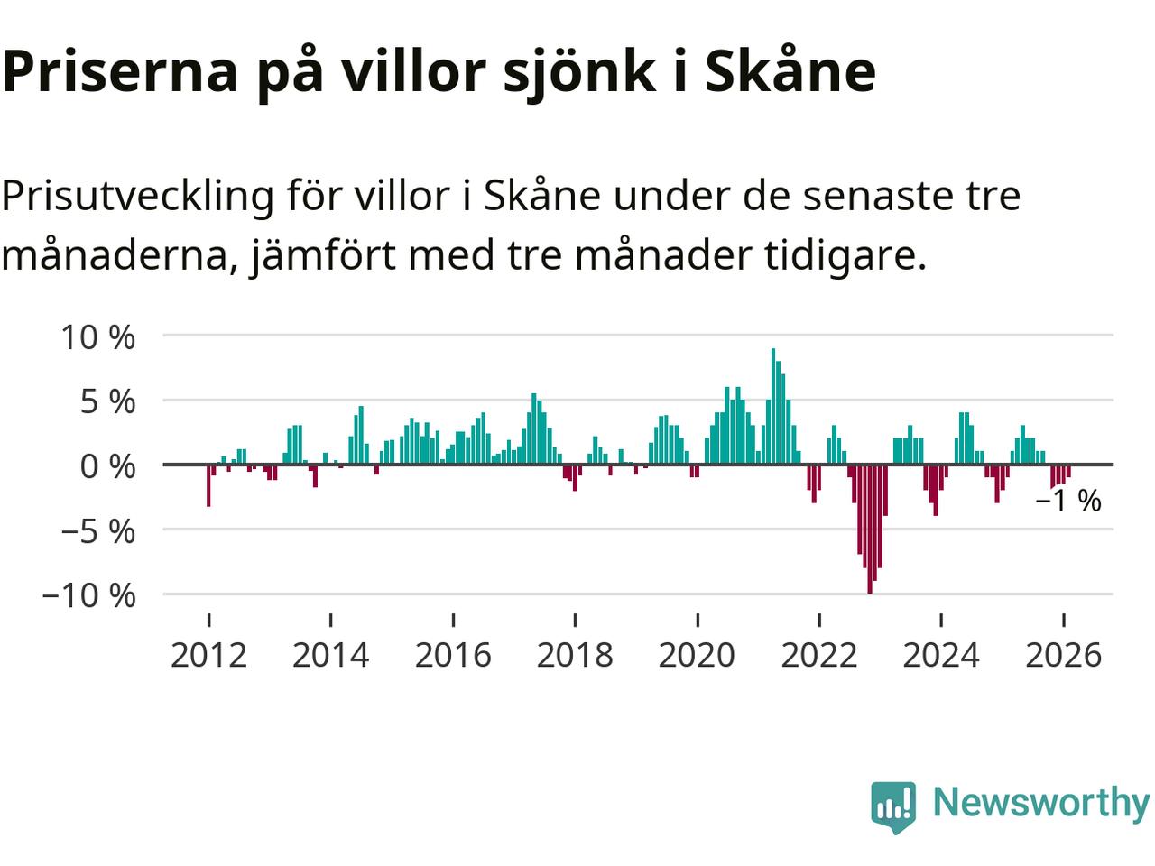 Villapriserna har gått ner i Skåne län. Medelpriset på försäljningarna under de senaste tre månaderna visar på en nedgång med 1 procent.