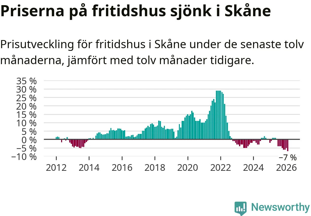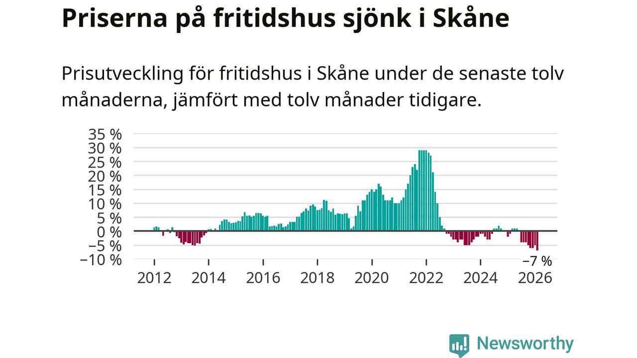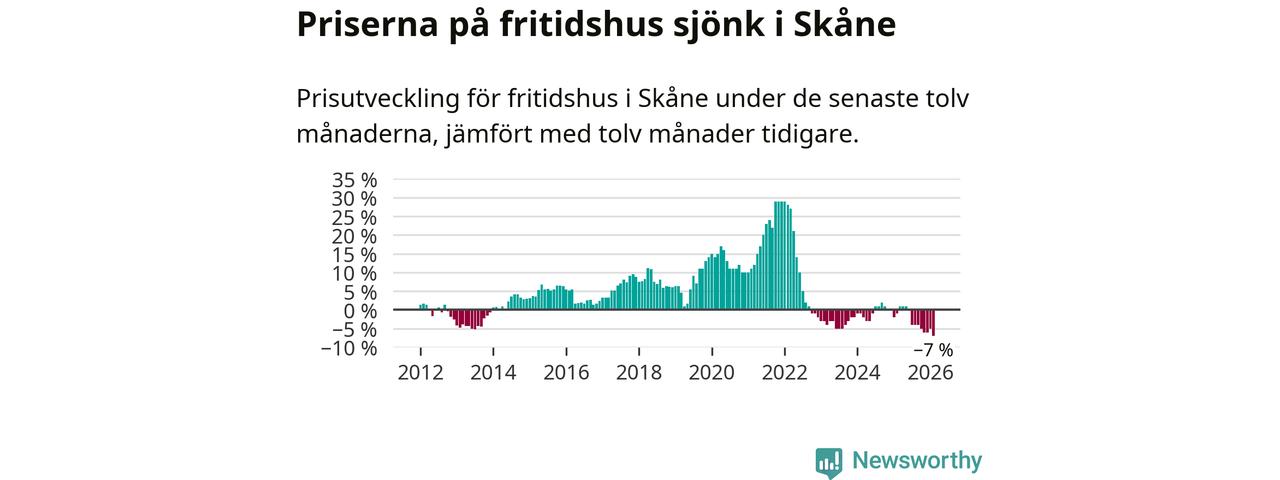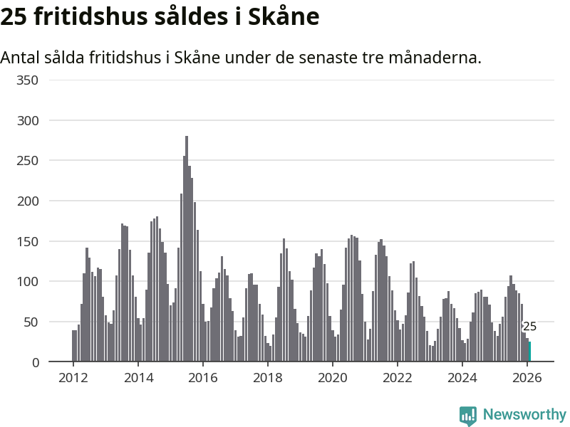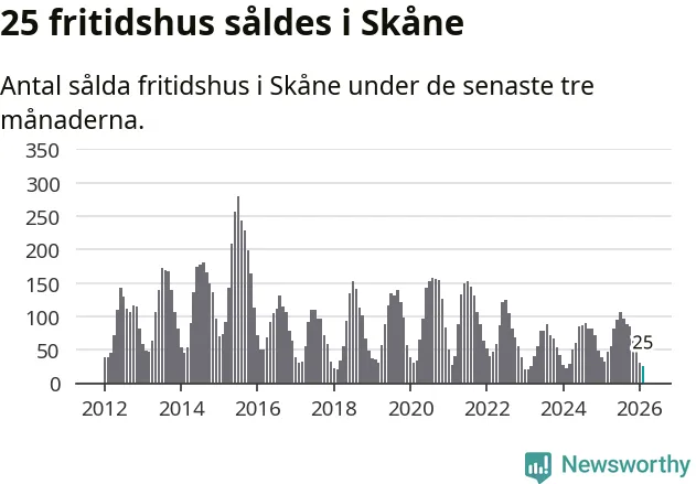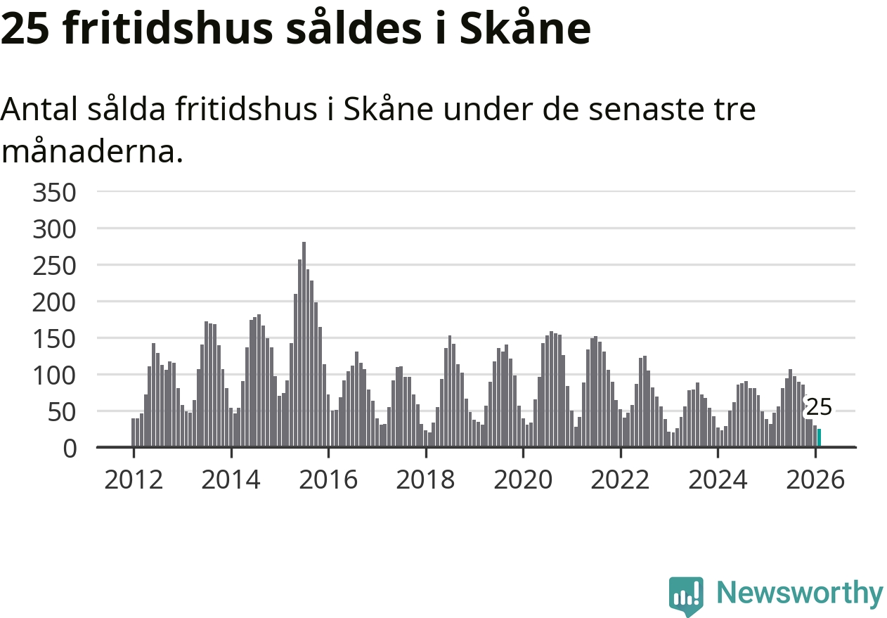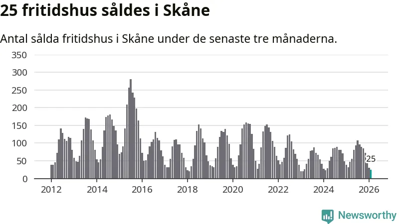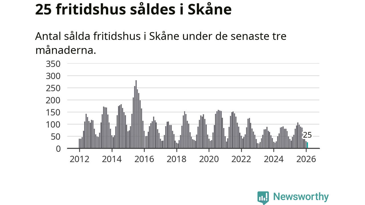 Sammanlagt såldes 25 fritidshus i Skåne län mellan december 2025 och februari till ett genomsnittligt pris på 1,9 miljoner kronor. I fjol gjordes 32 affärer vid den här tiden på året.