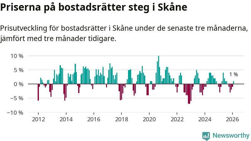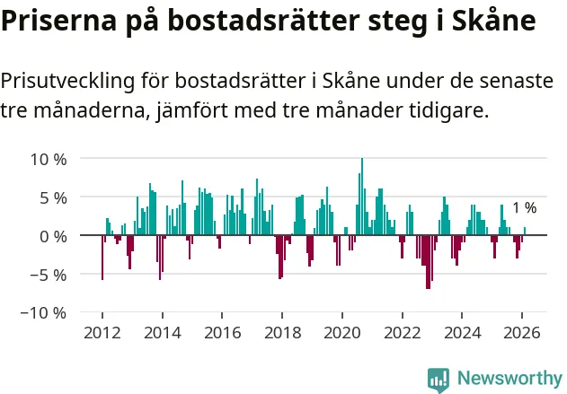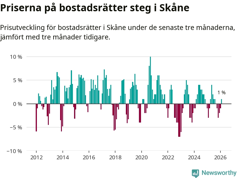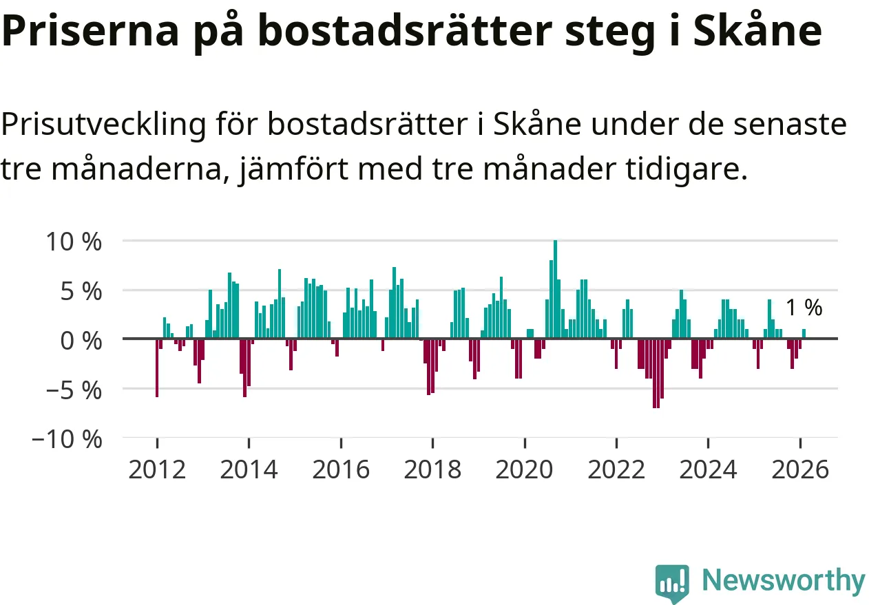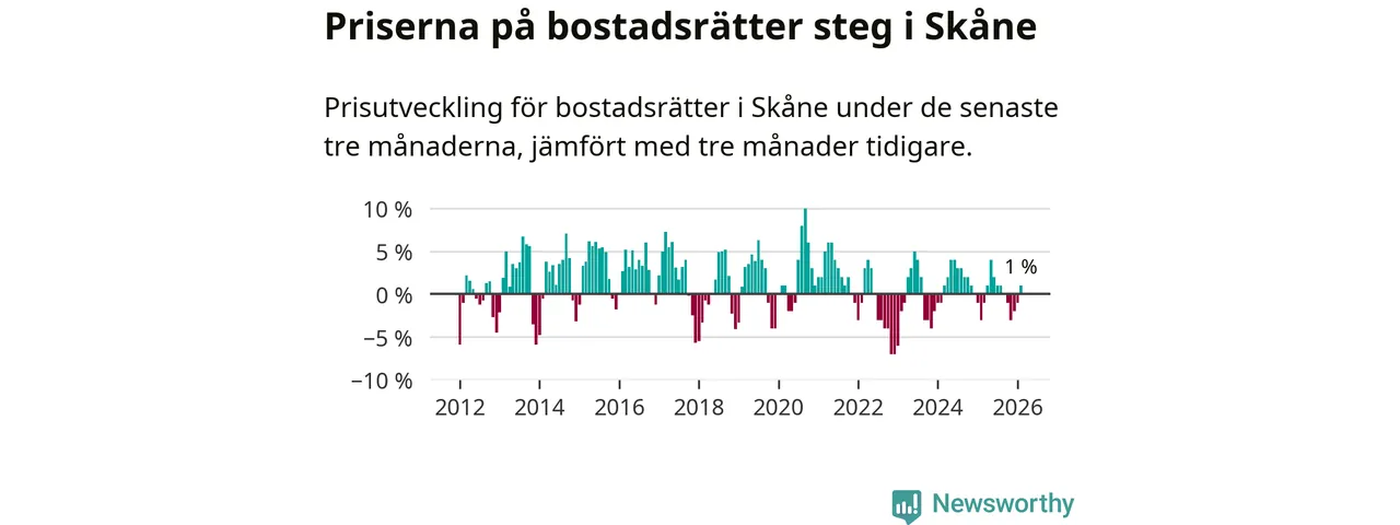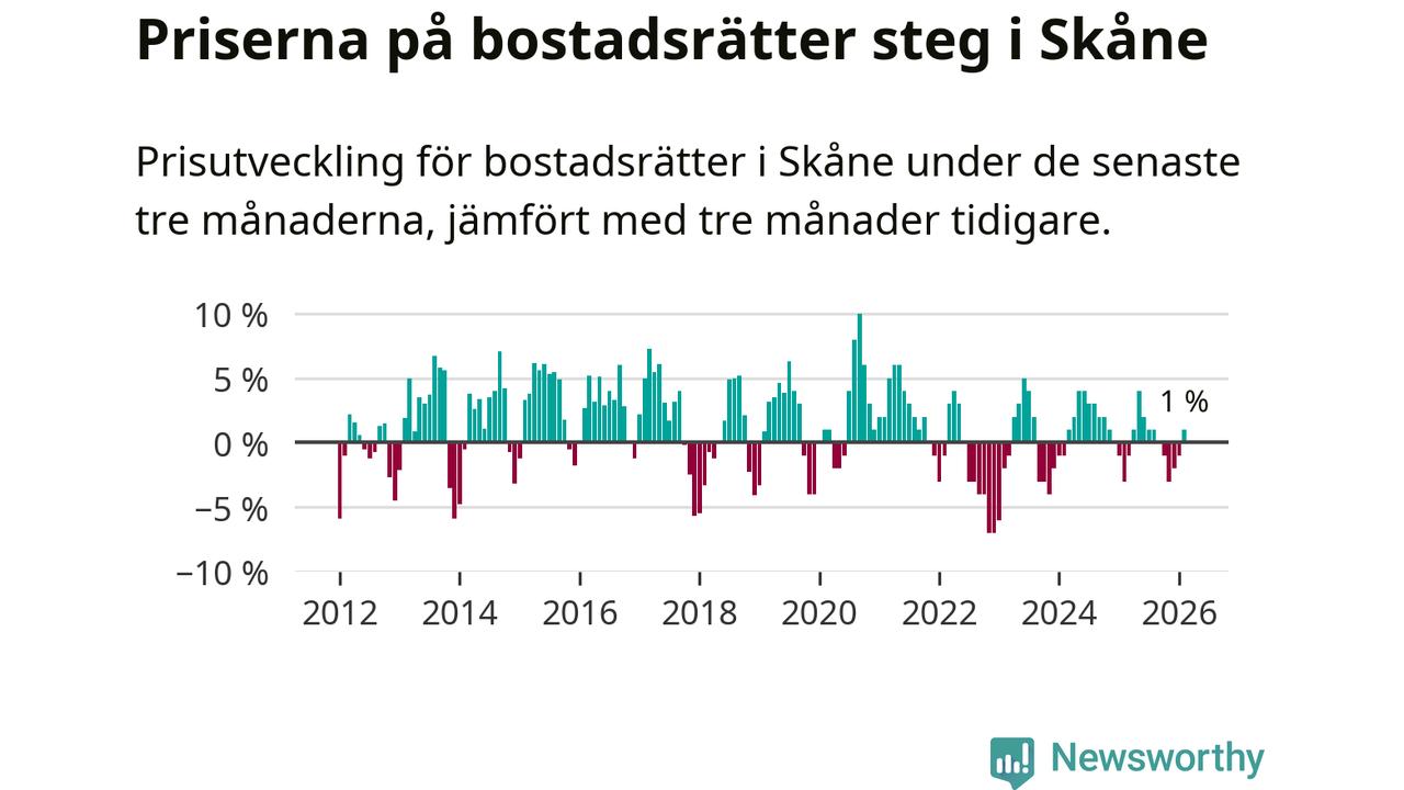 Priserna på bostadsrätter har gått upp i Skåne län. Medelpriset på försäljningarna under de senaste tre månaderna visar på en uppgång med 1 procent.