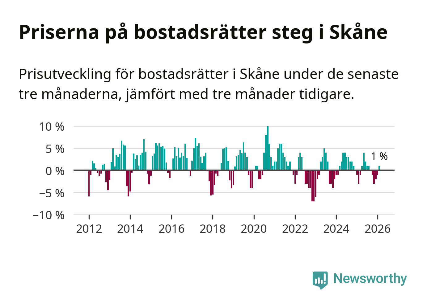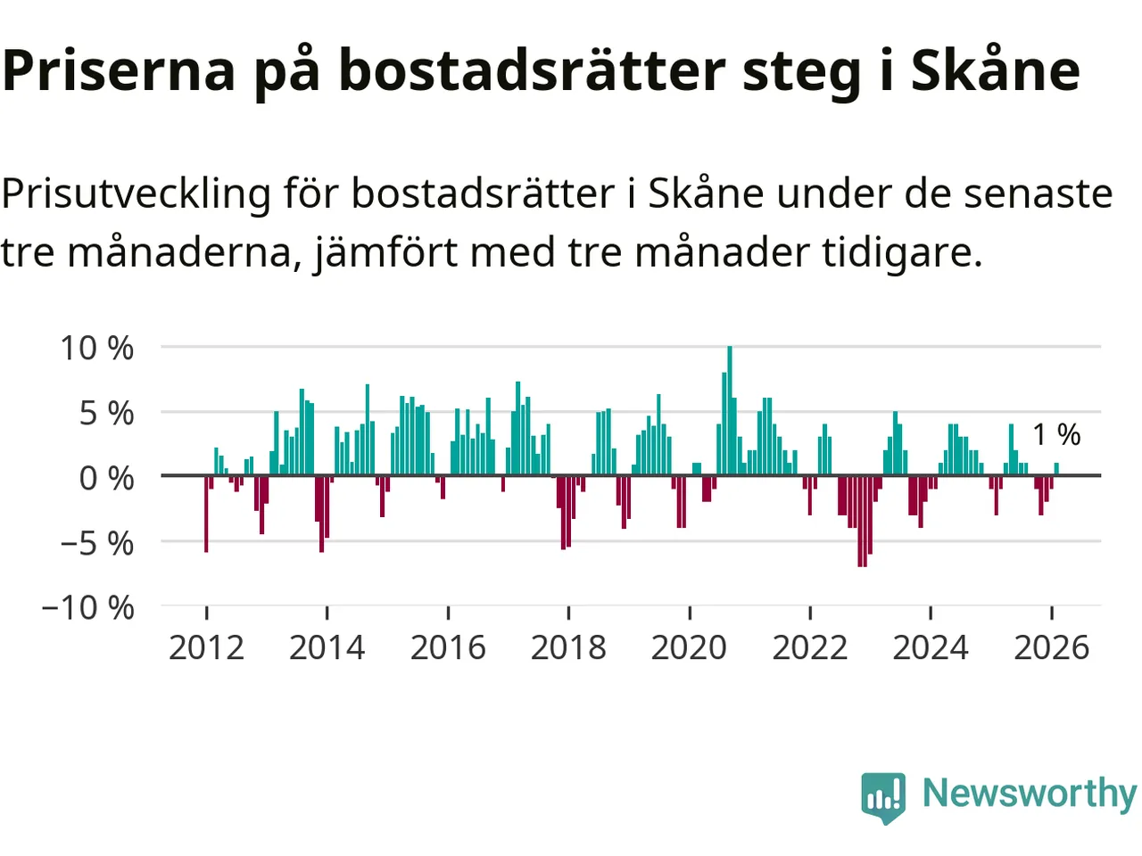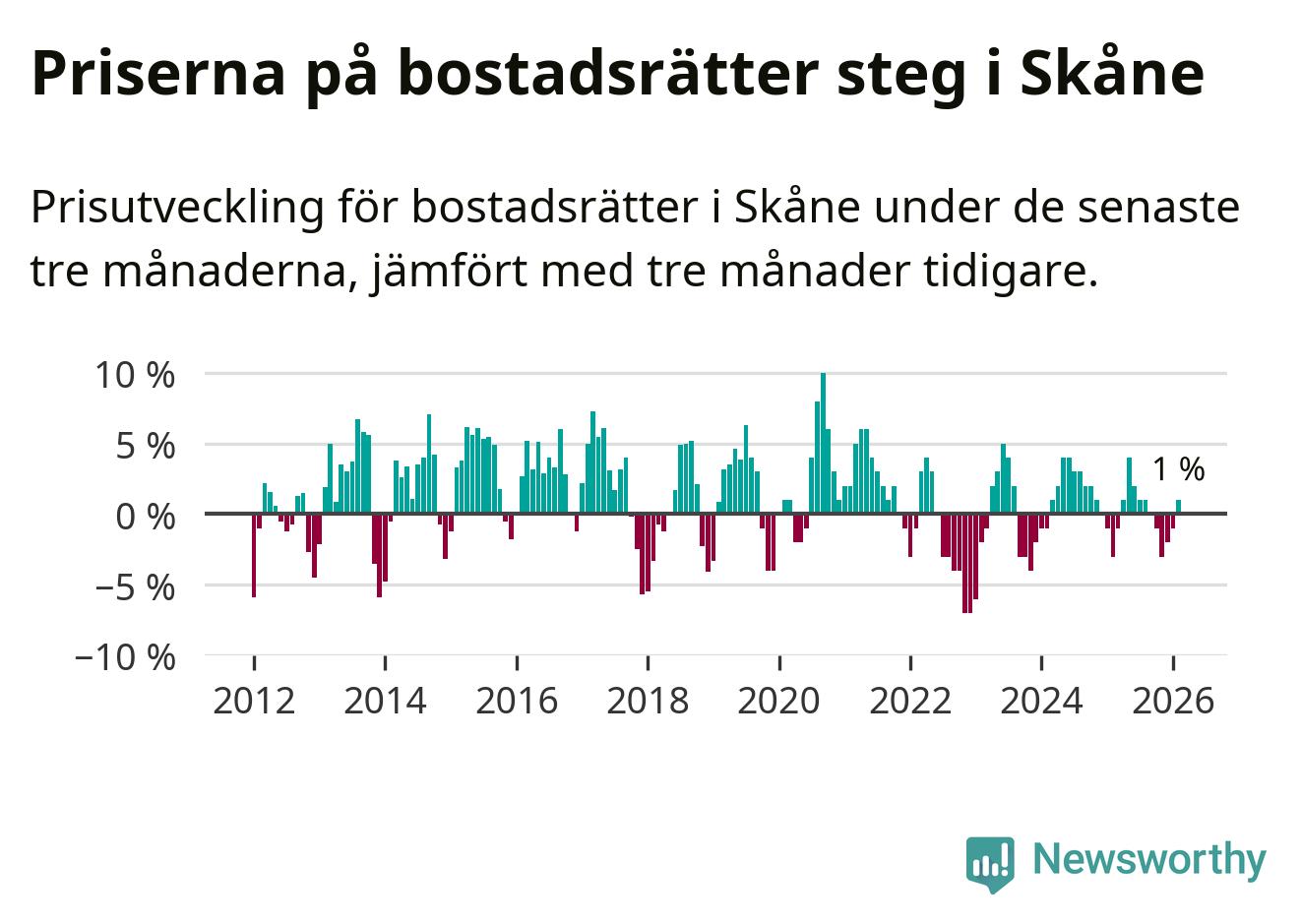 Priserna på bostadsrätter har gått upp i Skåne län. Medelpriset på försäljningarna under de senaste tre månaderna visar på en uppgång med 1 procent.