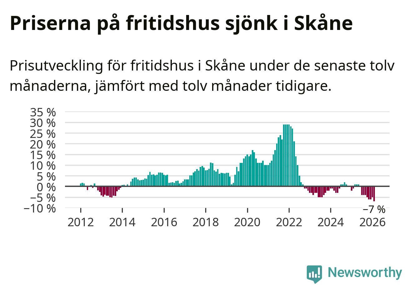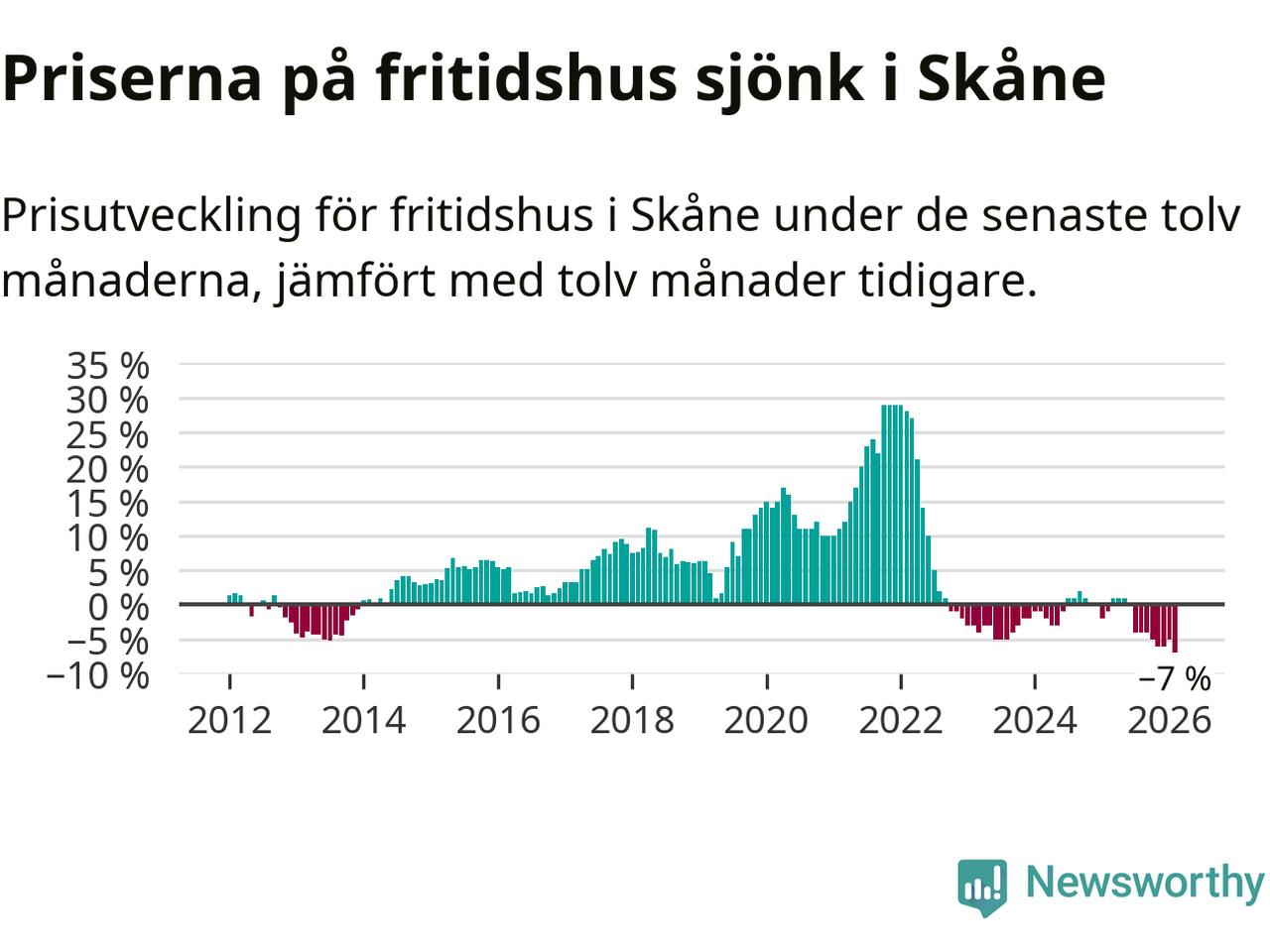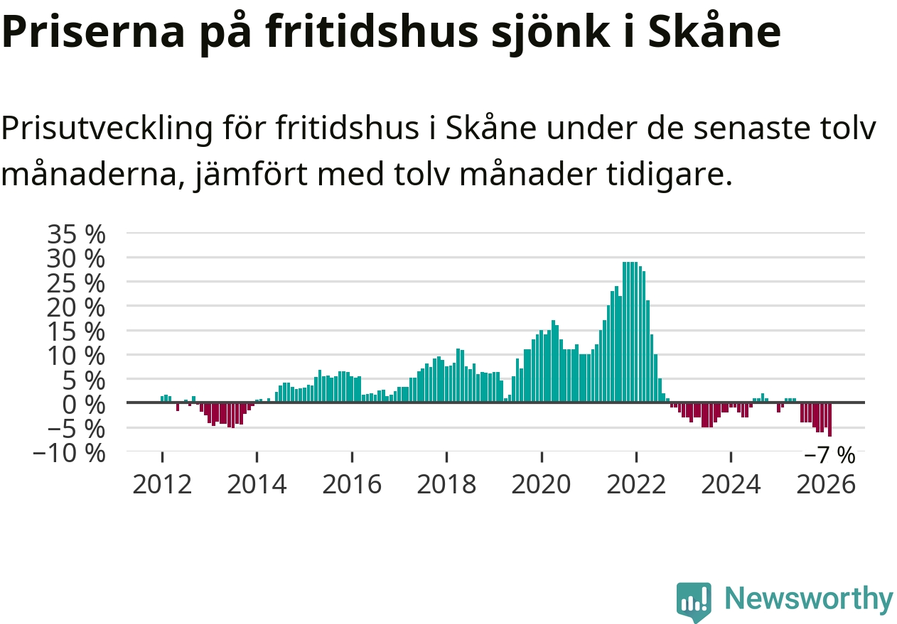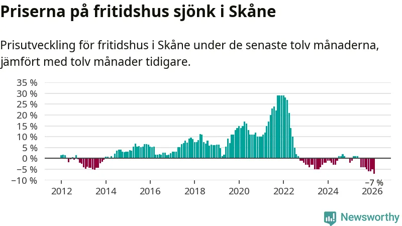 Priserna på fritidshus sjönk med sju procent i Skåne län under de senaste tolv månaderna. Det är den svagaste prisutvecklingen sedan 2012.