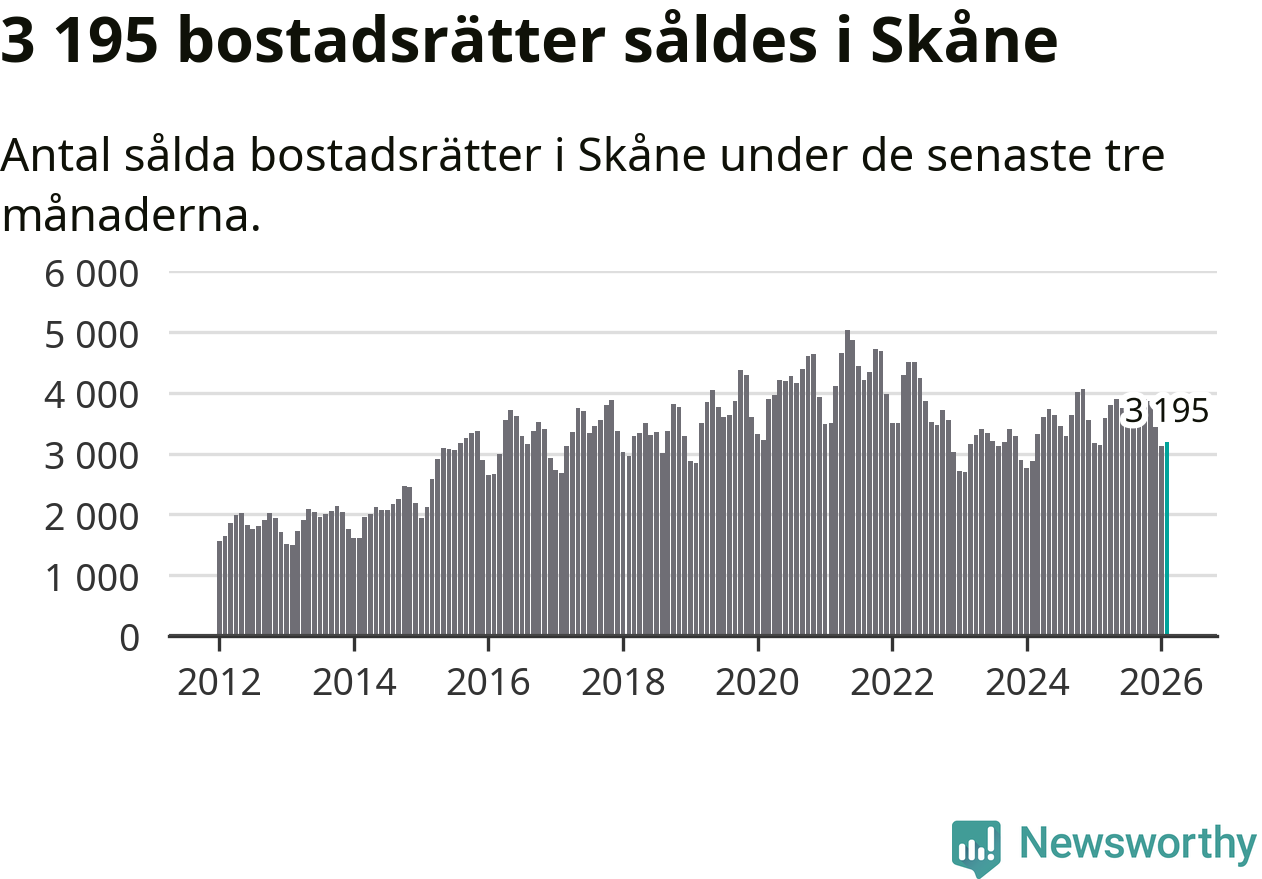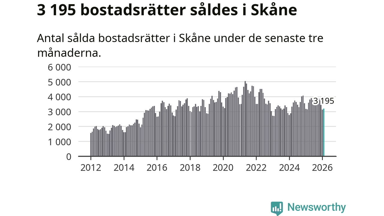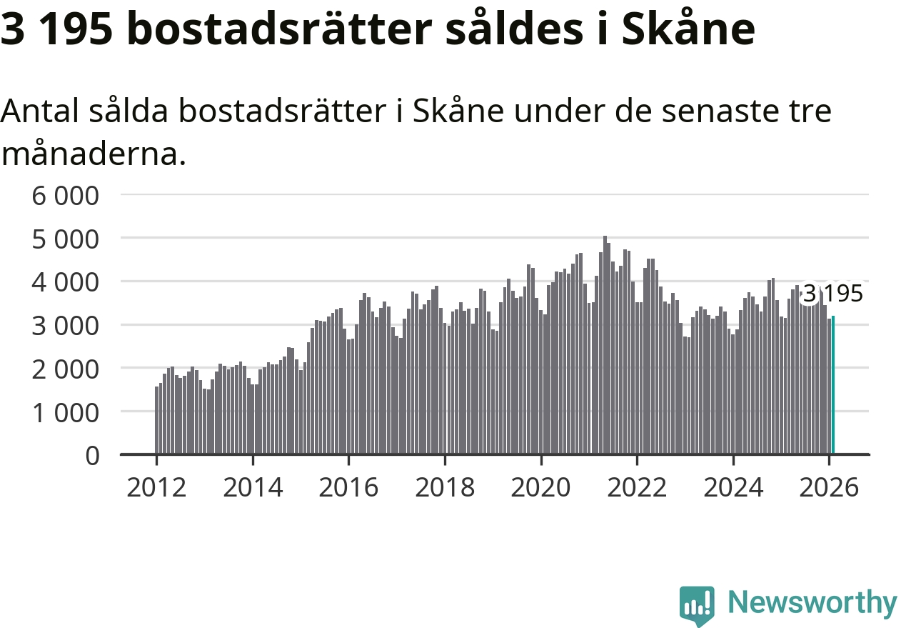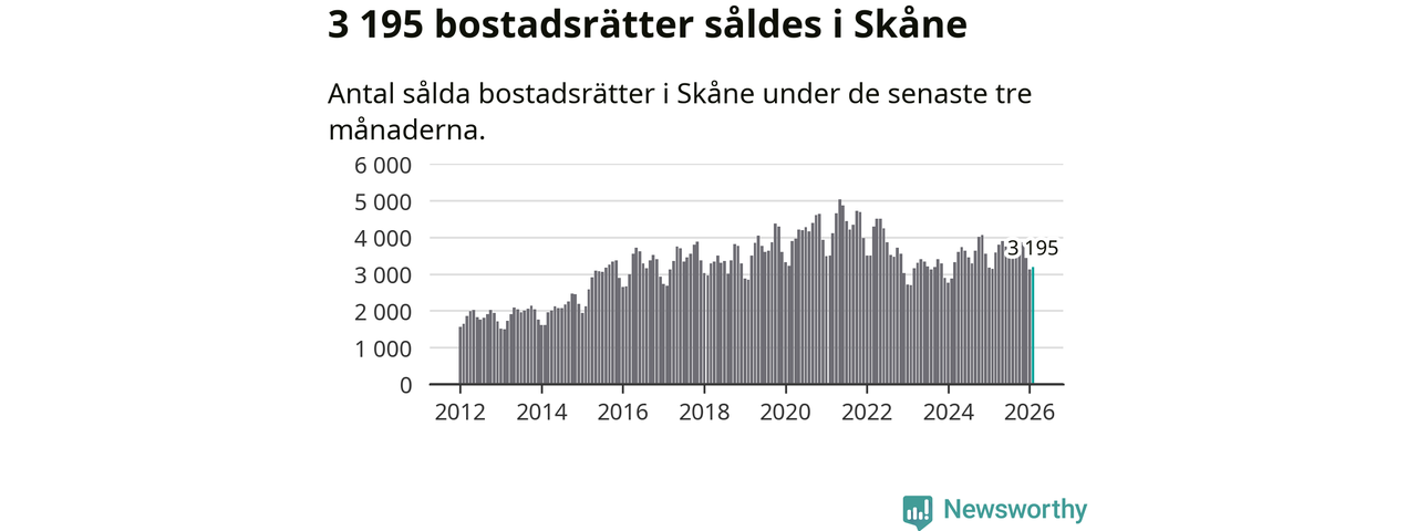 Sammanlagt såldes 3 195 bostadsrätter i Skåne län mellan december och februari till ett genomsnittligt pris på 2,3 miljoner kronor. I fjol gjordes 3 147 affärer vid den här tiden på året.