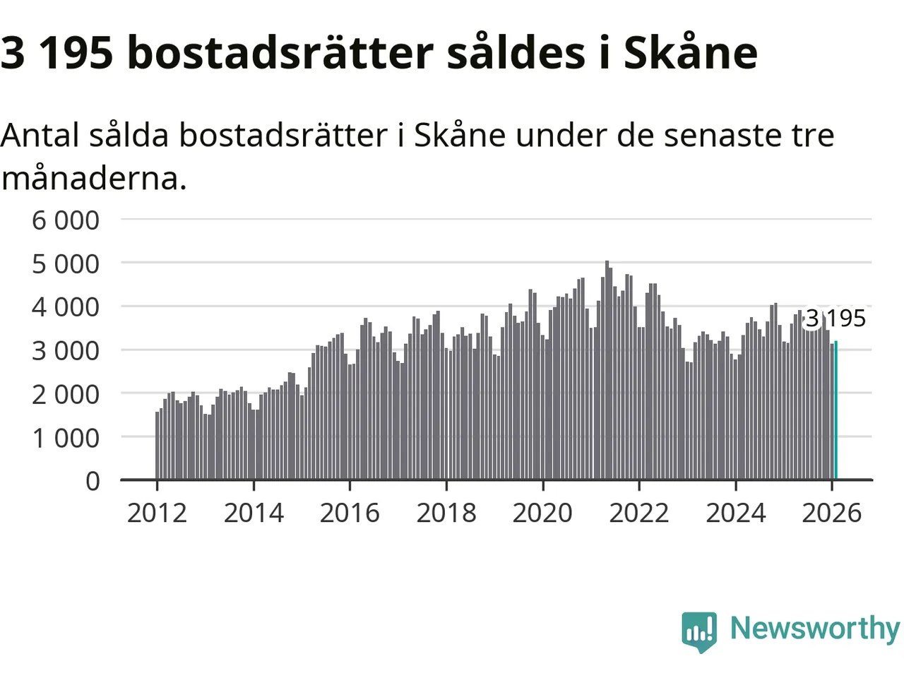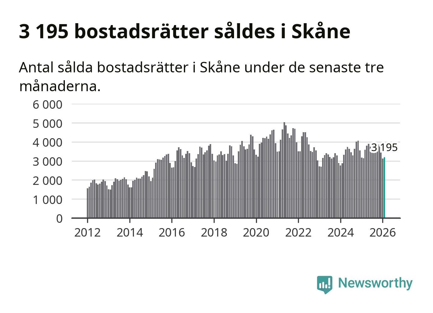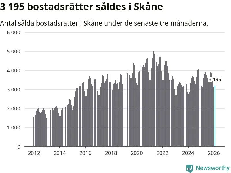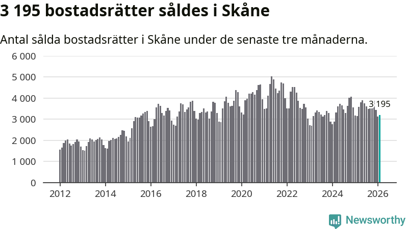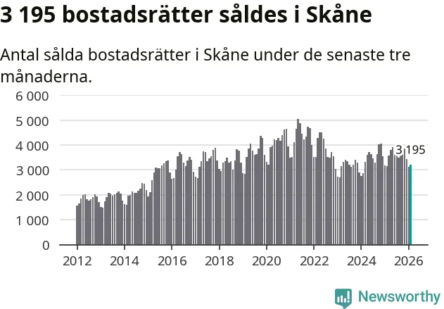 Sammanlagt såldes 3 195 bostadsrätter i Skåne län mellan december och februari till ett genomsnittligt pris på 2,3 miljoner kronor. I fjol gjordes 3 147 affärer vid den här tiden på året.