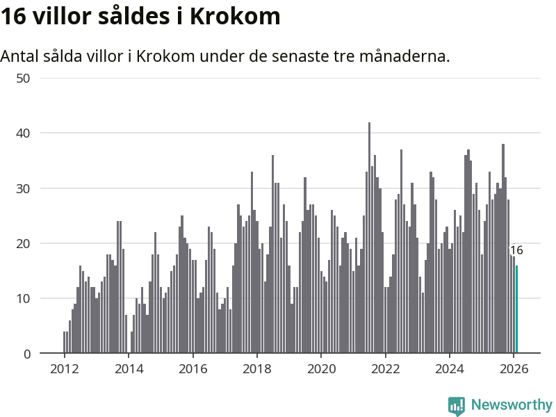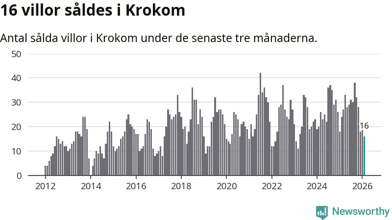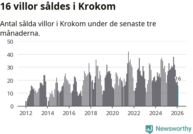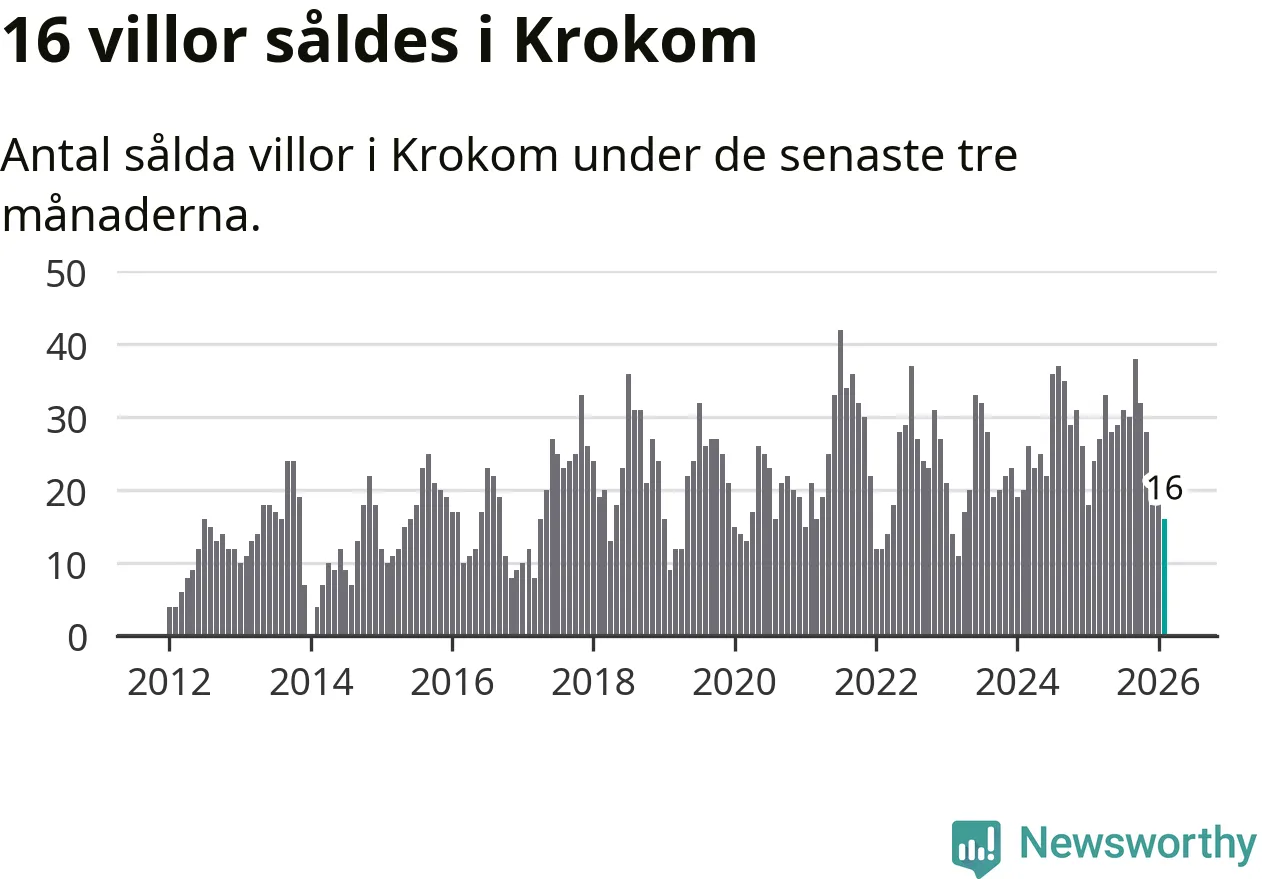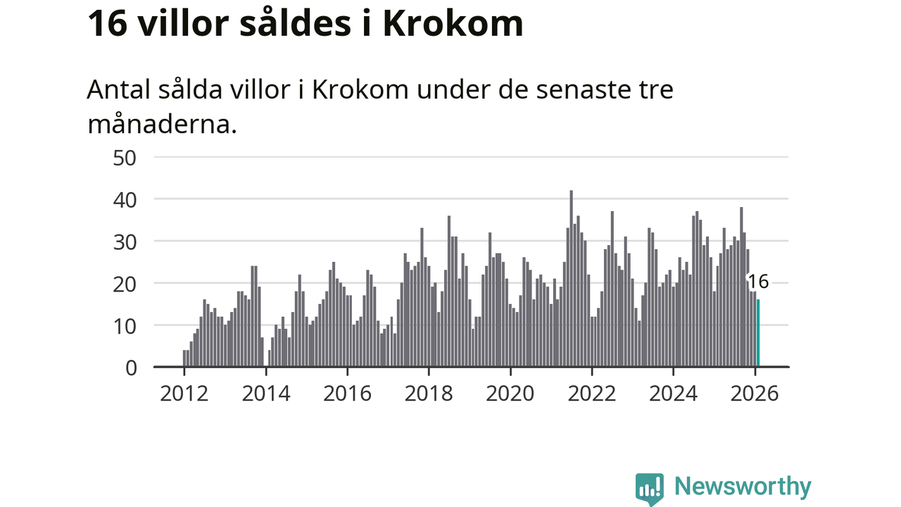 Mellan december och februari gjordes sammanlagt 16 affärer med villor i Krokoms kommun. Det kan jämföras med 24 vid motsvarande tid i fjol.