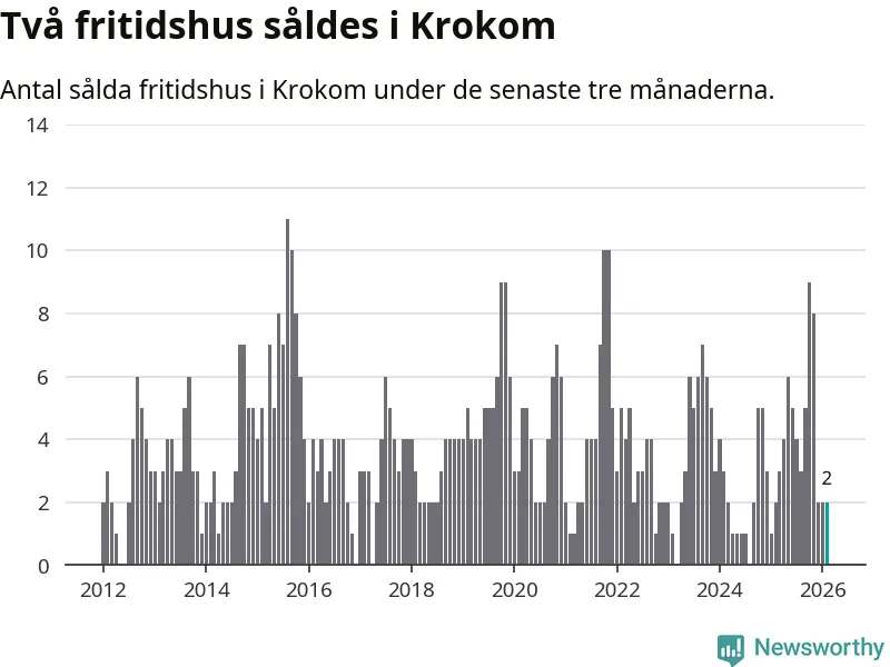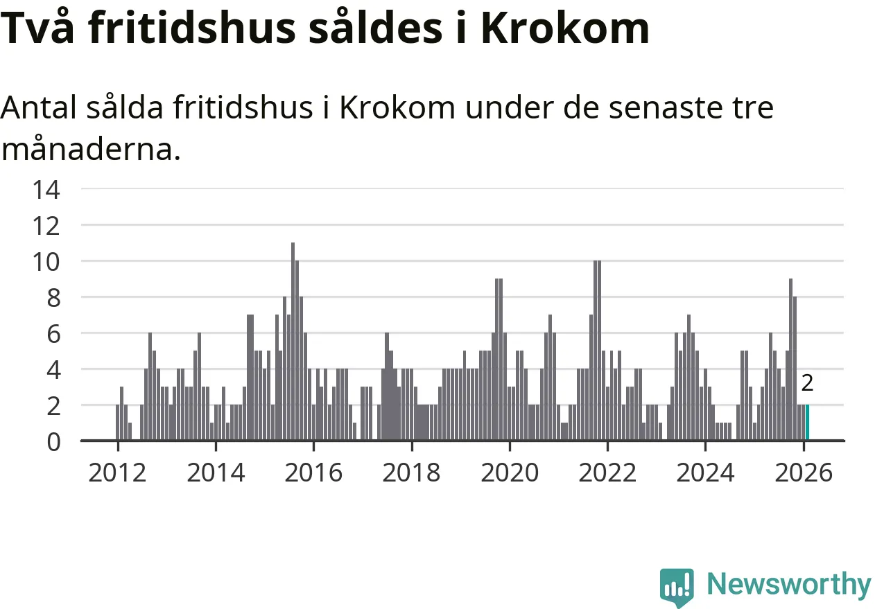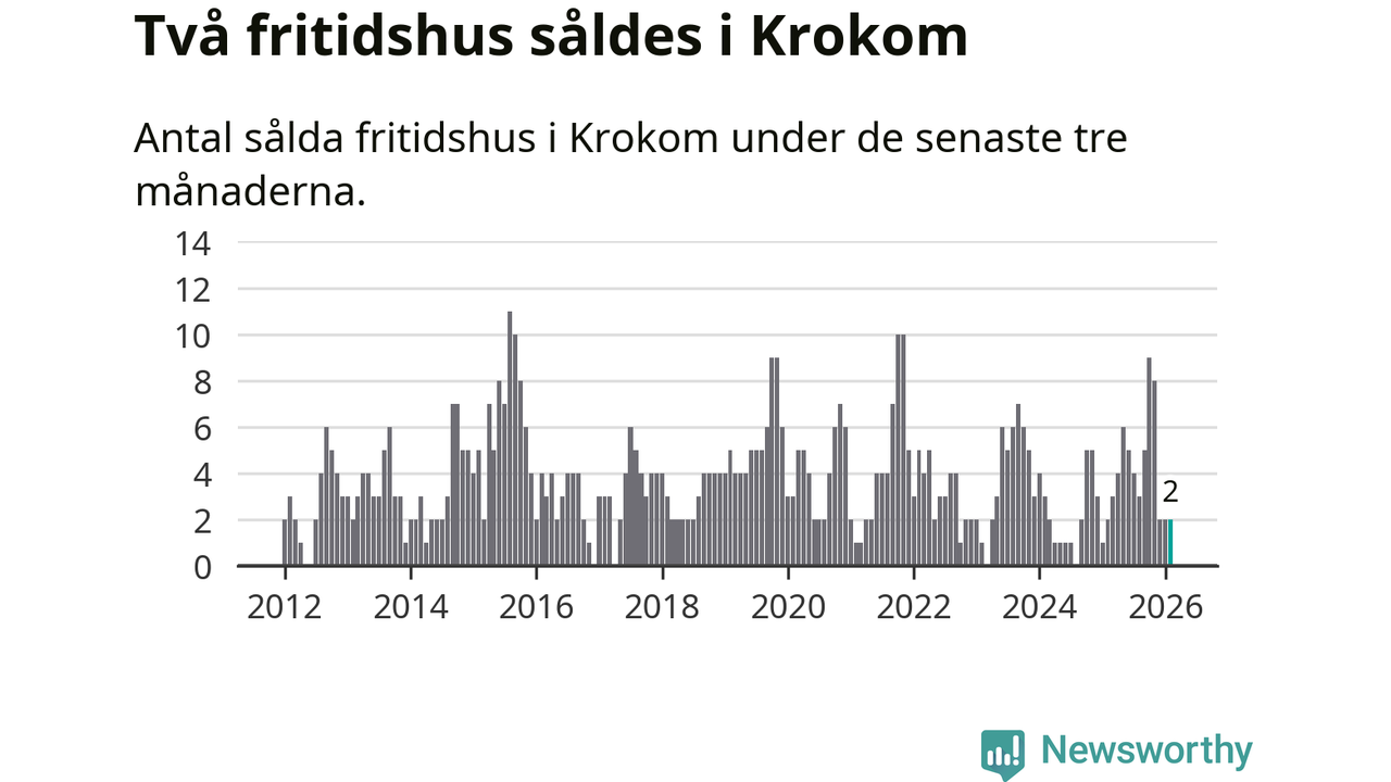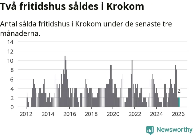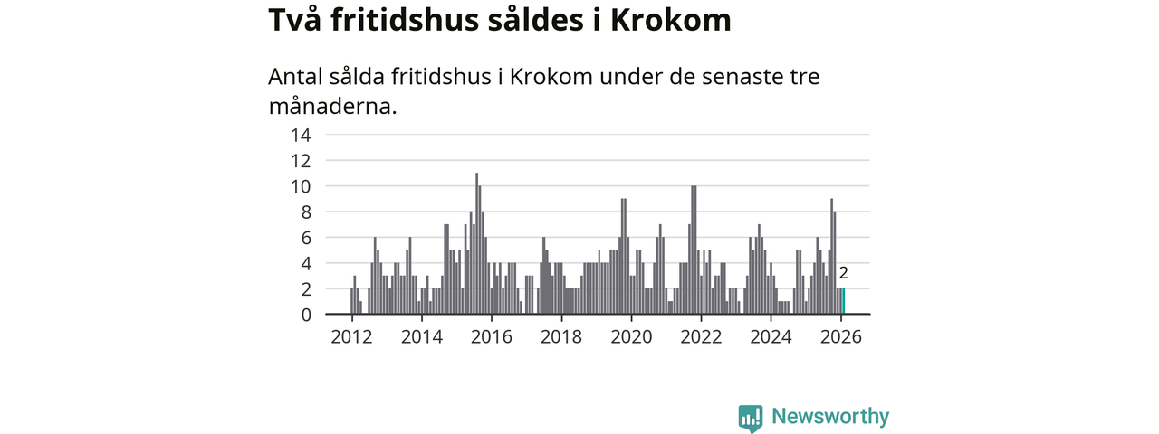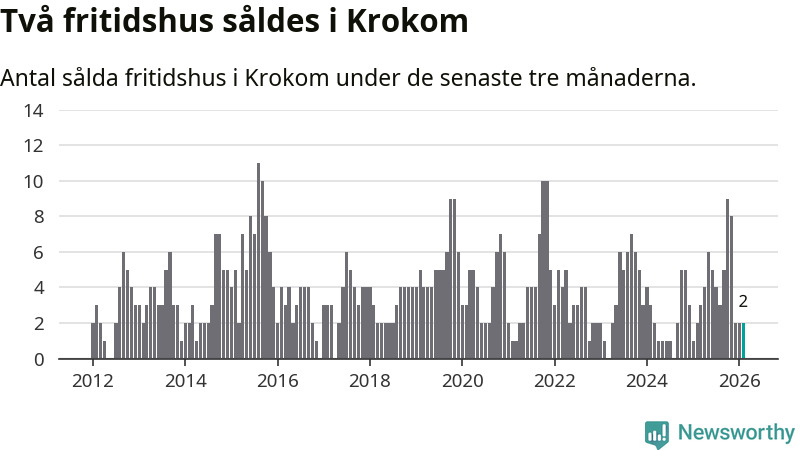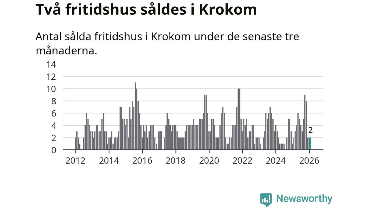 Mellan december och februari gjordes sammanlagt två affärer med fritidshus i Krokoms kommun. Det är lika många affärer som vid motsvarande tid i fjol.
