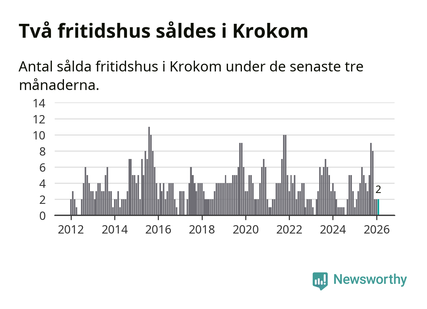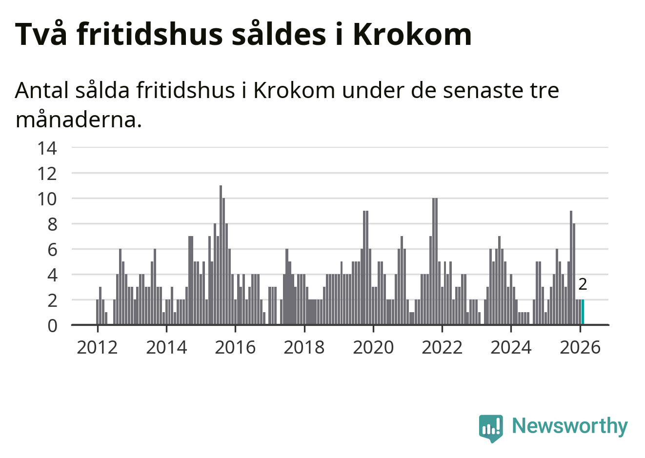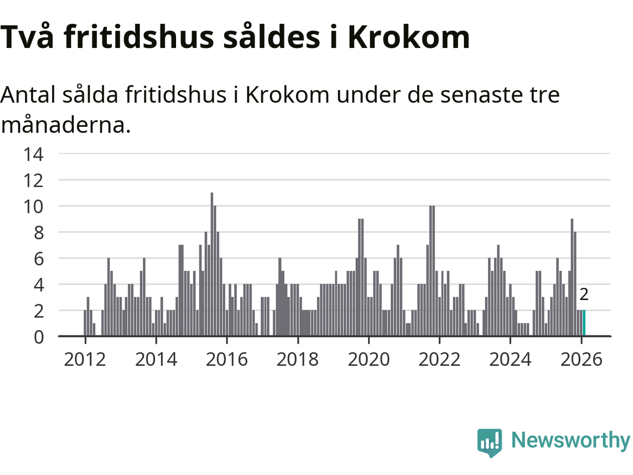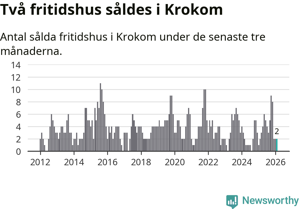 Mellan december och februari gjordes sammanlagt två affärer med fritidshus i Krokoms kommun. Det är lika många affärer som vid motsvarande tid i fjol.
