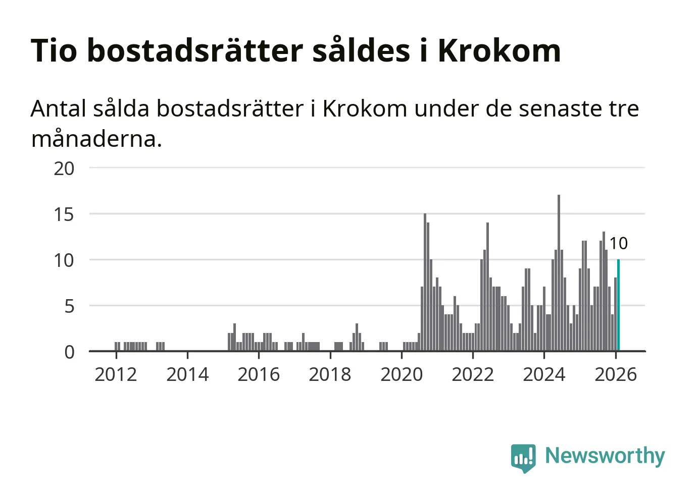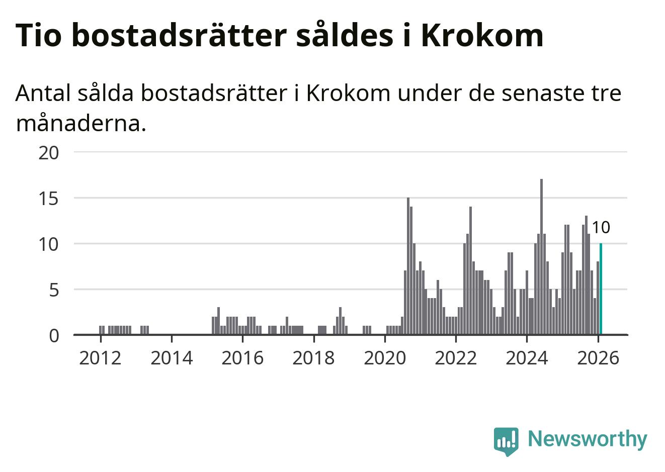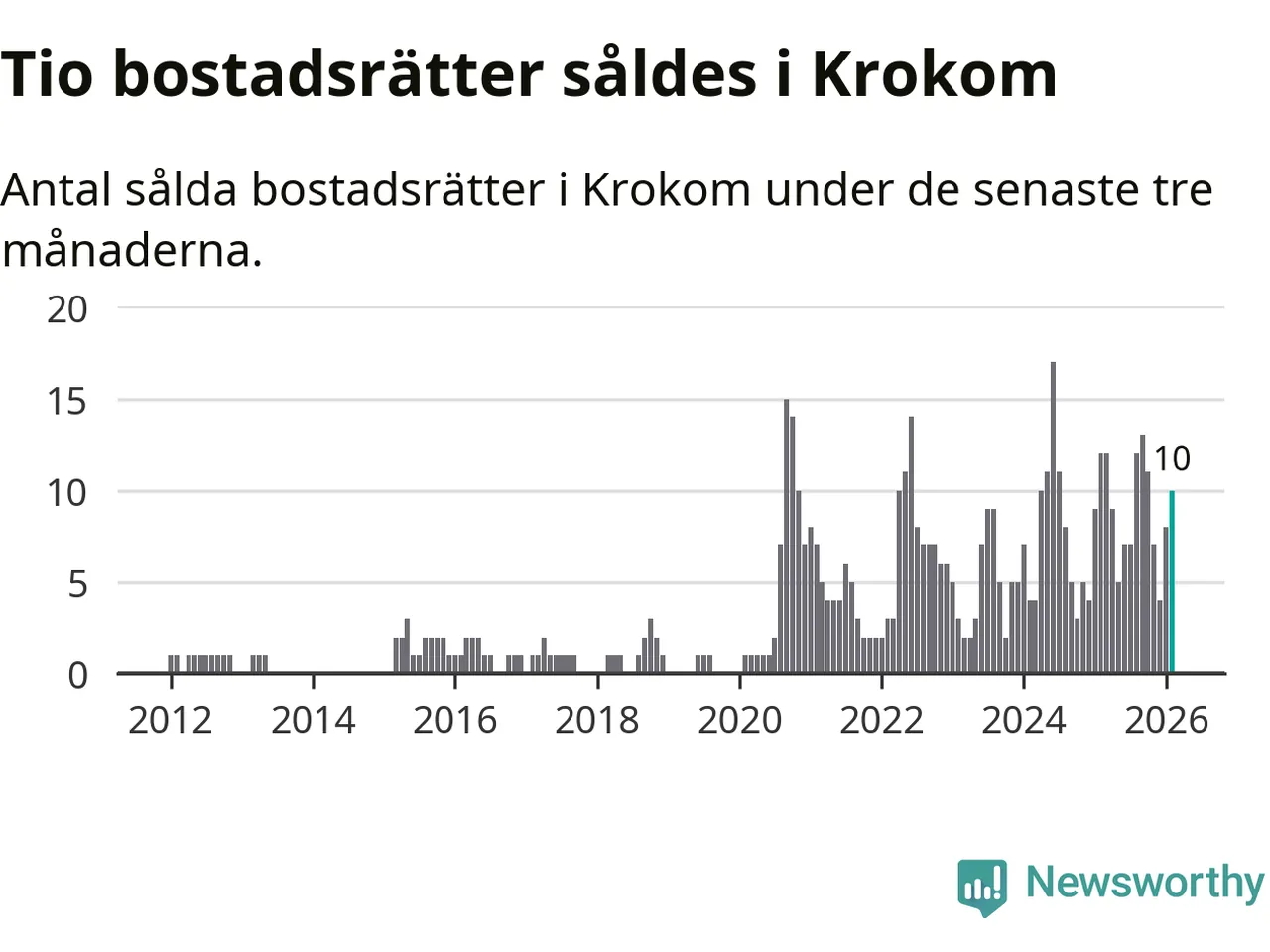 Mellan december och februari gjordes sammanlagt tio affärer med bostadsrätter i Krokoms kommun. Det kan jämföras med tolv vid motsvarande tid i fjol.