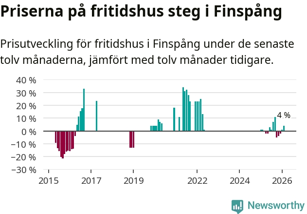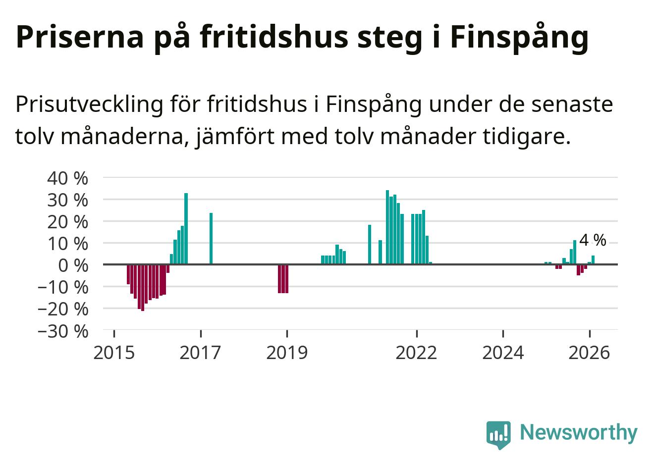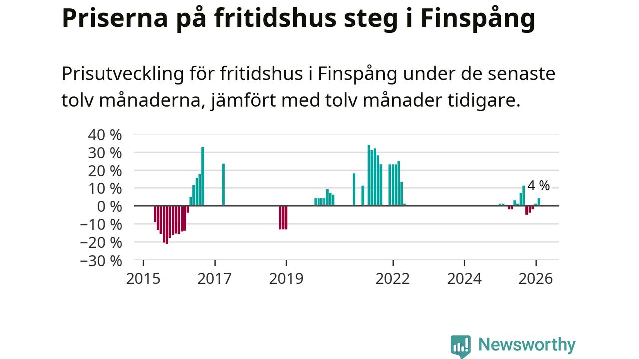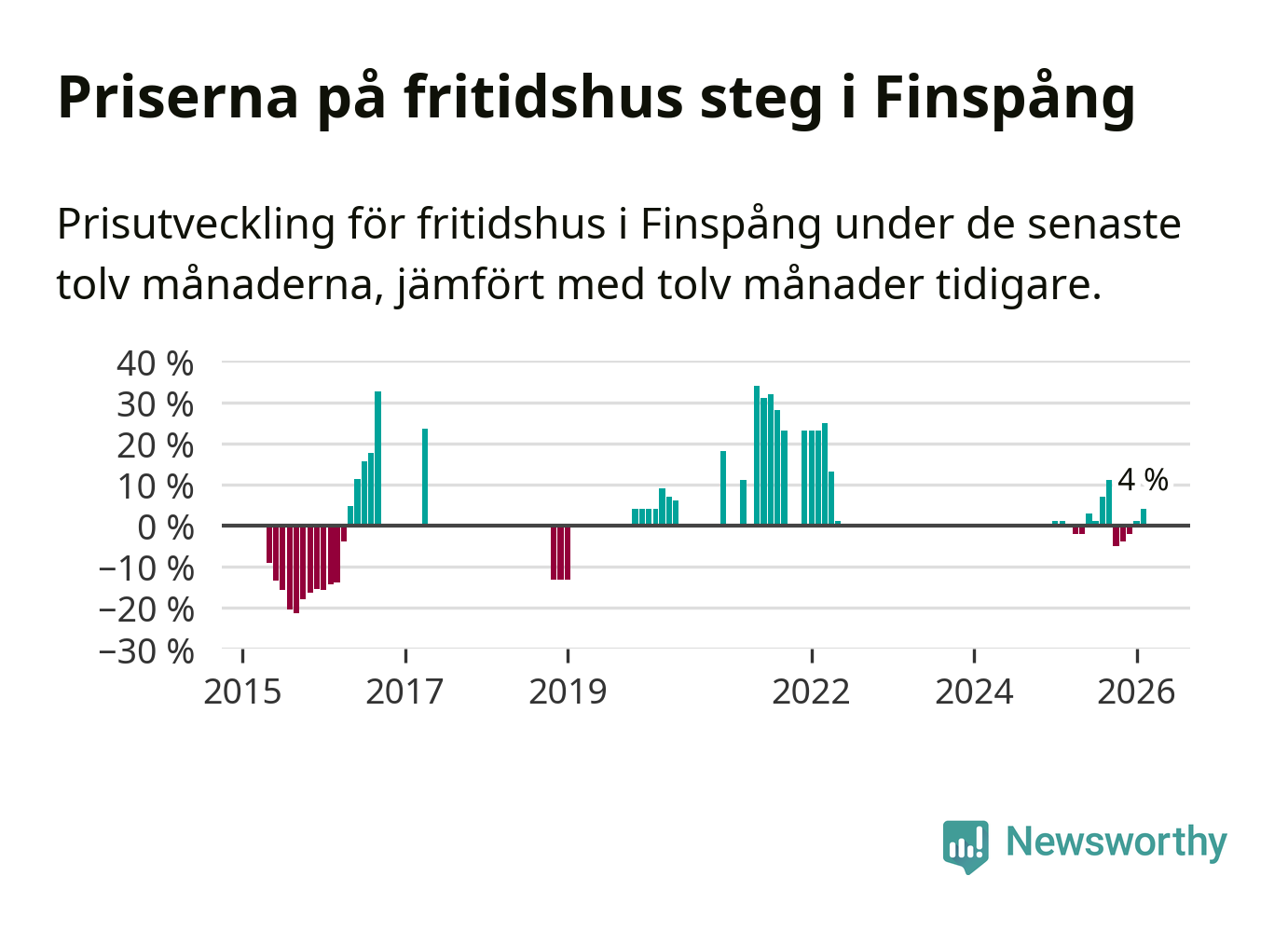 Statistiken visar även på en kännbar prisuppgång i Finspångs kommun. Medelpriset på försäljningarna av fritidshus i kommunen var 4 procent högre än för ett år sedan. I hela Östergötland däremot sjunker priserna på fritidshus. I hela länet noterades en prisnedgång på 2 procent.