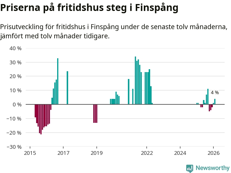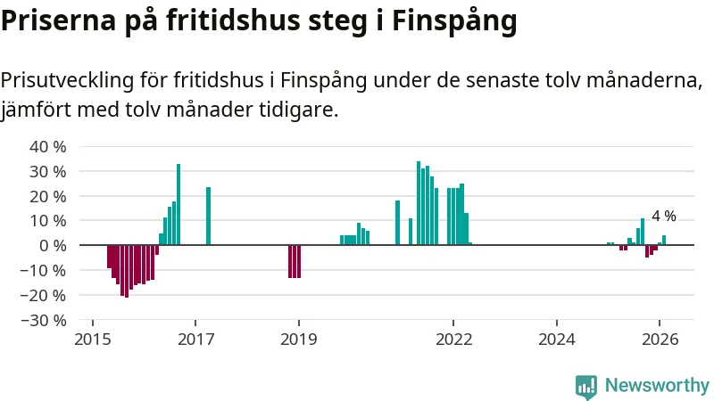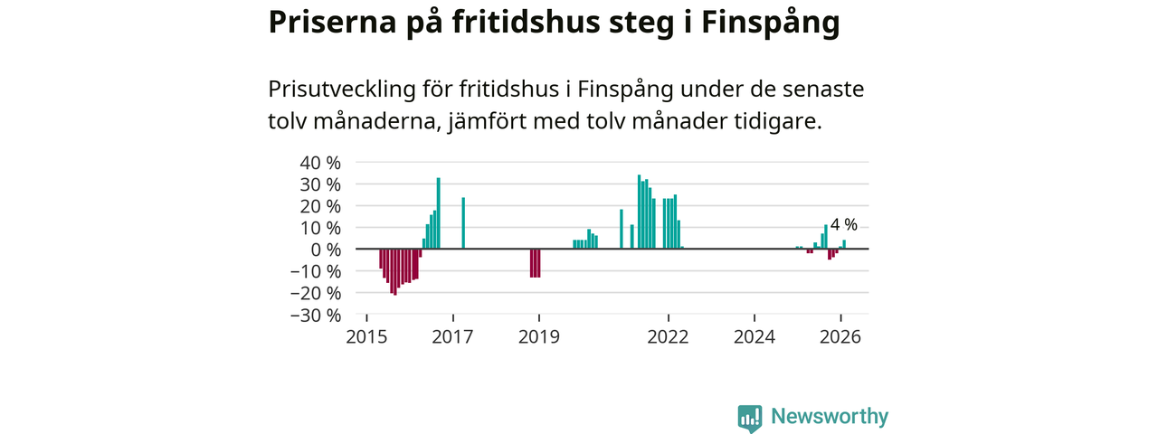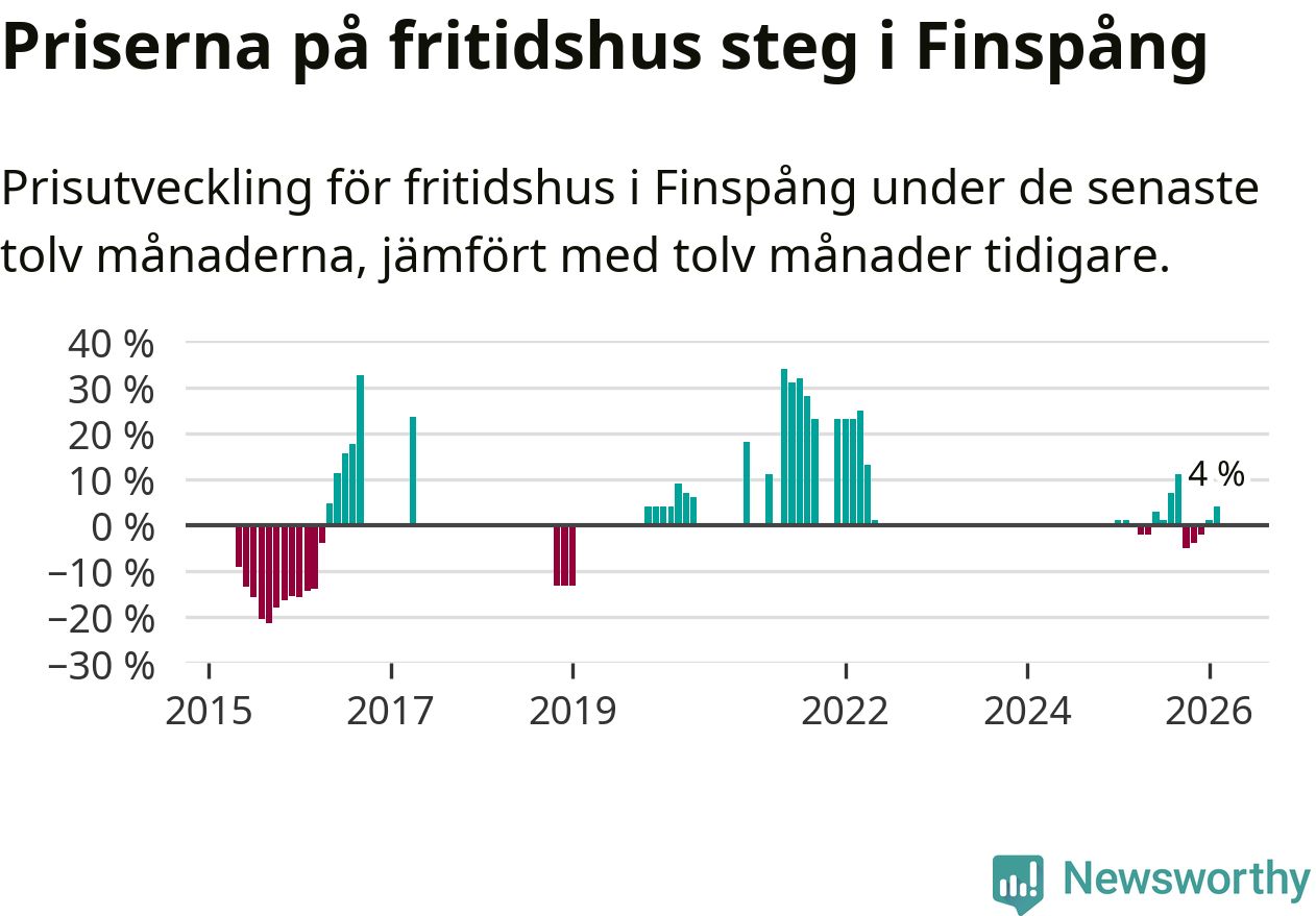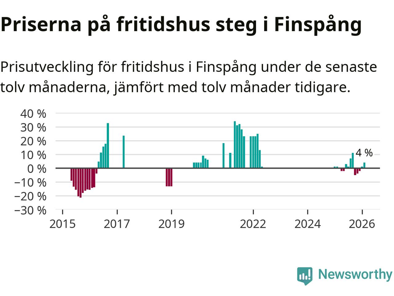 Statistiken visar även på en kännbar prisuppgång i Finspångs kommun. Medelpriset på försäljningarna av fritidshus i kommunen var 4 procent högre än för ett år sedan. I hela Östergötland däremot sjunker priserna på fritidshus. I hela länet noterades en prisnedgång på 2 procent.