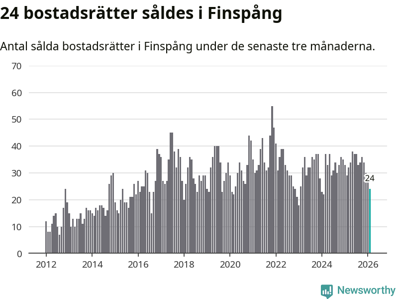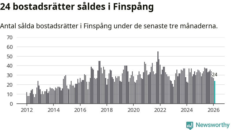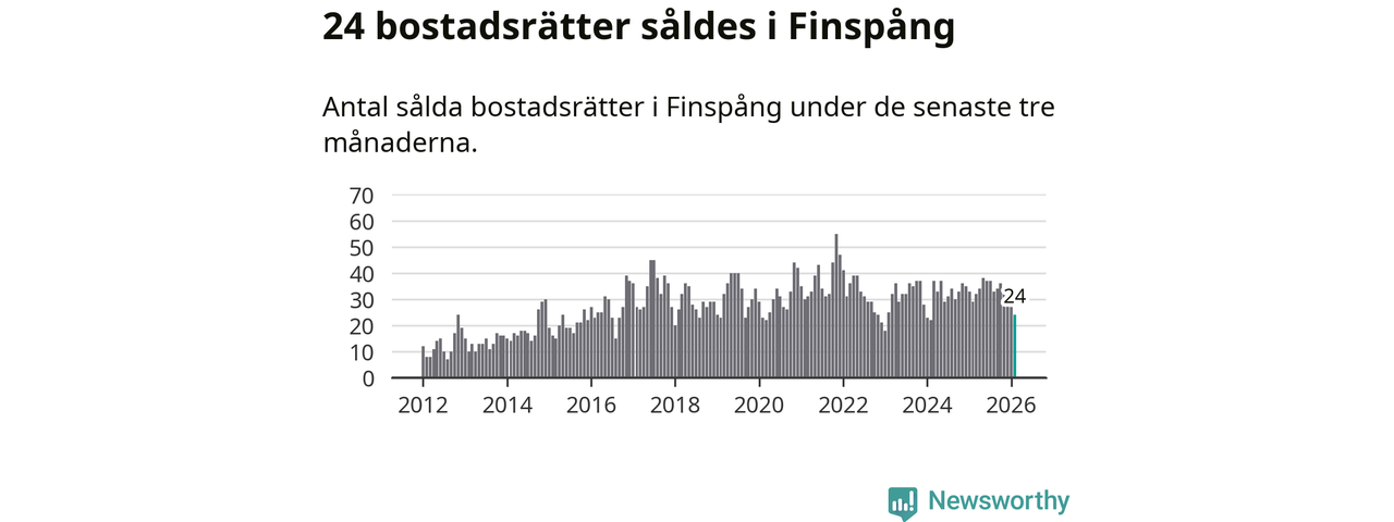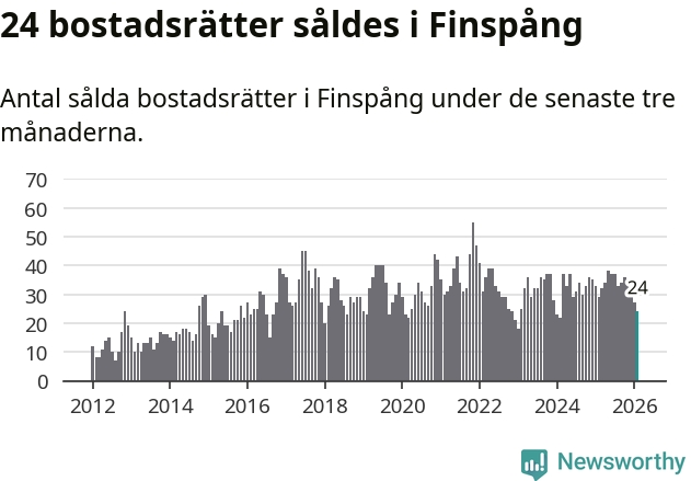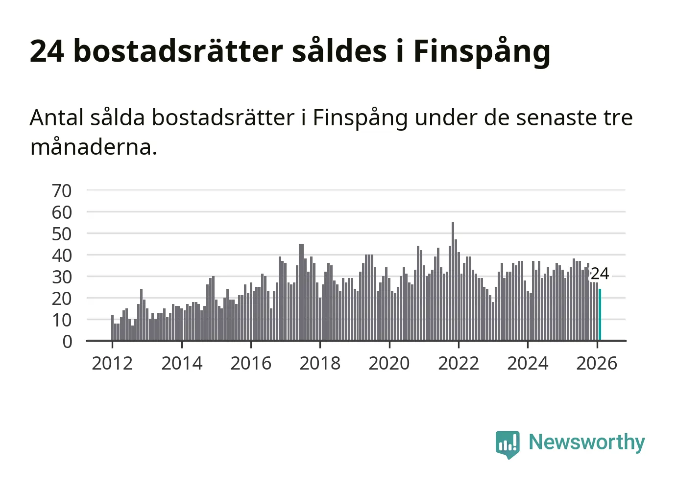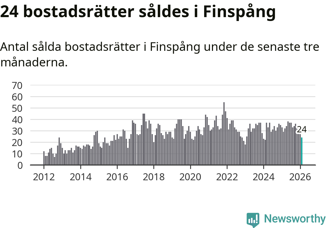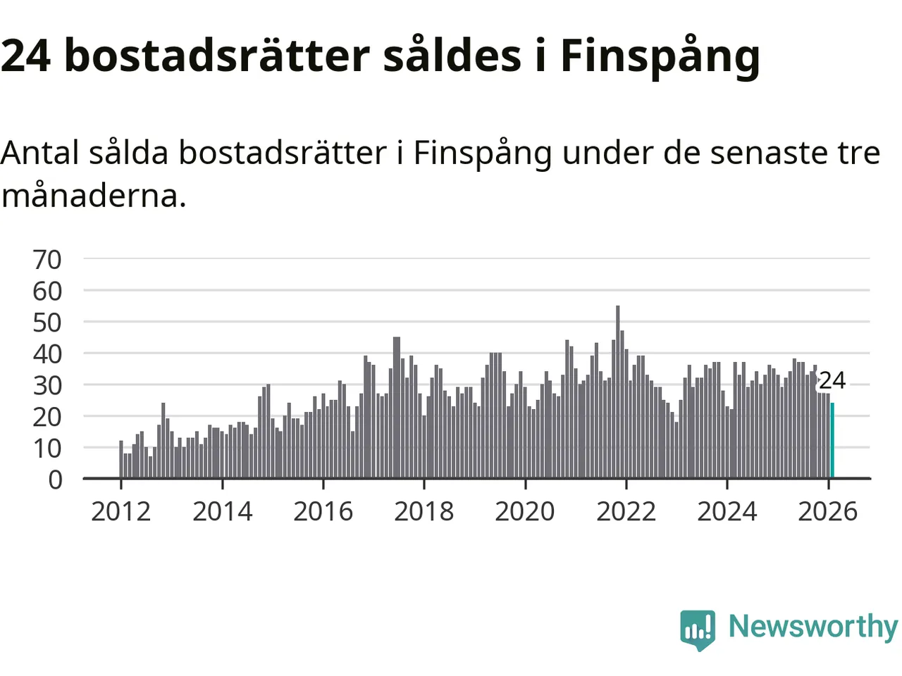 Mellan december och februari gjordes sammanlagt 24 affärer med bostadsrätter i Finspångs kommun. Det kan jämföras med 29 vid motsvarande tid i fjol.