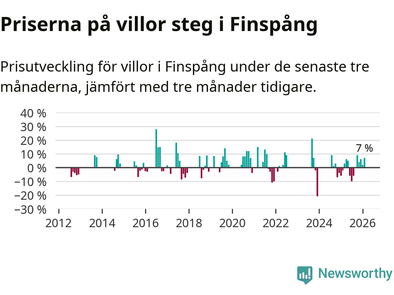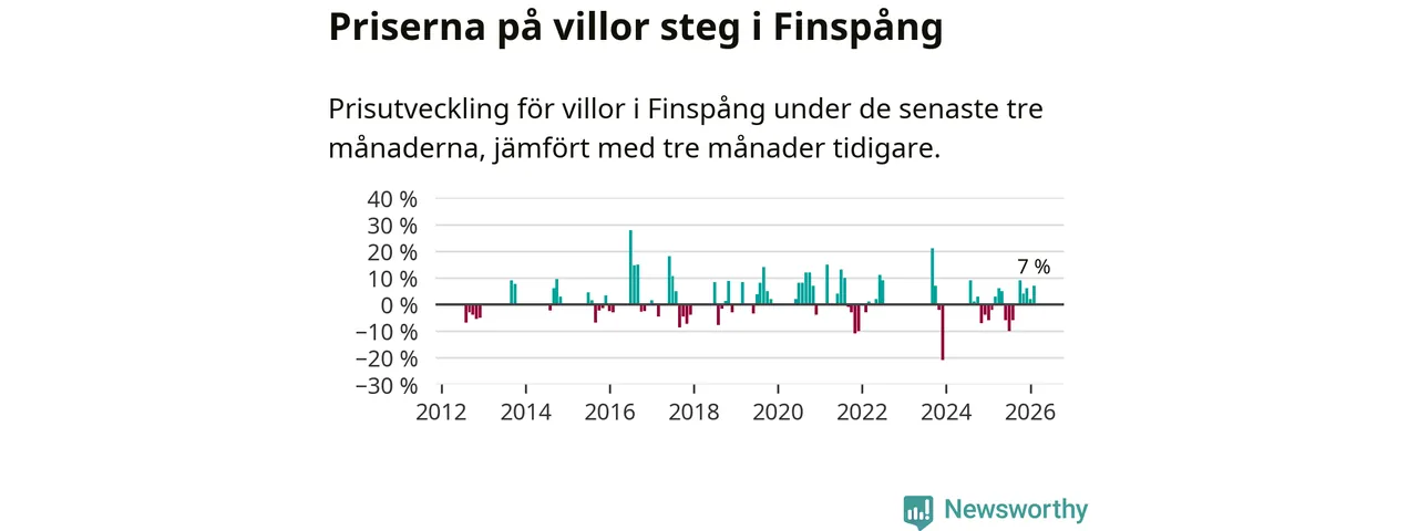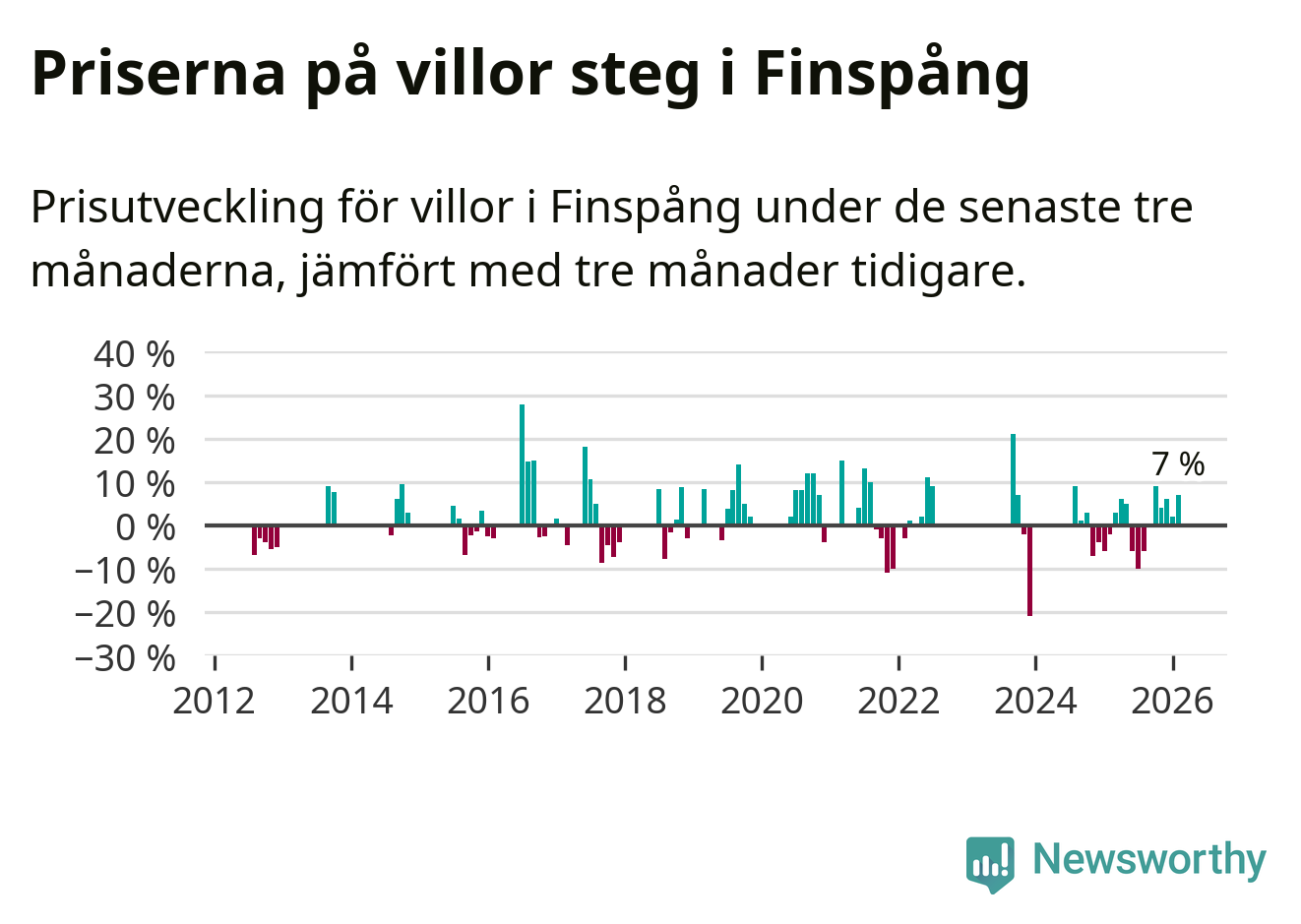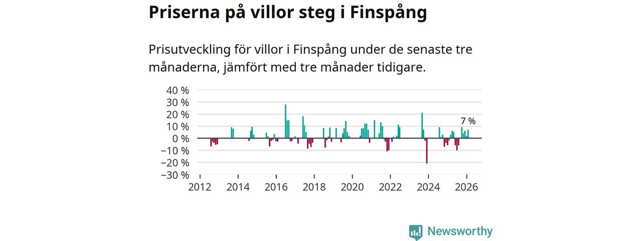 Statistiken visar även på en kännbar prisuppgång i Finspångs kommun. Medelpriset på försäljningarna av villor i kommunen var 7 procent högre än för tre månader sedan. I hela Östergötland däremot ligger villapriserna stilla.