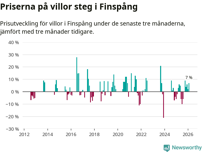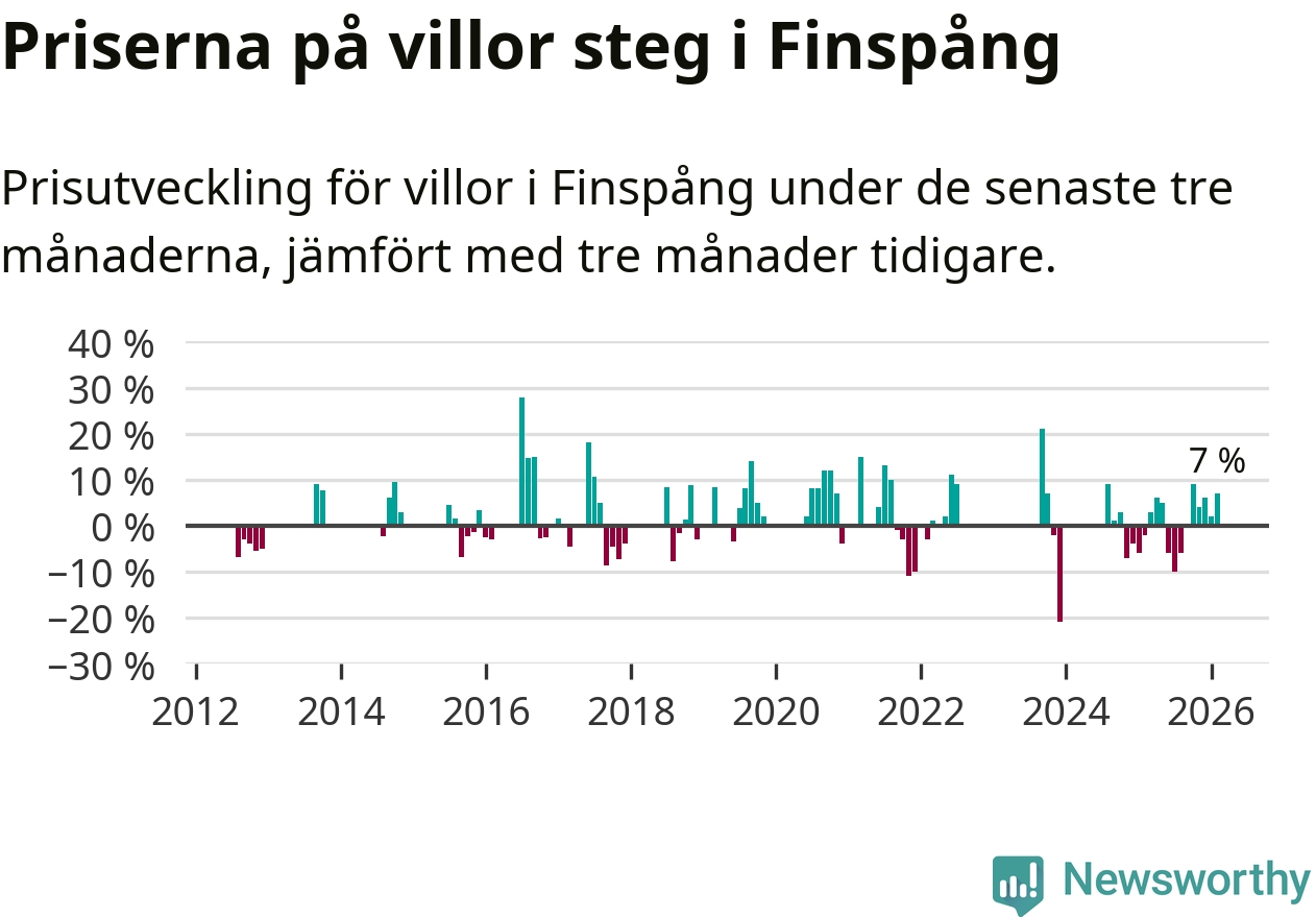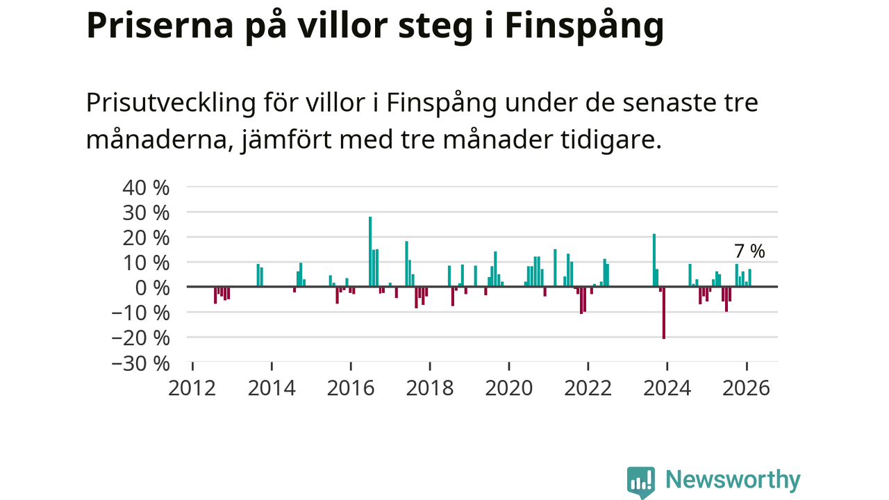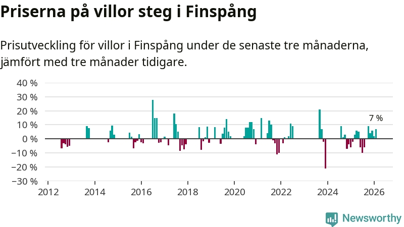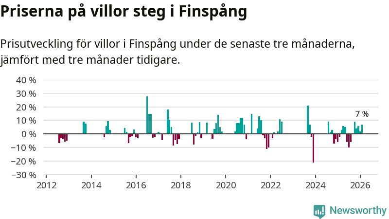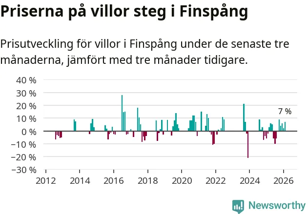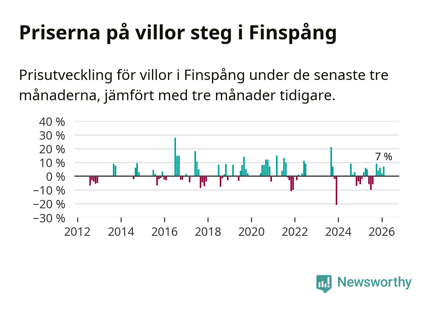 Statistiken visar även på en kännbar prisuppgång i Finspångs kommun. Medelpriset på försäljningarna av villor i kommunen var 7 procent högre än för tre månader sedan. I hela Östergötland däremot ligger villapriserna stilla.
