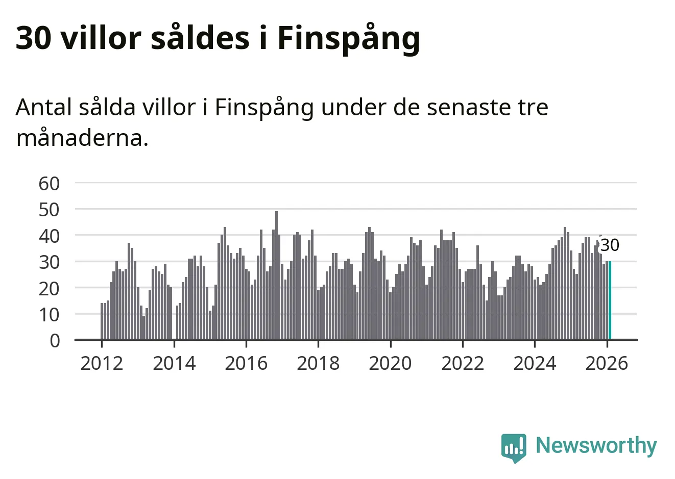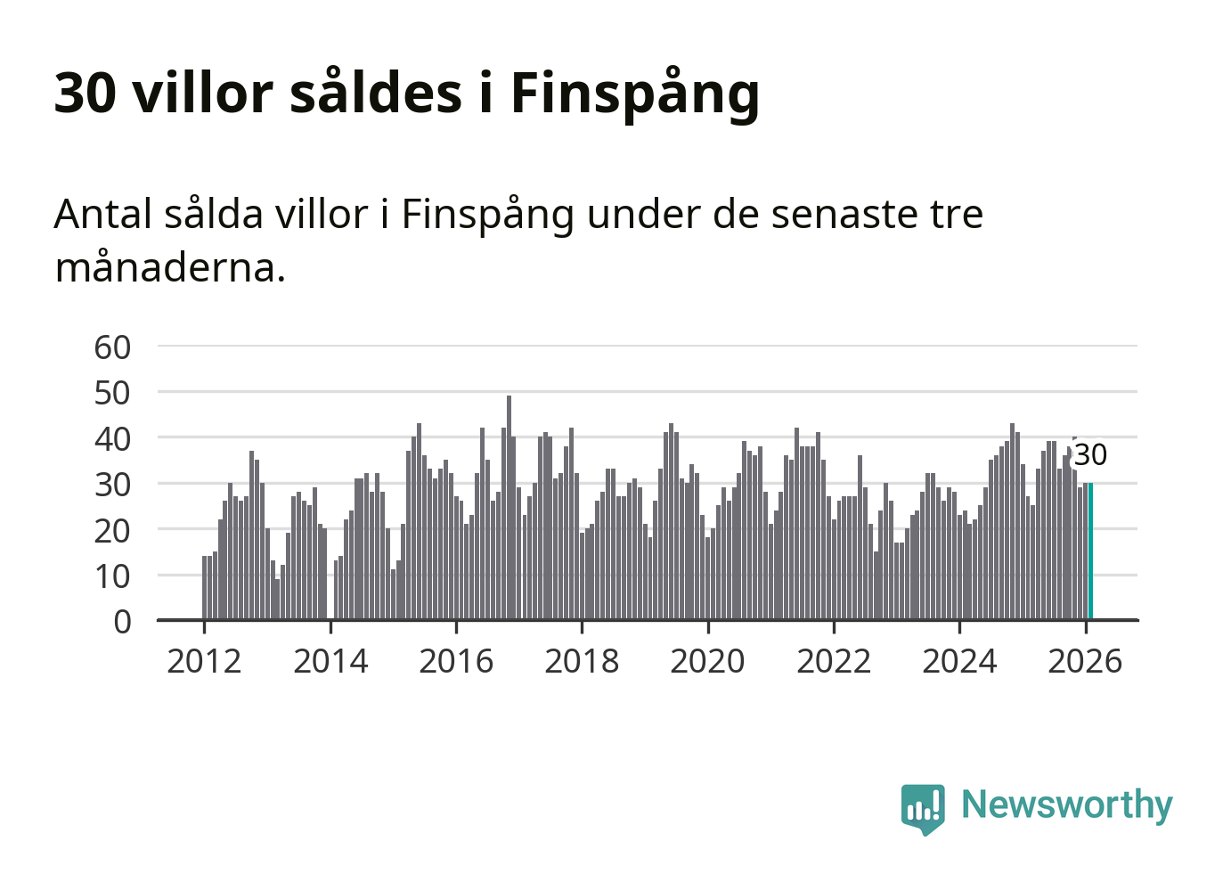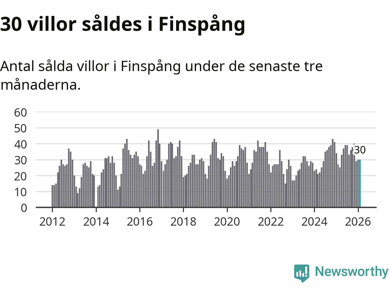 Mellan december och februari gjordes sammanlagt 30 affärer med villor i Finspångs kommun. Det kan jämföras med 27 vid motsvarande tid i fjol.