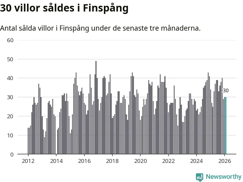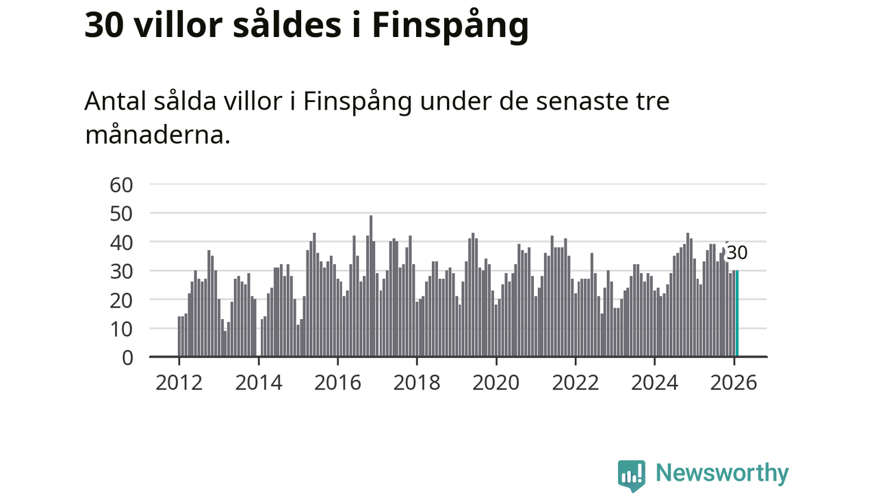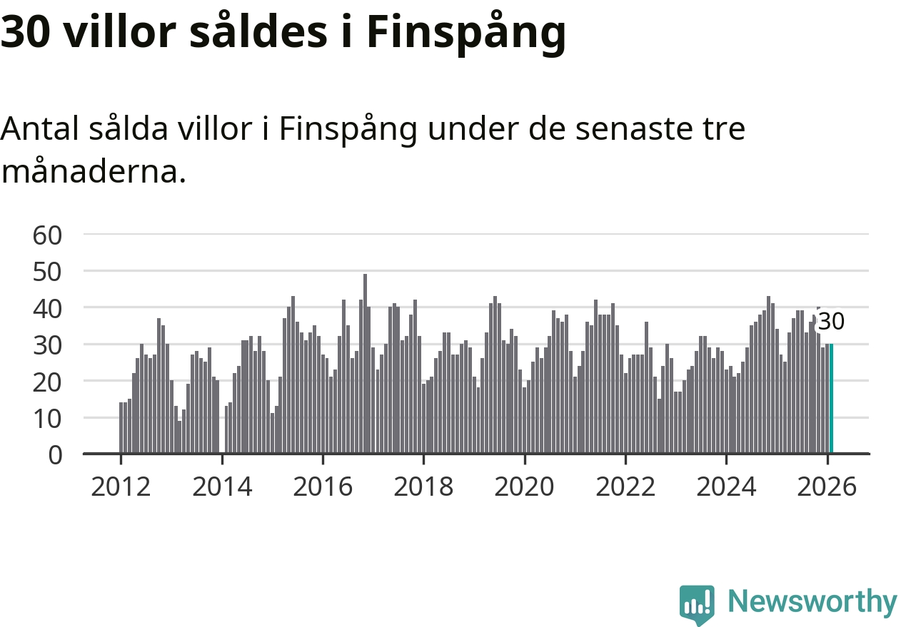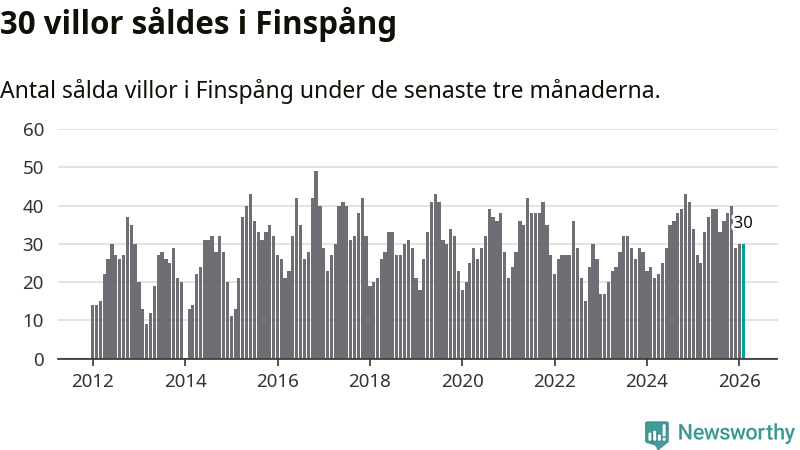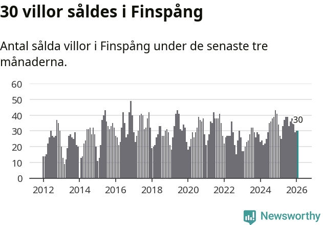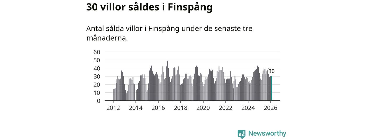 Mellan december och februari gjordes sammanlagt 30 affärer med villor i Finspångs kommun. Det kan jämföras med 27 vid motsvarande tid i fjol.